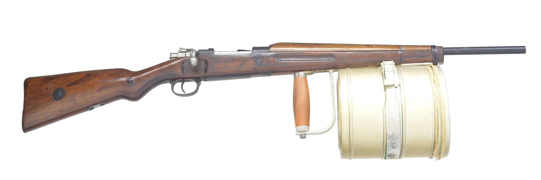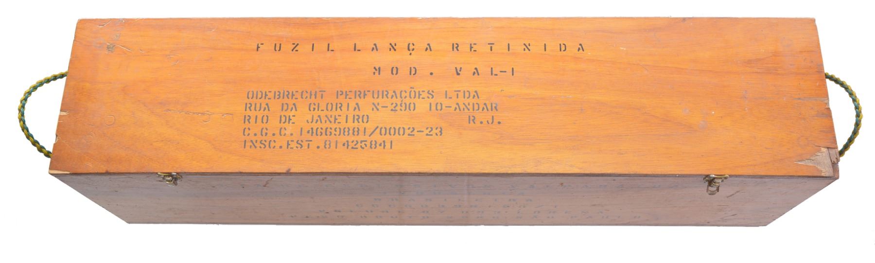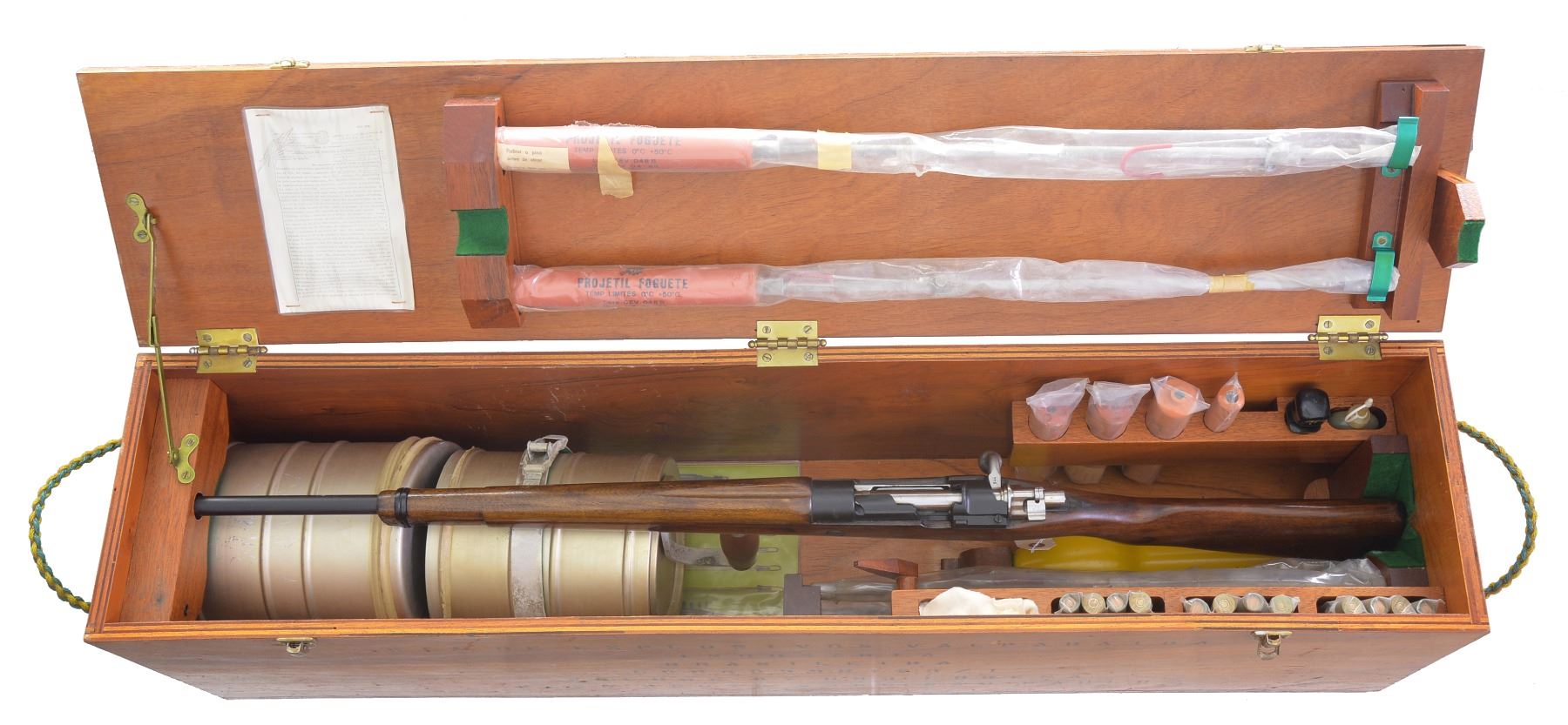 Cal. 28 Ga. S# 644. Bbl. 21" smooth bore. Numbers match on bolt & receiver. Line launching gun w/ chest, line canisters, inert weighted projectiles & 12 cal., 28 Ga. line throwing blanks. Line gun is converted from Mauser bolt action rifle. Receiver now marked on top w/ Imbel logo & "FABRICA DE ITAJUBA" & "CAL. 28". Mag. has been converted to hold 4 - 28 Ga. Blanks. Left receiver wall has added sheet metal cartridge guide. Turned down bolt handle. Mauser type safety is inoperable. Hardwood stock & handguard has inletting for sling swivels filled. Stock & handguard cutoff approx. 3" above lower band & has added band which retains forward hand grip & line canisters. UNATTACHED ACCESSORIES: nicely fitted plywood case w/ holders for parts & accessories. 2 Lg. canisters containing unknown amount of approx. 1/4" white nylon line. 7 Weighted projectiles: 4 rockets, 1 message, 1 Flexa, & 1 Bouy. 12 Blank 28 Ga. Shells dated 1989. Owner"s manual printed in Portuguese. Has inspection certificate stapled inside of case lid. CONDITION: throwing gun & accessories in very good condition. Bright shiny bore. Many accessories in original packaging. (20-911/RW). MODERN. $2,500-4,000.