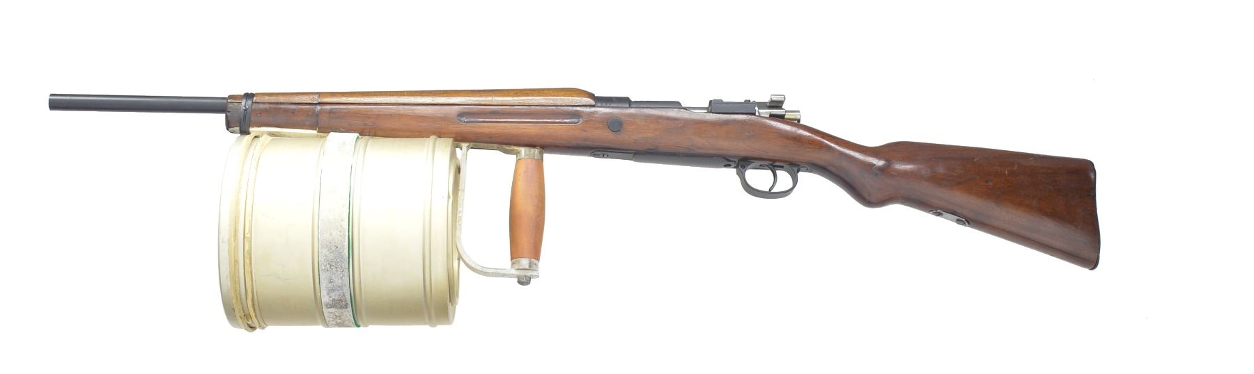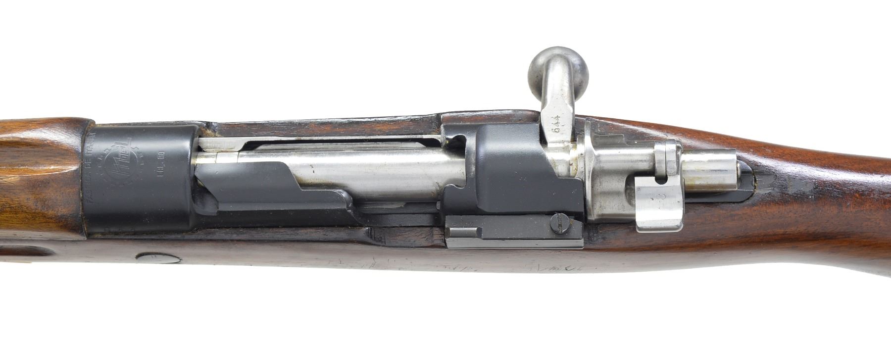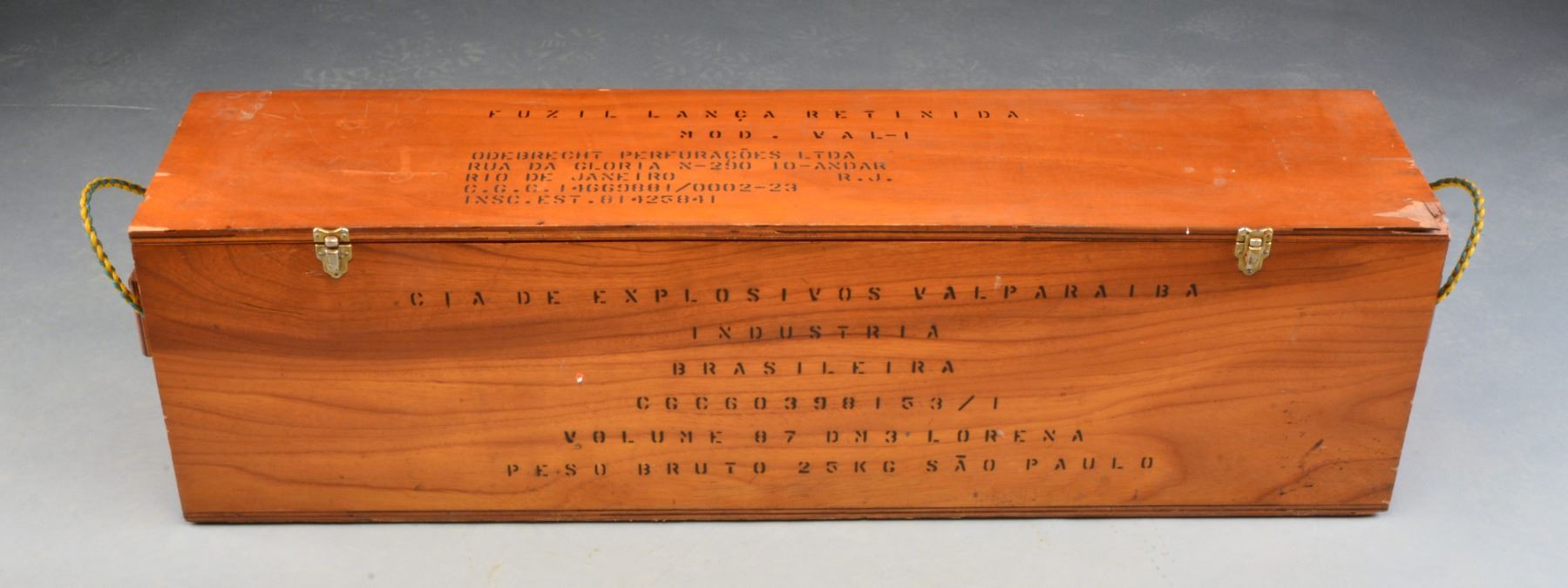 Cal. 28 Ga. S# 644. Bbl. 21" smooth bore. Numbers match on bolt & receiver. Line launching gun w/ chest, line canisters, inert weighted projectiles & 12 cal., 28 Ga. line throwing blanks. Line gun is converted from Mauser bolt action rifle. Receiver now marked on top w/ Imbel logo & "FABRICA DE ITAJUBA" & "CAL. 28". Mag. has been converted to hold 4 - 28 Ga. Blanks. Left receiver wall has added sheet metal cartridge guide. Turned down bolt handle. Mauser type safety is inoperable. Hardwood stock & handguard has inletting for sling swivels filled. Stock & handguard cutoff approx. 3" above lower band & has added band which retains forward hand grip & line canisters. UNATTACHED ACCESSORIES: nicely fitted plywood case w/ holders for parts & accessories. 2 Lg. canisters containing unknown amount of approx. 1/4" white nylon line. 7 Weighted projectiles: 4 rockets, 1 message, 1 Flexa, & 1 Bouy. 12 Blank 28 Ga. Shells dated 1989. Owner"s manual printed in Portuguese. Has inspection certificate stapled inside of case lid. CONDITION: throwing gun & accessories in very good condition. Bright shiny bore. Many accessories in original packaging. (20-911/RW). MODERN. $2,500-4,000.