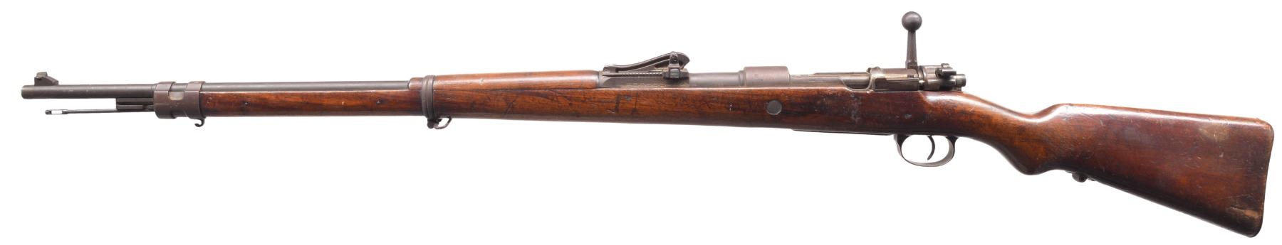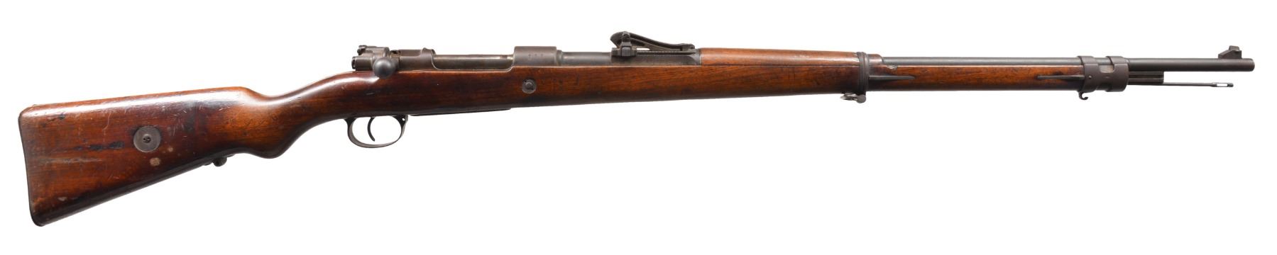 Cal. 8mm Mauser. S# 1019. Bbl. 29 1/8". All numbers match except for bolt assembly & cleaning rod. Receiver marked on left rail "Gew 98". Receiver ring marked on top crown "ERFURT 1916" & also marked on right side w/ Imperial German proofs. Straight bolt handle. Lange rear sight graduated to 2,000m. Inverted V front sight. Has bayonet bar, upper band has parade hook & lower band has swivel. Detachable butt swivel is not present. Walnut stock set. Stock has unmarked steel marking disk & faint Imperial acceptance marks. CONDITION: stock set has moderate to heavy wear, dents staining & scratches over added finish. Has sm. crack behind receiver tang. Metal turning overall gray & patina. Bright receiver turned mostly patina. Fair worn bore turning dark. (19-5823/RW). CURIO. $300-500.