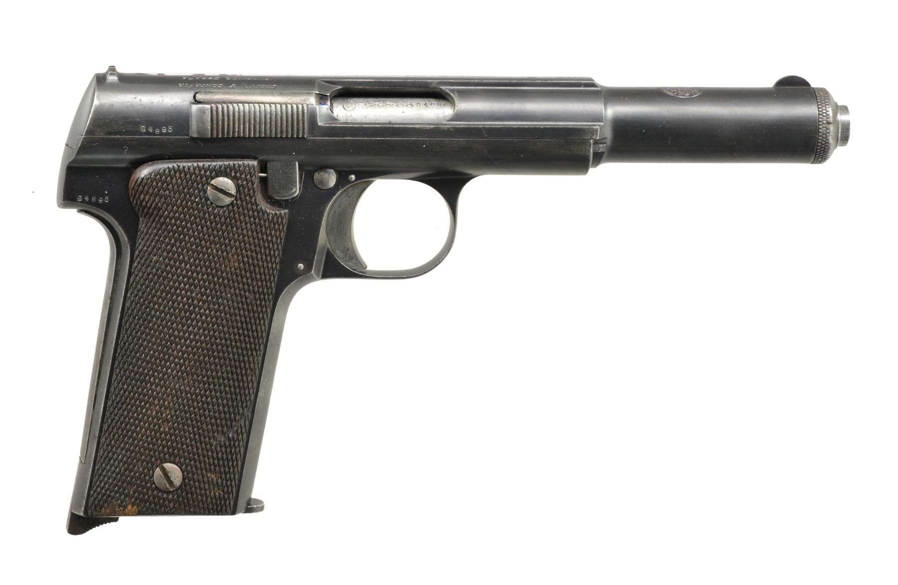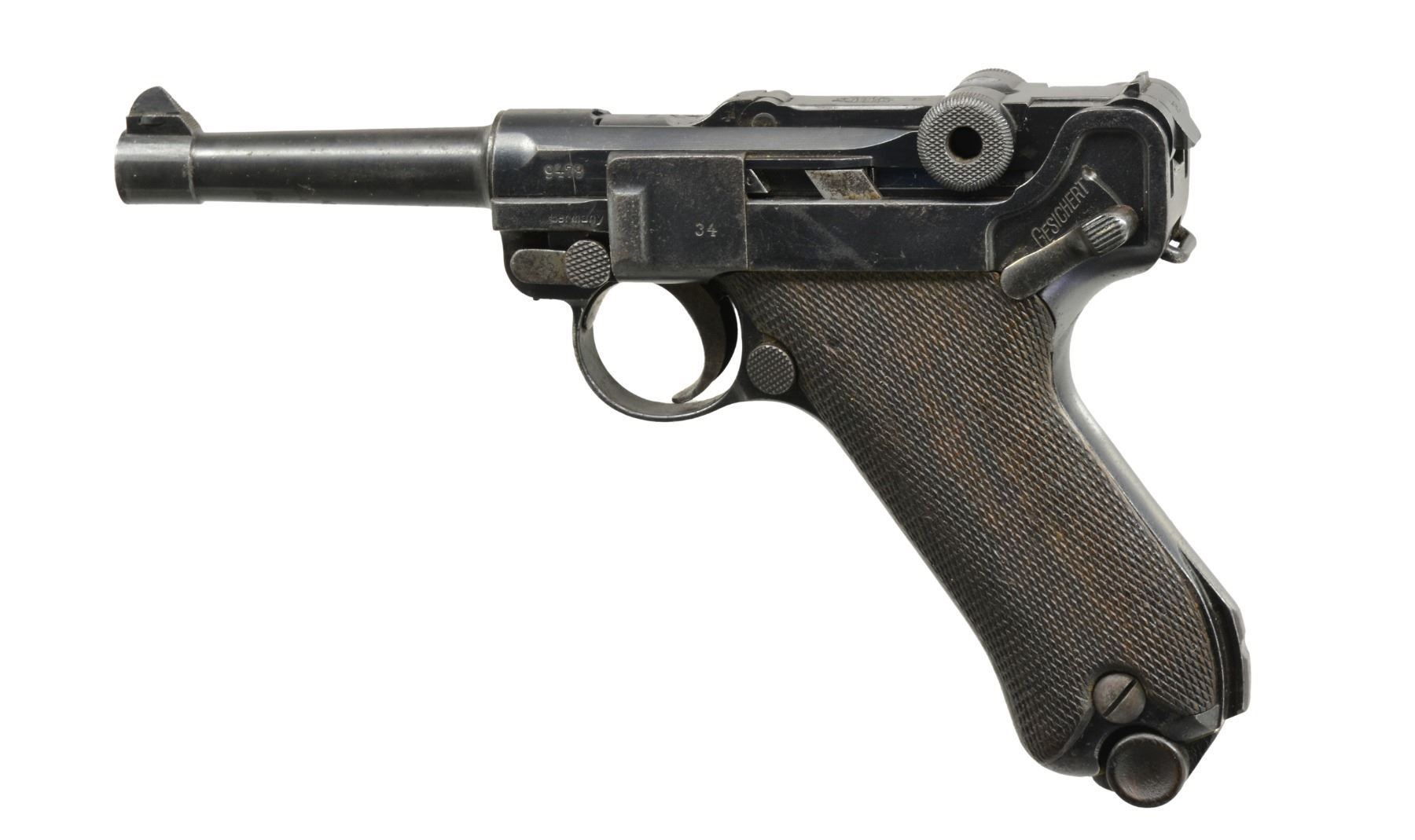 SEMI-AUTO PISTOLS. 1) ASTRA MODEL 400. Cal. 9mm Largo & 38 ACP. S# 94895. Bbl. 6" marked at port "9m/m 38" (ACP, NOT Super; too powerful). Also marked on slide as Model 1921 (1921-1945). Matching numbered bbl., slide & frame. S# range of German WWII use was 92,851-98,850 which includes this pistol. Standard proofs w/ addition of "M" (1941) at top left rear of frame. Fully checkered walnut grips. MAGS: 2-8 rd. total; 1 Astra marked w/ noticeable finish loss & 1 unmarked w/ refinish over some moderate pitting plus having slightly reduced dimensions. CONDITION: good plus overall appearance w/ light marks & gray toned thinning in grip area. Occasional sm. spot of peppery oxidation. Left grip very good; right has some marks. Near excellent bore. (20-860/NW). 2) DWM MODEL 1914 MILITARY LUGER. Cal. 30 Luger. S# 5934b. Bbl. 3 7/8" unmarked replacement w/ fin shaped front sight. Receiver dated 1916. Frame & its parts all matching numbered except hold open latch #48. Receiver numbered 9478 as is entire toggle assembly; grips & bbl. not numbered. Standard proofs on receiver for 1914 Military model. Frame marked "GERMANY" above takedown lever indicating likely refurbished w/ non military bbl. assembled for export sales. MAGS: 1 light brown toned 8 rd. tin plated w/ wood base marked 7346m & crown proofed. CONDITION: fair to good as refinished over light to moderate pitting. Original somewhat faded strawed parts w/ light pitting. Good mechanical functioning. Almost good grips w/ notable amount of hand wear. Fair to good bore w/ sharp rifling plus light wear & faint frosting. (20-861/NW). BOTH CURIO. $1,200-1,700.