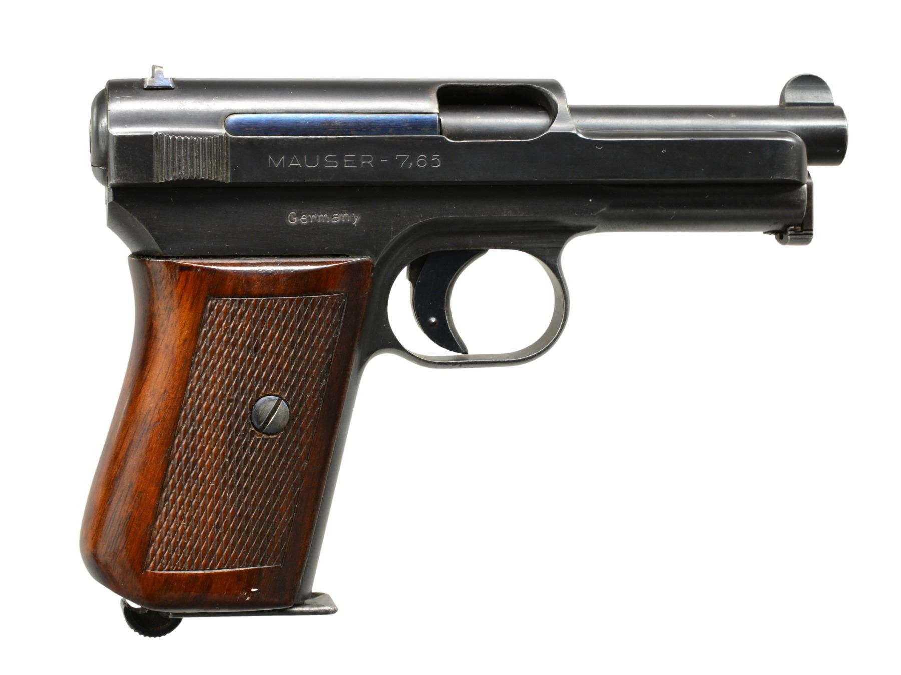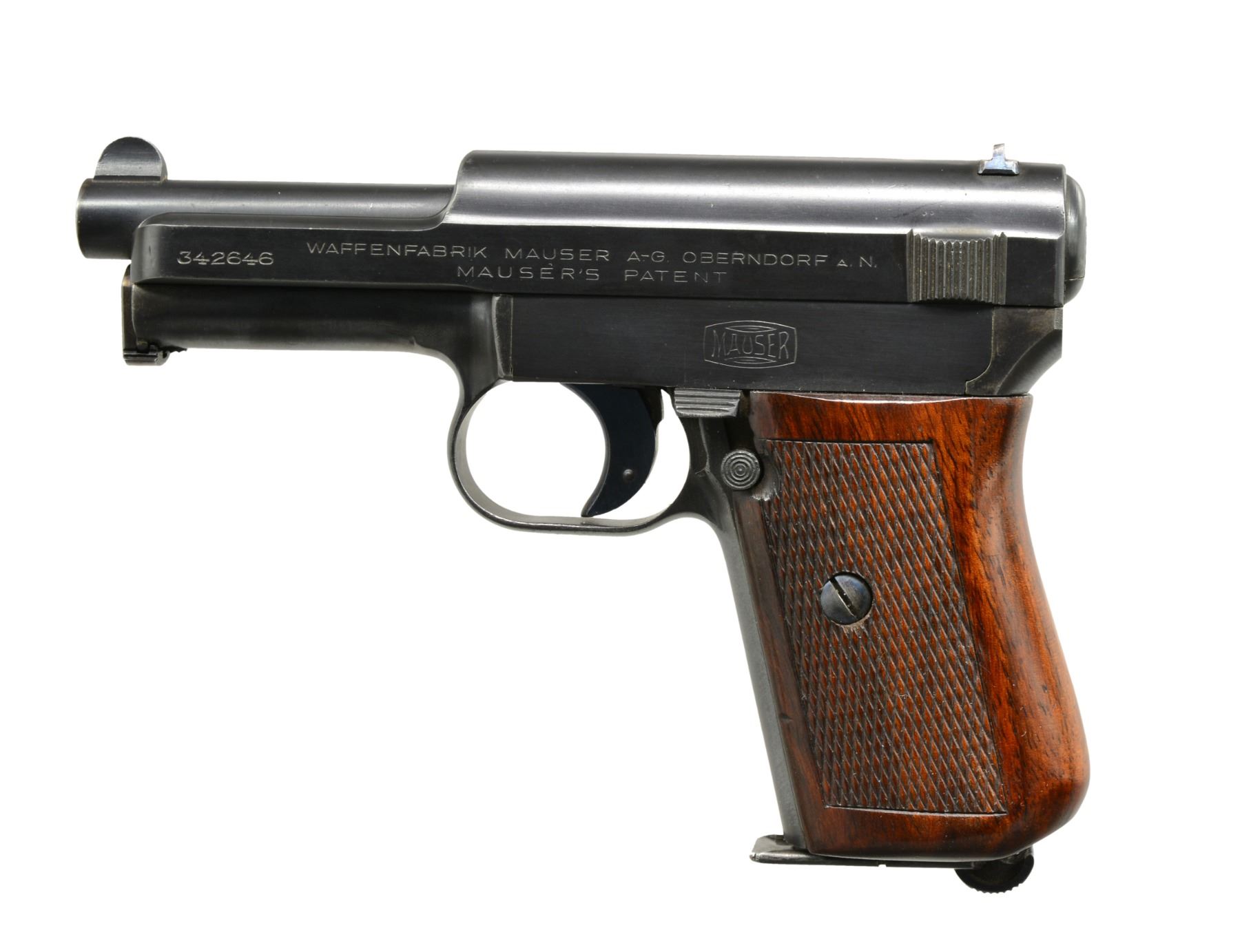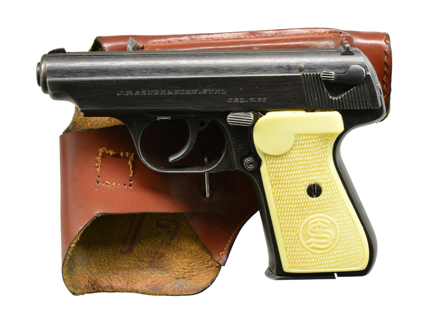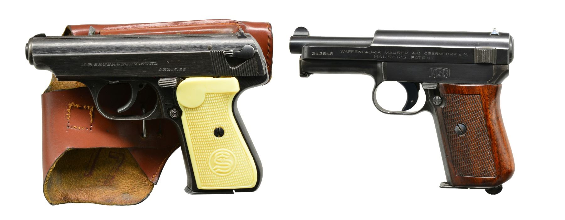 BOTH: cal. 7.65mm (32 ACP). 1) J.P. SAUER & SOHN MODEL 38H. S# 394189. Bbl. 3 1/4". Mfg. 1938-1945 in Suhl, Germany. Milled blued finish. Eagle N & eagle 37 proofs. Franzite checkered simulated ivory grips w/ intertwined SS logo on left. MAGS: 2 good 8 rd. w/ intertwined SS on push button bases. Slide safety & frame mounted decocking lever; DA functioning. UNATTACHED ACCESSORIES: good appearing flap holster w/ staple strap retention. Inside stamped w/ shadow outlined "77". Single medium width belt loop. Front flap has extra slot cut for staple & missing latching strap. CONDITION: very good throughout w/ minimal high point finish loss & occasional faint grip mark. Very good bright bore w/ hint of wear. (20-476/NW). 2) MAUSER MODEL 1914. S# 342646. Bbl. 3.42". Mfg. 1914-1934 w/ polished blued finish including Nitre blue on extractor, trigger & takedown lever. Matching numbers on frame, bbl., slide & sideplate. Checkered walnut one piece grip. Right side of frame above grip has "Germany" export mark. Crown U proofed. MAGS: 1 very good Mauser banner marked 8 rd. CONDITION: very good plus overall appearance w/ occasional very faint marks most noticeable on front strap. Very good grips & bore. (20-491/NW). BOTH CURIO. $700-1,000.