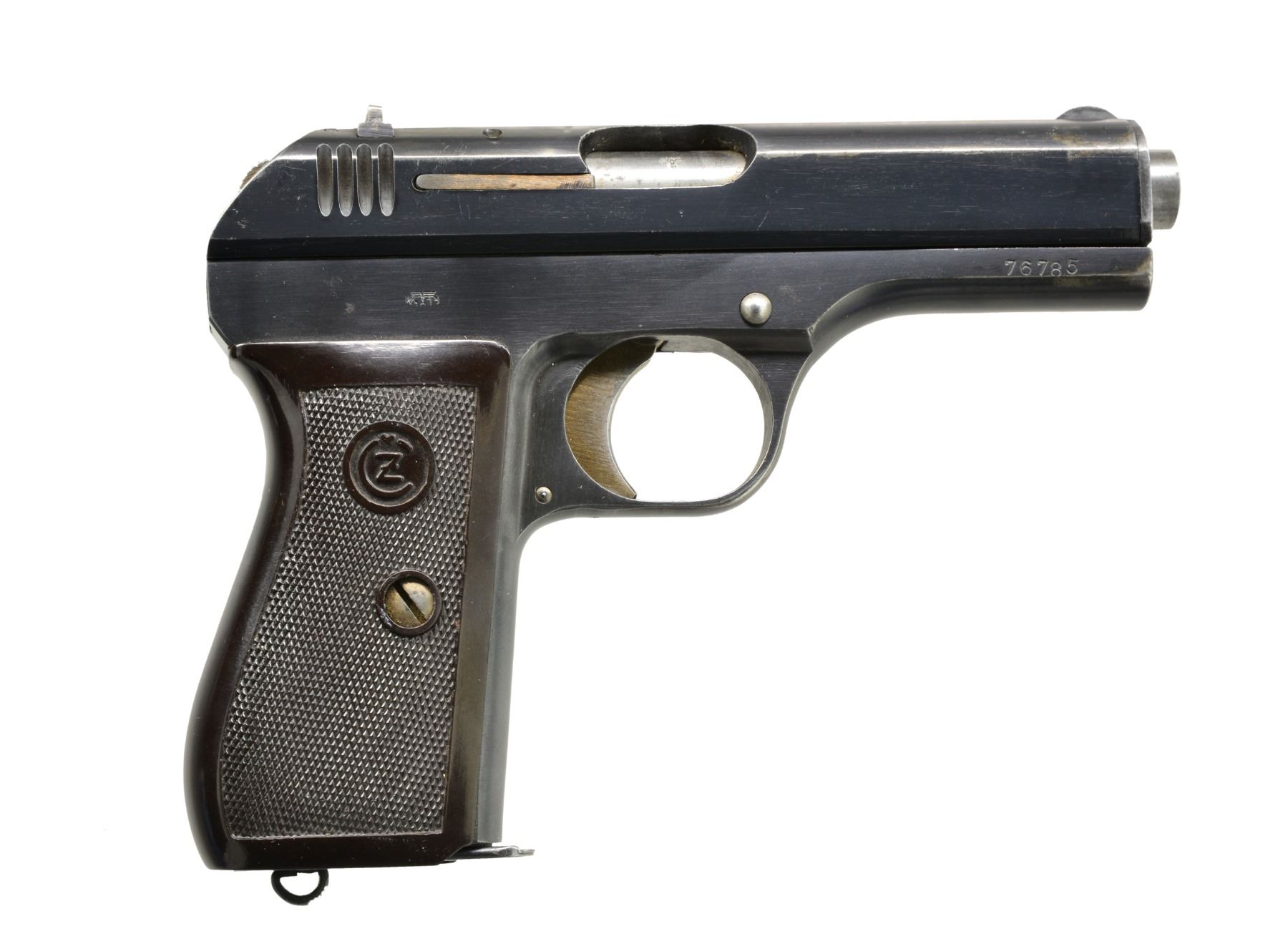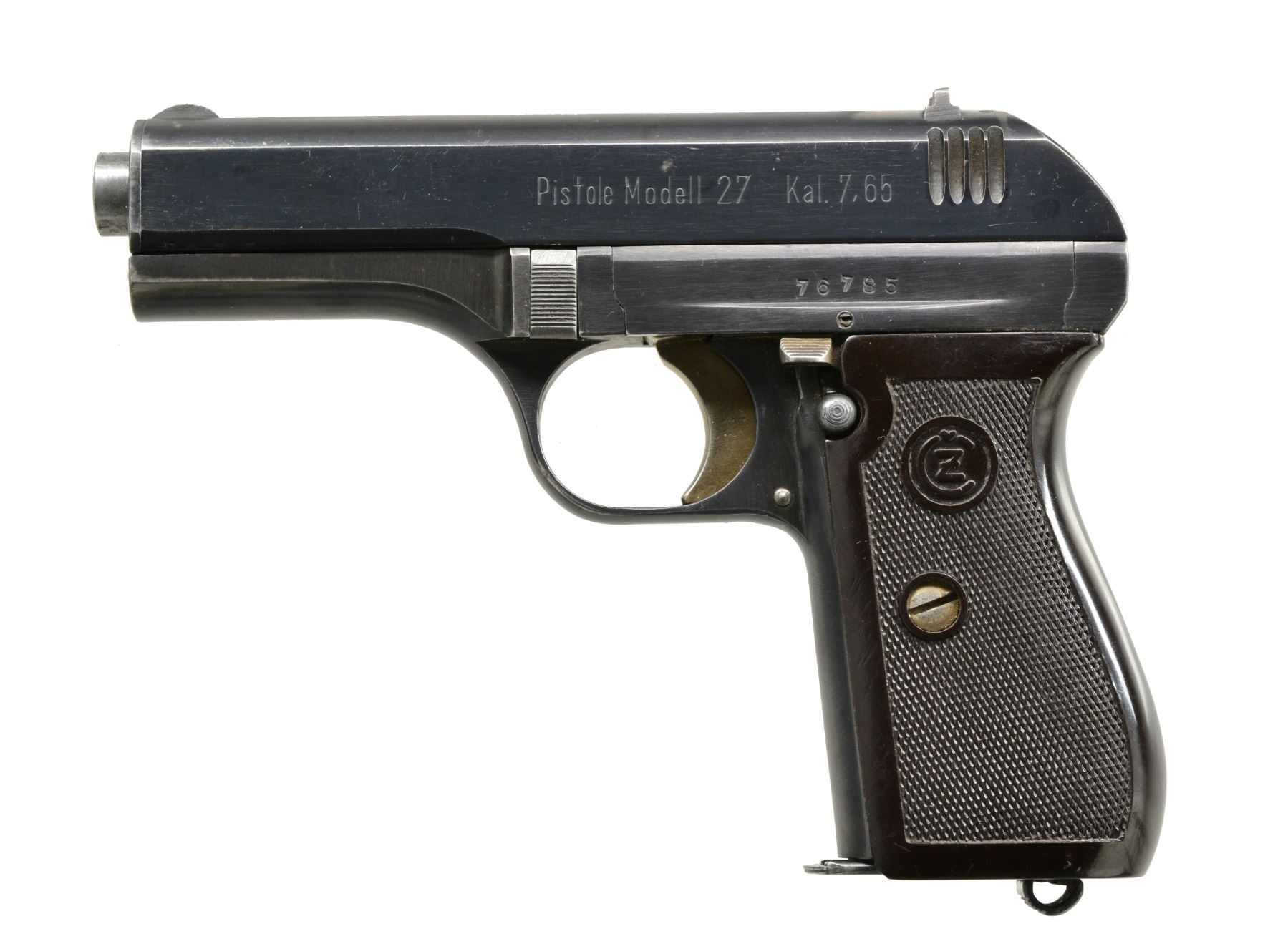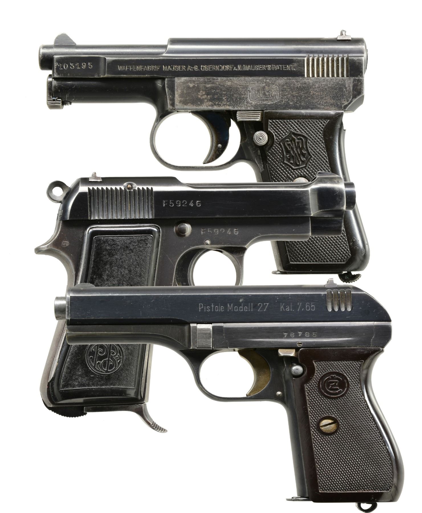ALL: blued finishes w/ black grips. 1) MAUSER MODEL 1910. Cal. 6.35 (25 ACP). S# 103195. Bbl. 3". Mfg. 1910 to 1934 w/ checkered hard rubber grips. Crown U proofed w/ matching numbers for bbl., slide, frame & sideplate. MAGS: 1 good 9 rd. having stained appearance on body. CONDITION: good general appearance w/ high point wear & peppery oxidation along w/ faded appearance to sideplate. Both grips have lg. chips at top rear plus left has chip below safety & sm. chip on butt at rear. Very good bore. (19-5797/NW). 2) BERETTA MODEL 1934. Cal. 9mm Corto (380 ACP). S# F59246. Bbl. 3 3/8". Mfg. 1942 (1934-1959) as marked on slide that also has "XXI" translating to 1943. Frame marked "RE" indicating army use. Matching numbered slide. Metal backed PTB logo hard rubber grips. Top right rear of frame has "IVU" in oval plus "GB" in oval on trigger guard. MAGS: 1 very good 7 rd. w/ metal finger extension. CONDITION: good plus overall appearance having gloss blue w/ typical high point, grip & holster wear. Hand scratched "X" by "RE" marking. Very good grips w/ beginning patina to backings plus back strap. Fair to good bore w/ wear & even pitting. (19-5809/NW). 3) CZ MODEL 27. Cal. 7.65mm (32 ACP). S# 76785. Bbl. 4". "BOHMISCHE" marked slide. Matching numbered sideplate, frame, slide & bbl. Eagle WaA76 on slide & frame plus eagle party symbol on bbl. Mag. & thumb safeties. 1 Piece CZ logo checkered brown plastic grips. MAGS: 1 good "P.Mod.27", floorplate marked 8 rd. CONDITION: very good high polished appearance w/ slight high point wear mostly on slide & area near muzzle. Traces of straw colors remaining on extractor; very good on trigger. Very good to excellent grips w/ minimal hand wear. Near excellent bore. (19-5810/NW). ALL CURIO. $800-1,200.