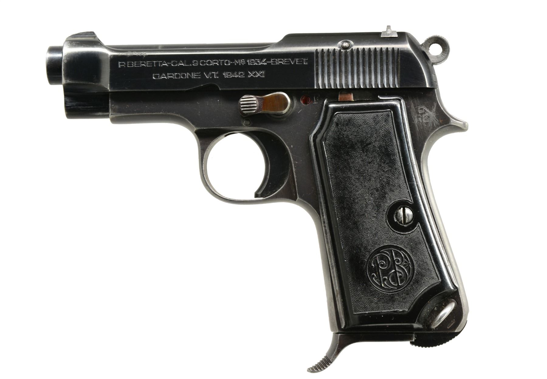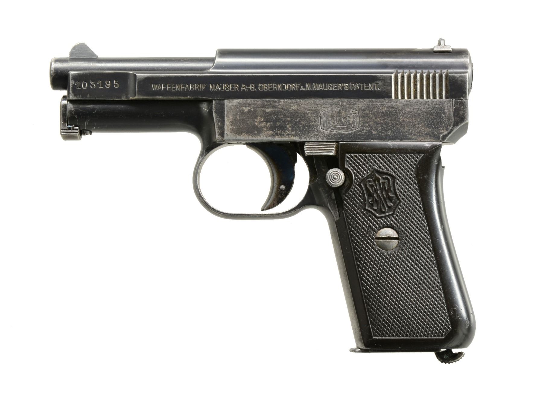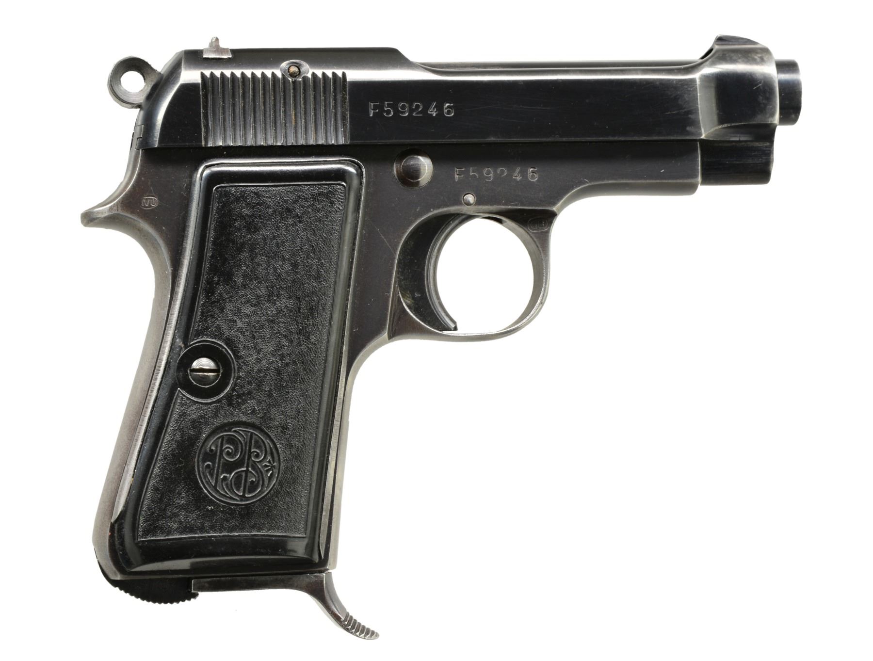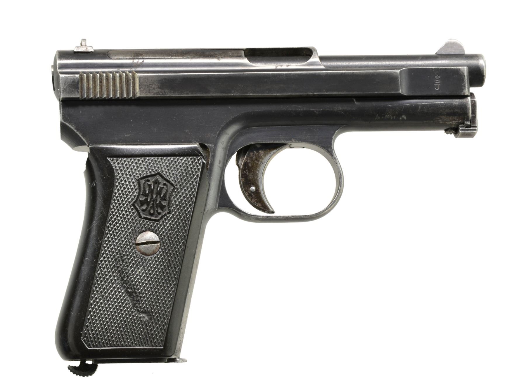 ALL: blued finishes w/ black grips. 1) MAUSER MODEL 1910. Cal. 6.35 (25 ACP). S# 103195. Bbl. 3". Mfg. 1910 to 1934 w/ checkered hard rubber grips. Crown U proofed w/ matching numbers for bbl., slide, frame & sideplate. MAGS: 1 good 9 rd. having stained appearance on body. CONDITION: good general appearance w/ high point wear & peppery oxidation along w/ faded appearance to sideplate. Both grips have lg. chips at top rear plus left has chip below safety & sm. chip on butt at rear. Very good bore. (19-5797/NW). 2) BERETTA MODEL 1934. Cal. 9mm Corto (380 ACP). S# F59246. Bbl. 3 3/8". Mfg. 1942 (1934-1959) as marked on slide that also has "XXI" translating to 1943. Frame marked "RE" indicating army use. Matching numbered slide. Metal backed PTB logo hard rubber grips. Top right rear of frame has "IVU" in oval plus "GB" in oval on trigger guard. MAGS: 1 very good 7 rd. w/ metal finger extension. CONDITION: good plus overall appearance having gloss blue w/ typical high point, grip & holster wear. Hand scratched "X" by "RE" marking. Very good grips w/ beginning patina to backings plus back strap. Fair to good bore w/ wear & even pitting. (19-5809/NW). 3) CZ MODEL 27. Cal. 7.65mm (32 ACP). S# 76785. Bbl. 4". "BOHMISCHE" marked slide. Matching numbered sideplate, frame, slide & bbl. Eagle WaA76 on slide & frame plus eagle party symbol on bbl. Mag. & thumb safeties. 1 Piece CZ logo checkered brown plastic grips. MAGS: 1 good "P.Mod.27", floorplate marked 8 rd. CONDITION: very good high polished appearance w/ slight high point wear mostly on slide & area near muzzle. Traces of straw colors remaining on extractor; very good on trigger. Very good to excellent grips w/ minimal hand wear. Near excellent bore. (19-5810/NW). ALL CURIO. $800-1,200.