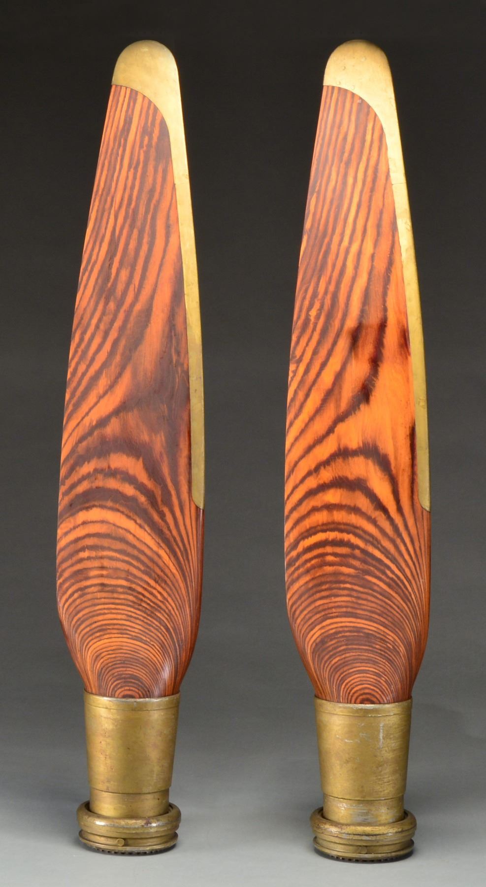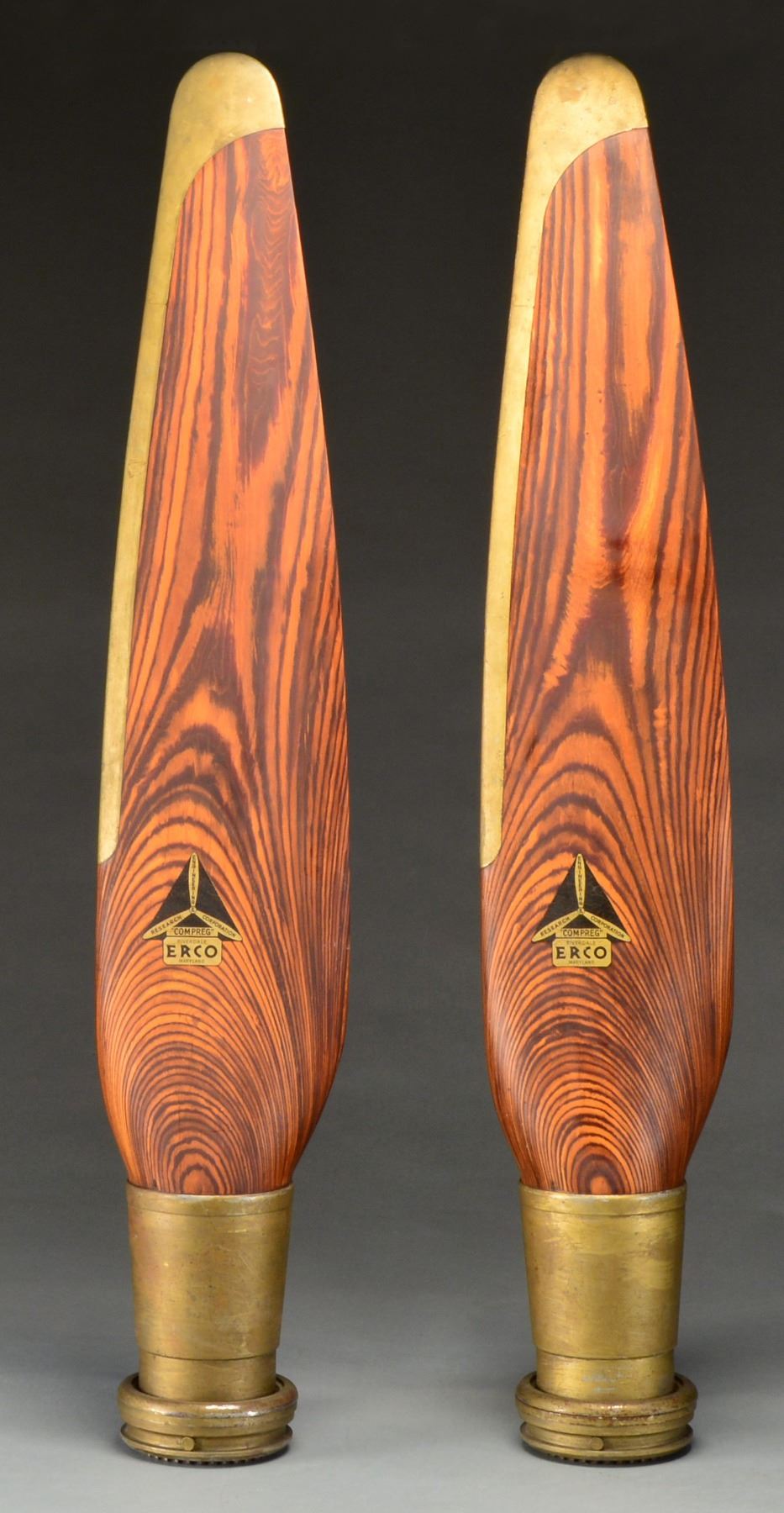BLADES. These 2 blades each measure 52" in overall length. They have a steel alloy ferrule & attachment ring that extends 10" up the base w/ a brass edge & tip on the plastic impregnated compressed hardwood blades. Each blade is marked w/ the company logo that reads, "ERCO RIVERDALE MARYLAND ENGINEERING & RESEARCH CORPORATION "COMPREG" ". Blades like this were produced for use w/ the Hamilton Standard propeller hub used in general aviation as well as military trainers & smaller transport planes. The wooden blades were developed to compensate for a shortage of aluminum during the war. The blades were carved from an impregnated & compressed laminated block of high density wood called "Compreg". CONDITION: both blades show handling wear only & appear to have never been mounted to an aircraft. (02-13500/BF). $2,200-2,800.
