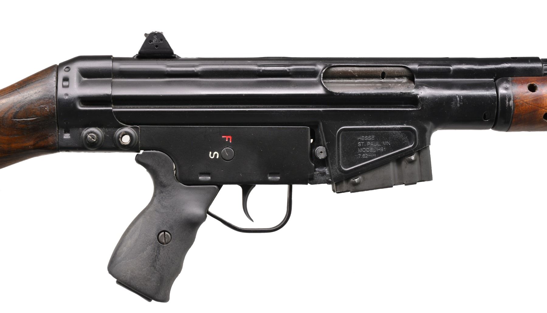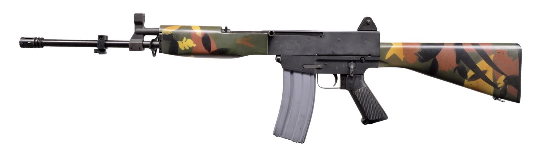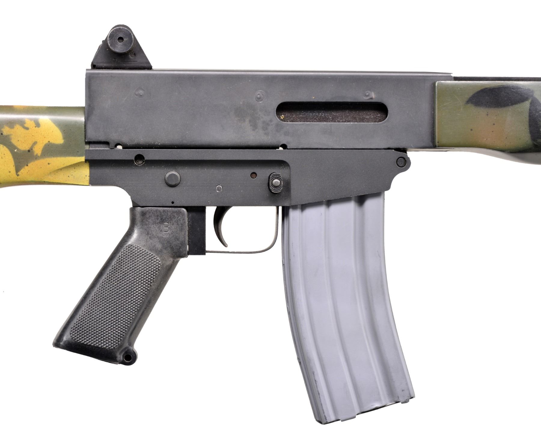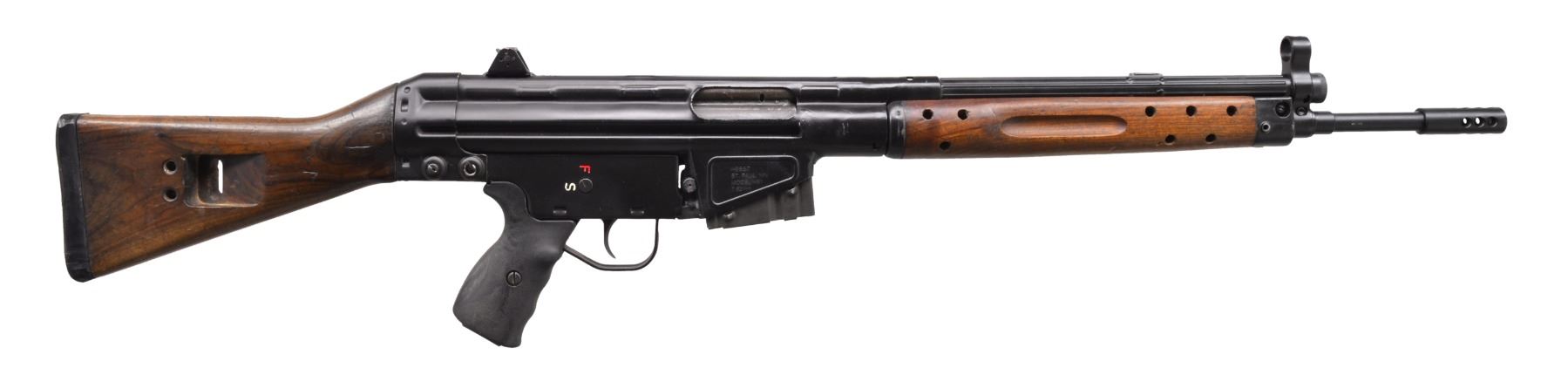 1) HESSE CETME SPORTER. Cal. 308. S# 6006150. Bbl. 19 1/2" including muzzle brake. CETME 308 semi auto variant of the well known battle rifle that eventually lead to the iconic HK G3 & model 91. Original wood furniture front & rear. Hooded protected post front sight. 4 Position rotating rear sight (not HK drum). MAGS: 1 steel 5 rd. CONDITION: metal surfaces painted dark black w/ scattered light scuff marks. Wood furniture common from this era & region display impressions & oil staining typical of armory sourcing. Shiny bore w/ strong rifling. (19-5890/JZ). MODERN. 2) BUSHMASTER ASSAULT. Cal. 5.56mm. S# F01301. Bbl. 18 1/2". A nice example of the unique early original mfg. by Bushmaster Firearms in Portland ME. The operating system utilizes technology typical of both the AR-15, such as rotating bolt & AK47 style Op Rod. A1 Style flash hider. Bayonet lug. Protected post elevation adj. front sight. Windage adj. flip up dual aperture rear sight. Camouflage painted front & rear stocks. MAGS: 1 aluminum 30 rd. OKAY Industries. CONDITION: finish on exposed metal surfaces has been prone to light scratching & rubbing probably in storage. Top area of bolt exhibits thinning finish where it interfaces w/ receiver. Wood furniture camouflage pattern is uninterrupted & free from any major defect, only exhibiting a few light depressions. Bore is clean w/ strong rifling. Firing mechanism appears to function correctly when cycled by hand. (19-5897/JZ). BOTH MODERN. $800-1,300.