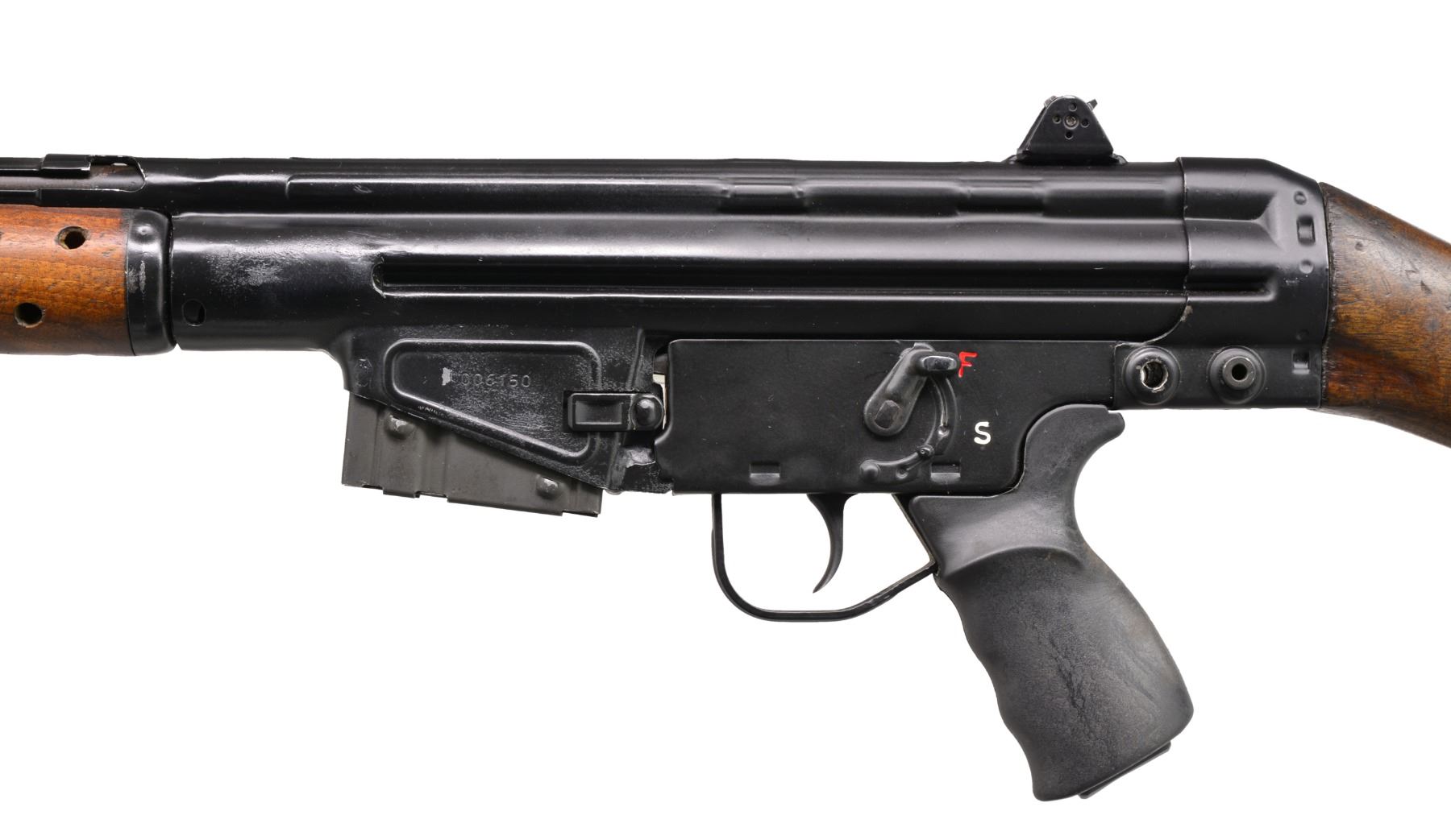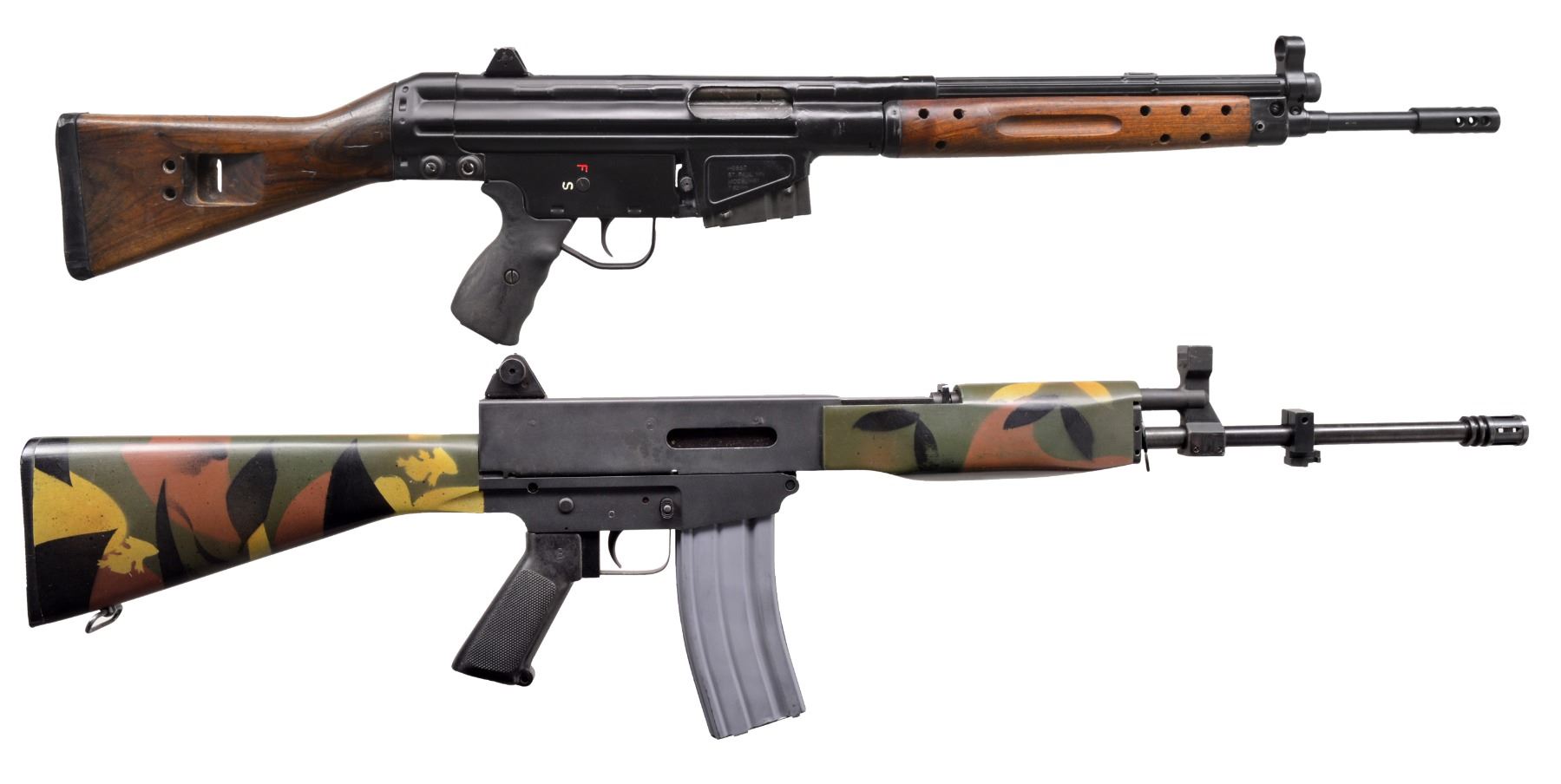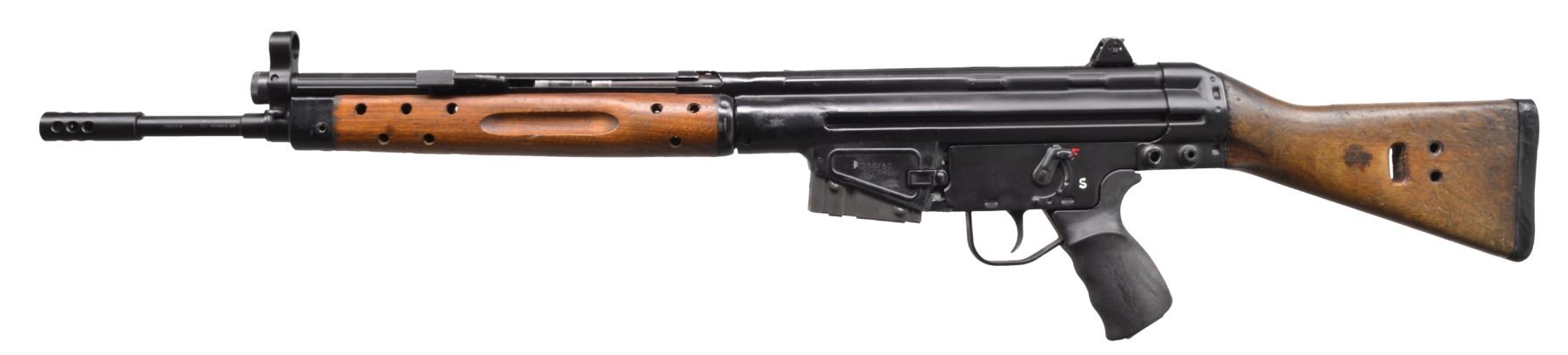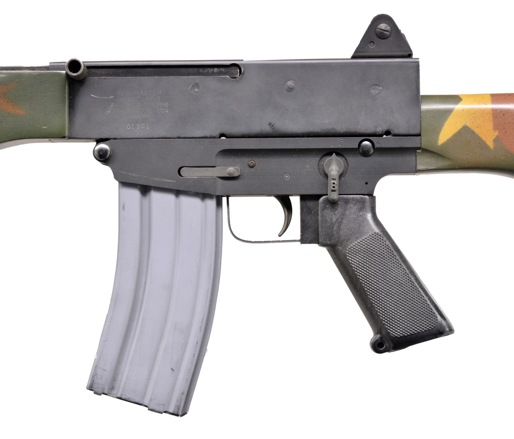 1) HESSE CETME SPORTER. Cal. 308. S# 6006150. Bbl. 19 1/2" including muzzle brake. CETME 308 semi auto variant of the well known battle rifle that eventually lead to the iconic HK G3 & model 91. Original wood furniture front & rear. Hooded protected post front sight. 4 Position rotating rear sight (not HK drum). MAGS: 1 steel 5 rd. CONDITION: metal surfaces painted dark black w/ scattered light scuff marks. Wood furniture common from this era & region display impressions & oil staining typical of armory sourcing. Shiny bore w/ strong rifling. (19-5890/JZ). MODERN. 2) BUSHMASTER ASSAULT. Cal. 5.56mm. S# F01301. Bbl. 18 1/2". A nice example of the unique early original mfg. by Bushmaster Firearms in Portland ME. The operating system utilizes technology typical of both the AR-15, such as rotating bolt & AK47 style Op Rod. A1 Style flash hider. Bayonet lug. Protected post elevation adj. front sight. Windage adj. flip up dual aperture rear sight. Camouflage painted front & rear stocks. MAGS: 1 aluminum 30 rd. OKAY Industries. CONDITION: finish on exposed metal surfaces has been prone to light scratching & rubbing probably in storage. Top area of bolt exhibits thinning finish where it interfaces w/ receiver. Wood furniture camouflage pattern is uninterrupted & free from any major defect, only exhibiting a few light depressions. Bore is clean w/ strong rifling. Firing mechanism appears to function correctly when cycled by hand. (19-5897/JZ). BOTH MODERN. $800-1,300.