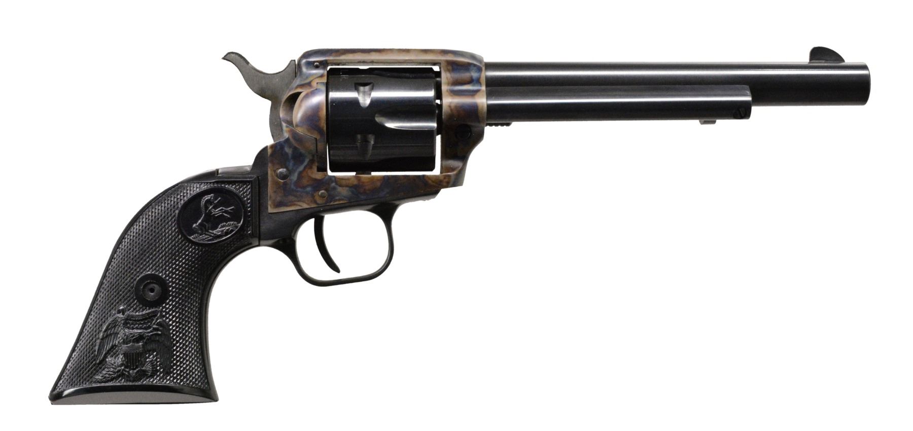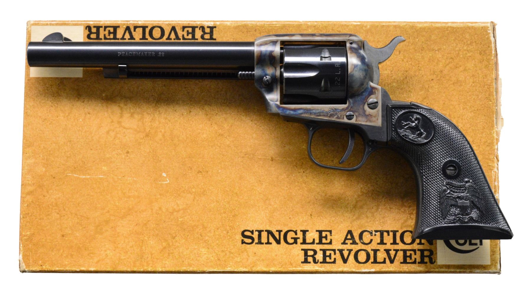 Cal. 22 LR. S# G91141. Bbl. 6". 6 Shot fluted cyl. blued bbl. & cyl. w/ case colored frame & black finished alloy trigger guard. 2 Piece checkered plastic eagle grips. Mfg. 1974. UNATTACHED ACCESSORIES: original 2 piece box w/ proper yellow label containing instruction pamphlet. Box is lightly tattered w/ 2 torn corners. CONDITION: near excellent retaining nearly all original finish. Near excellent bore. (19-5738/DS). MODERN. $500-700.