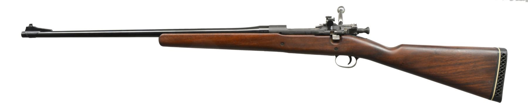 Cal. 35 Whelen. S# 916091. Bbl. 23 1/2" marked on left side "35 WHN". Banded ramp front sight w/ gold covered bead marked "LYMAN". Bolt is 1903A3 type w/ bolt shroud marked "R". Receiver fitted w/ Lyman 48 sight w/ target knobs graduated to 60 points of elevation. Modified straight grip walnut stock w/ 2 recoil bolts fitted w/ Pachmayr White Line ventilated recoil pad. Milled trigger guard. Butt swivel recess & buttplate tang recess both professionally refilled w/ walnut. CONDITION: walnut stock has very light wear & several sm. scattered handling marks. Receiver has lg. percentage of matte type blue. Bbl. retains most of professional gunsmith bluing. Near excellent shiny bore. (20-837/RW). MODERN. $300-400.