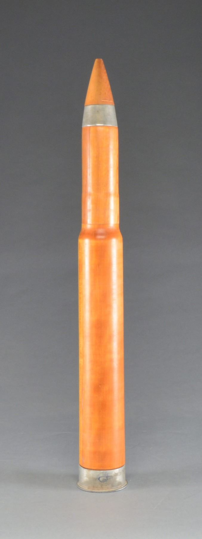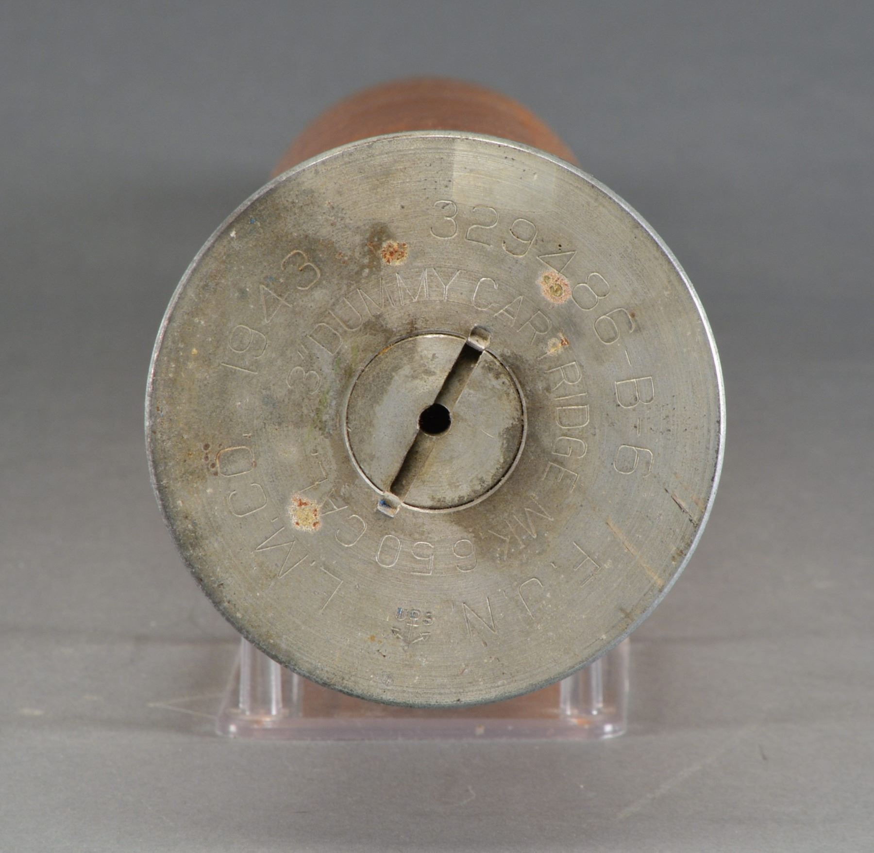 Round has wood & metal construction. Metal base markings include "LMCO" indicating mfg. by Line Metal Company 1943 "3" DUMMY CARTRIDGE MK6 50 CAL". Nose of shell is removable. Shell weights 29.5 lbs. Retains a well worn original shipping carton w/ reinforced interior. CONDITION: shells are in very good natural wood finish w/ light wear & scattered handling marks. Notable streak of staining near base. Shipping carton is missing 1 end flap. Has wear, scuffing & tearing. (02-13477/RW). $100-200.