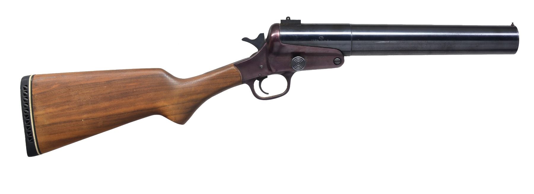 Cal. 37mm. S# 5800. Bbl. 14". Mfg by The Lake Erie Chemical Co., Cleveland, OH. Break open single shot action has release button on right side. Bead front sight w/ base only remaining for front sight. Pistol grip walnut stock, LOP 14 1/2" over aftermarket Pachmayr pad. CONDITION: metal retains 80% reblued finish, receiver has acquired a plum coloration. Stock shows scratches & marks. Bore is deeply pitted w/ areas of rust. (02-13747/DS). NON GUN. $150-250.