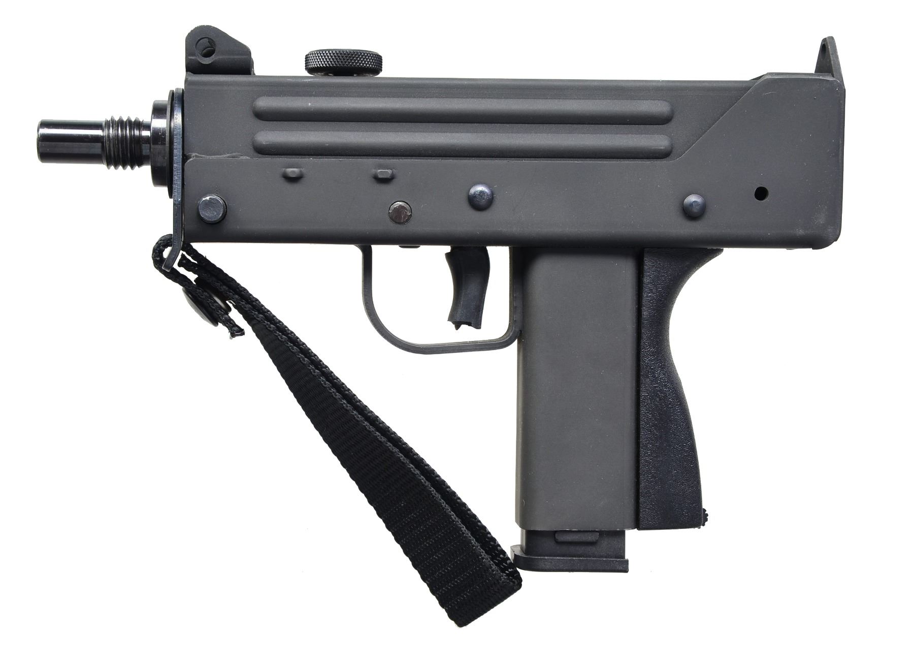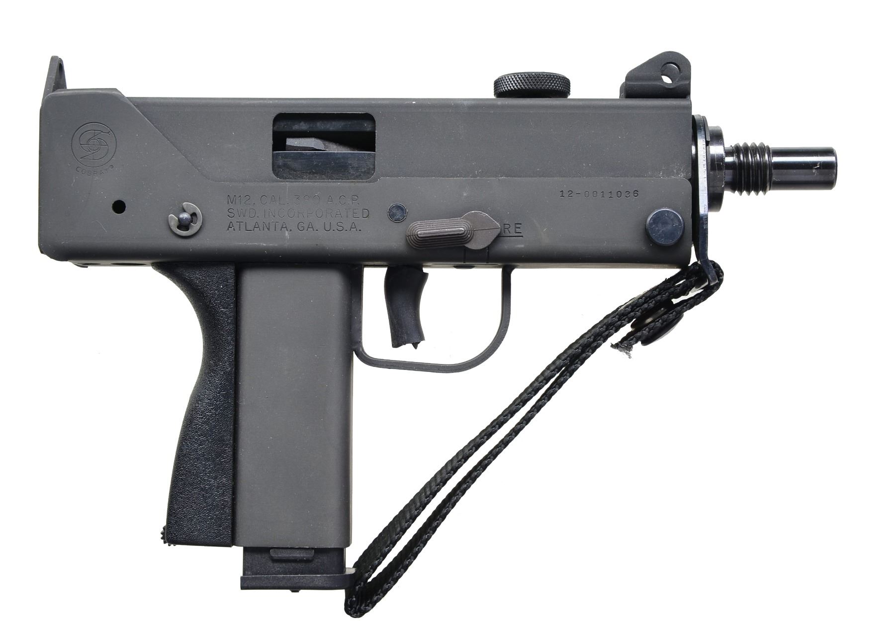 Cal. 380 ACP. S# 12-0011036. Bbl. 5". The littlest member of the MAC family. The tiny M12, similar in size to a standard 1911, packs a big punch. 380 Is an exceptional caliber, especially if the use of a suppressor is desired. Largely influenced in design by its larger sibling, the 9mm M11, the Cobray M12 is a closed bolt, semi-automatic version of "the gun that made the 80s roar". Top cocking lever, fixed front sight is a protected post, which coincides w/ the rear sight, being no more than a slot & a peep which is part of the rear receiver plate. Threaded bbl. w/ hanger for & including front strap. Black parkerized finish. MAGS: 1 Zytel 10-rd, 1 steel 30-rd. CONDITION: exterior finish is complete w/ only light handling marks as typically found on these firearms. It appears that it has spent more time in a safe than on the firing line. Fire control mechanism appears to function correctly when cycled by hand. Bore is shiny w/ well pronounced rifling. (20-1011/JZ). MODERN. $350-500.