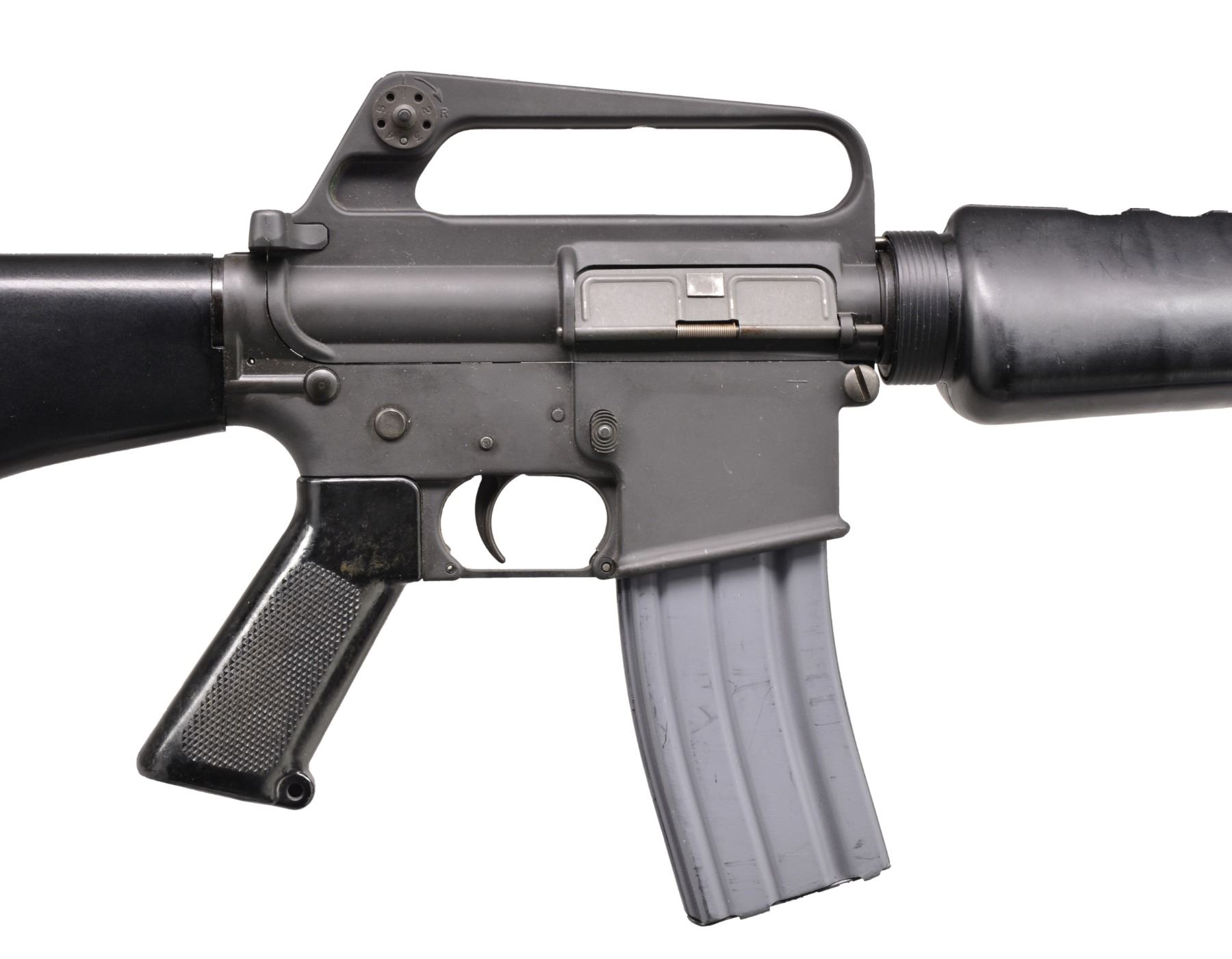 Cal. 223. S# 07733. Bbl. 20" pencil. 3 Prong flash hider. Beavertail handguards. Flat Delta ring. Slab side lower receiver. Carry handle upper receiver w/ windage adj. flip up rear sight. Traditional elevation adj. protected post front sight w/ bayonet lug. No forward assist. Front takedown screw. 10" Rear stock w/ factory soft buttplate. No trapdoor. Bottom sling swivels front & rear. MAGS: 1 OKAY Industries aluminum 30 rd. CONDITION: clean bore w/ strong rifling. Black plastic furniture free of any significant blemishing. Parkerized finish on receivers is uniform w/ light handling marks w/ no significant wear. Approx. 1/2" behind takedown pin at same elevation is a "+" sign measuring approx. 1/4" X 1/4" that lightly protrudes from the receiver. Fire control mechanism appears to function correctly when cycled by hand. (19-5891/JZ). CURIO. $800-1,200.