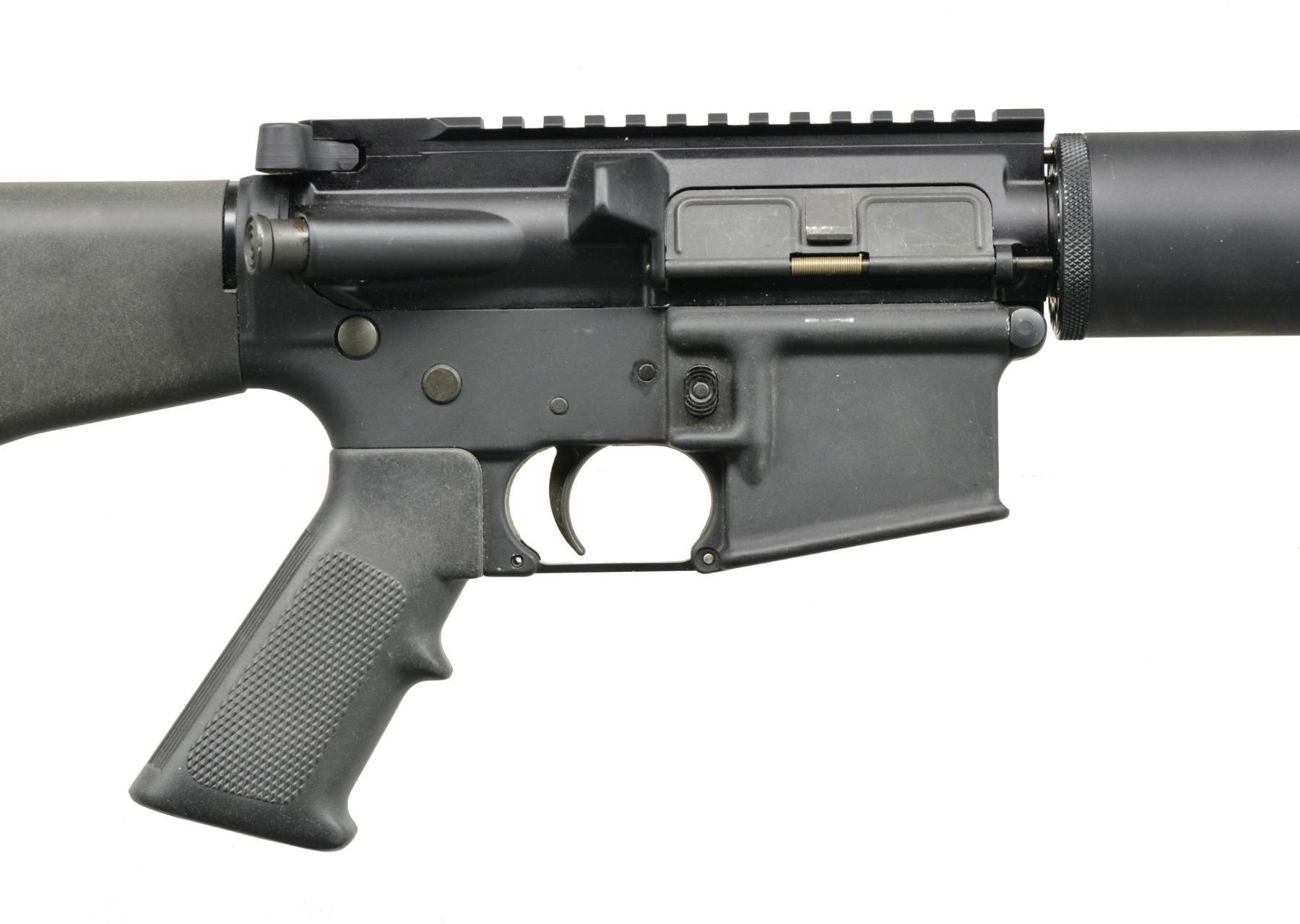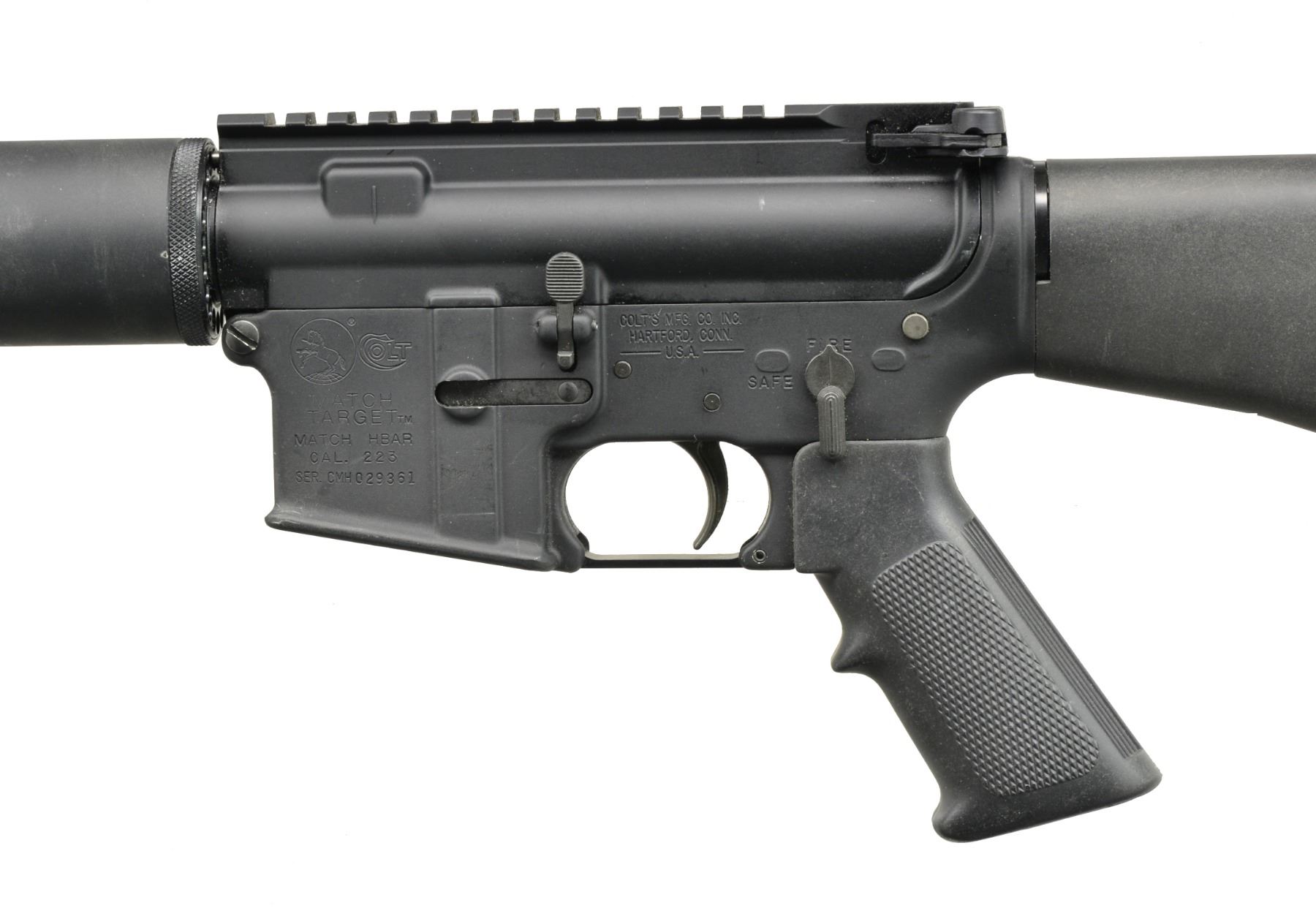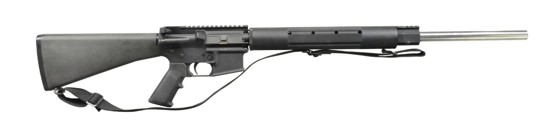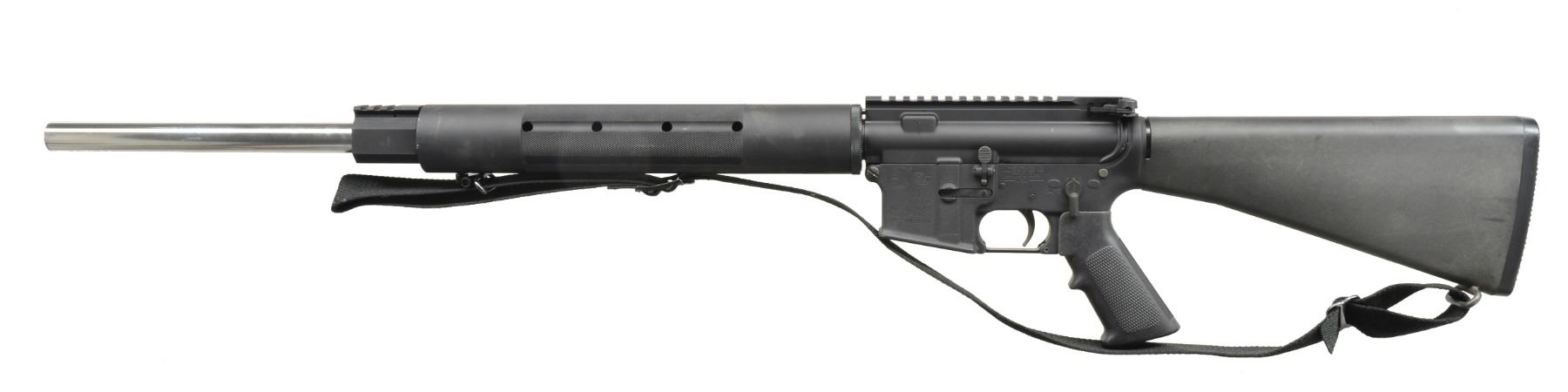 Cal. 223. S# CMH029361. Bbl. 24". Free floating, highly polished, heavy bbl. Low profile gas block w/ 2" picatinny rail section. Full length A2 trap door buttstock. Flat top upper receiver w/ rnd. forward assist & brass deflector. Knurled & ventilated hand guard. Black nylon sling. CONDITION: it appears that this firearm has experienced very little use; light finish in one sm. high area of mag. well on left side; bright bbl. w/ good rifling; fire control mechanism appears to function correctly when cycled by hand. (20-783/JZ). MODERN. $800-1,200.