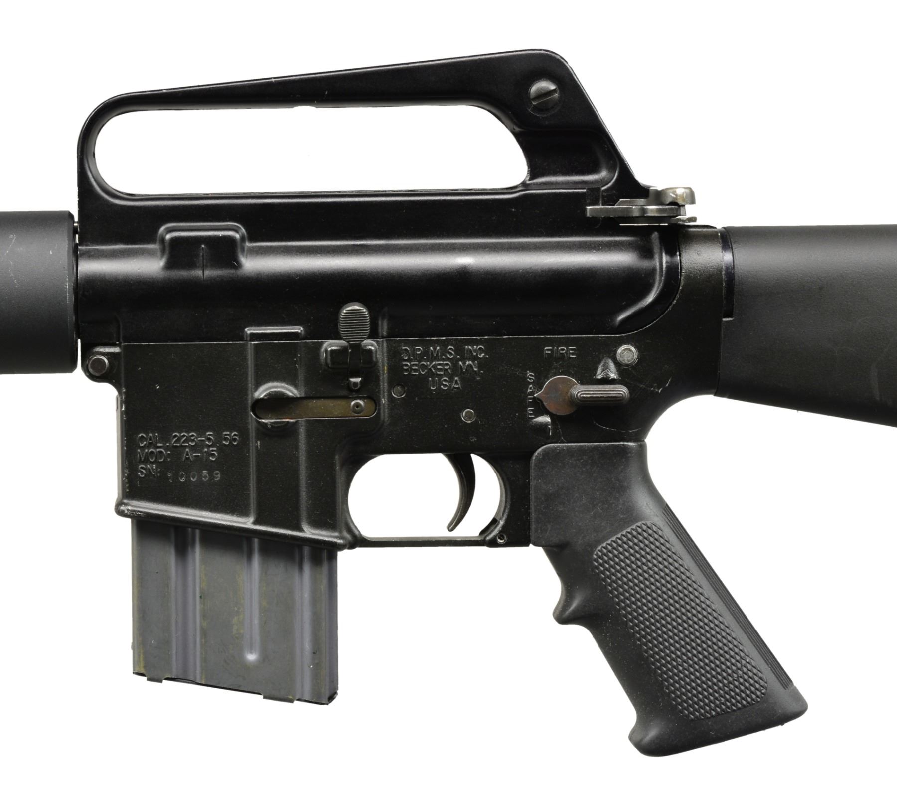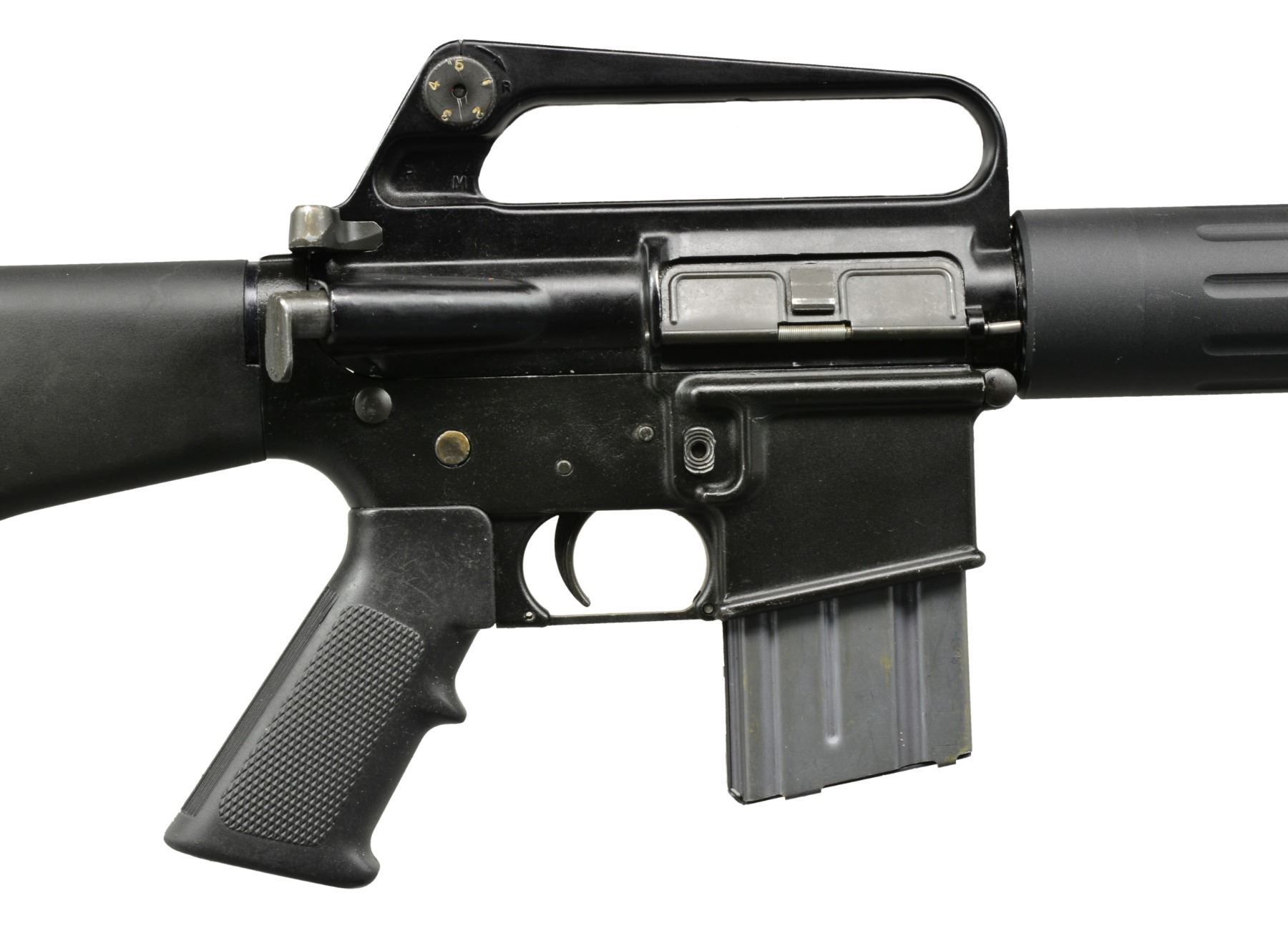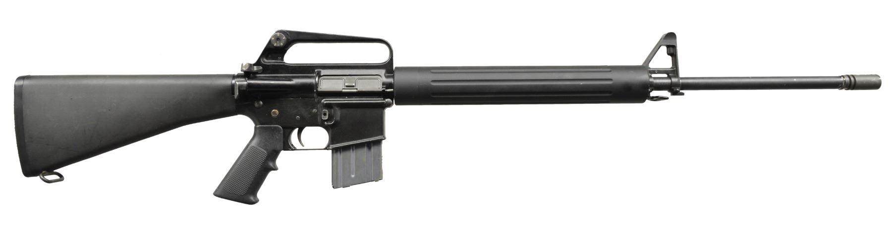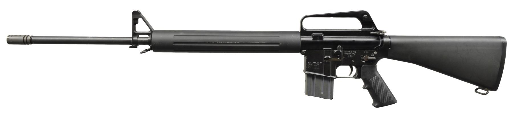 Cal. 223. S# 10059. Bbl. 24". Free floating 24" bbl. w/ custom muzzle break. Protected post front sight w/ shaved bayonet lug. Carry handle upper receiver w/ tear drop forward assist & no brass deflector. E1 windage adj. rear sight. Full length A2 style trap door buttstock. Sling swivels front & rear. MAGAZINE: 1 aluminum 20 rd. mag. CONDITION: clean bore w/ decent rifling; dark black painted finish on upper & lower receivers, exhibit thinning on high areas; fire control mechanism appears to function correctly when cycled by hand. (20-819/JZ). MODERN. $500-900.