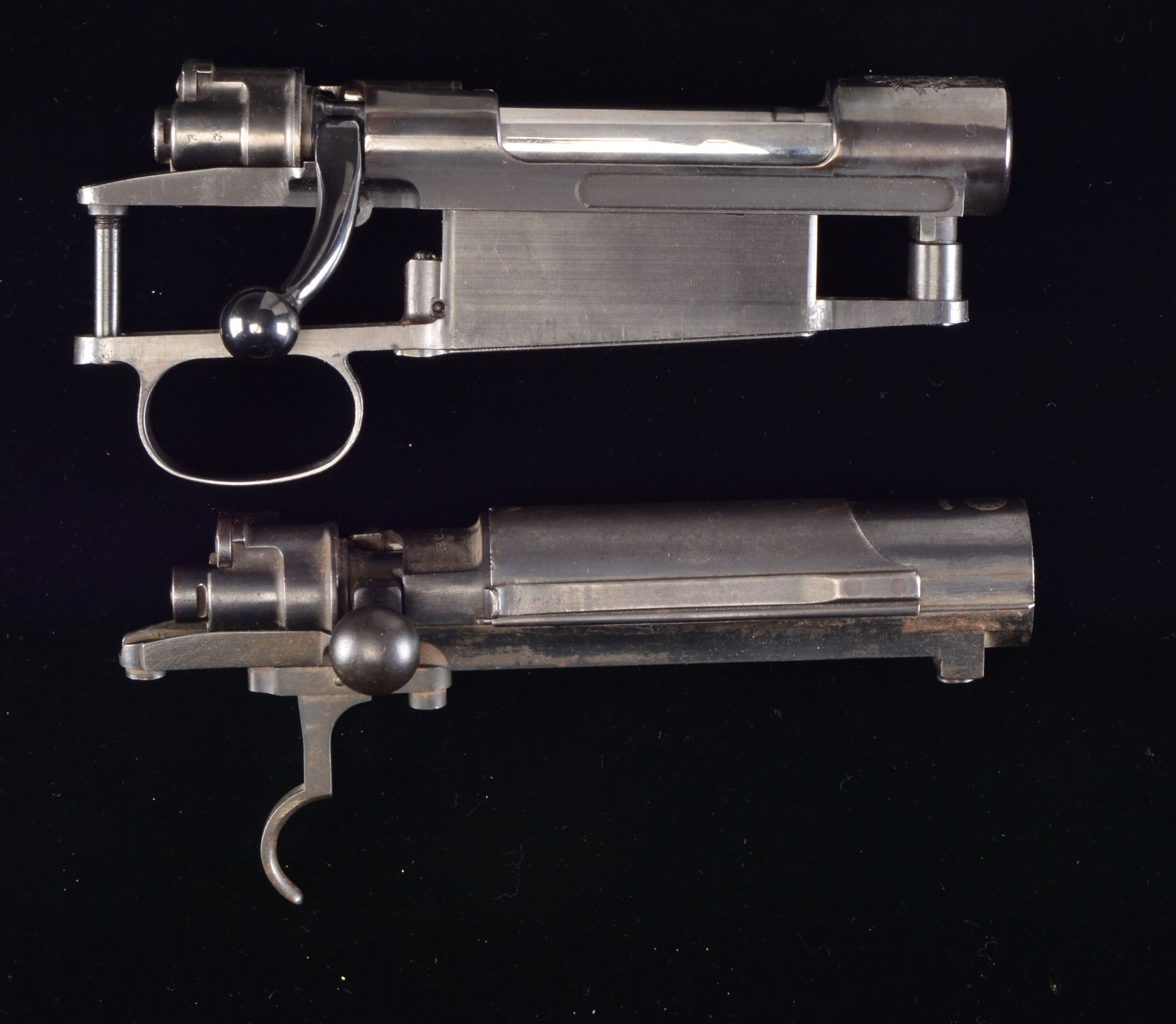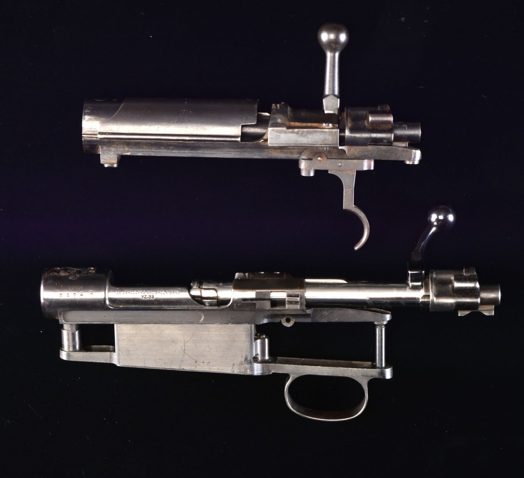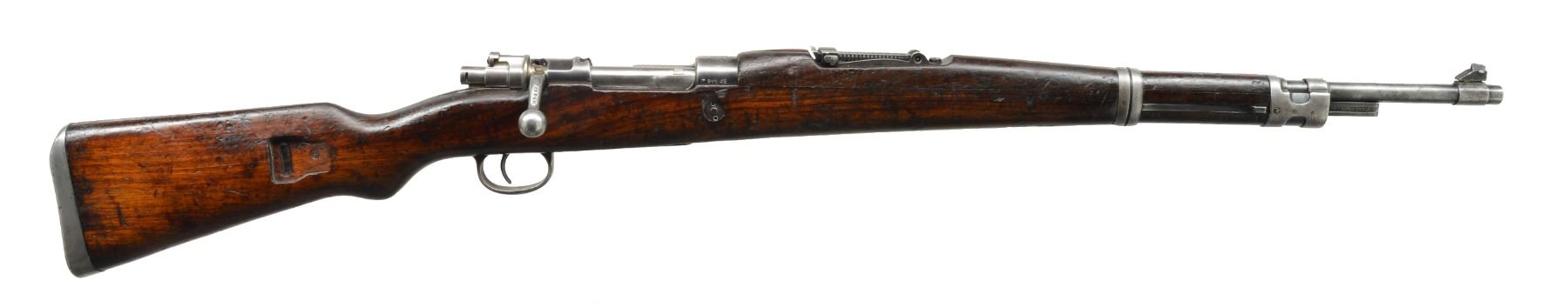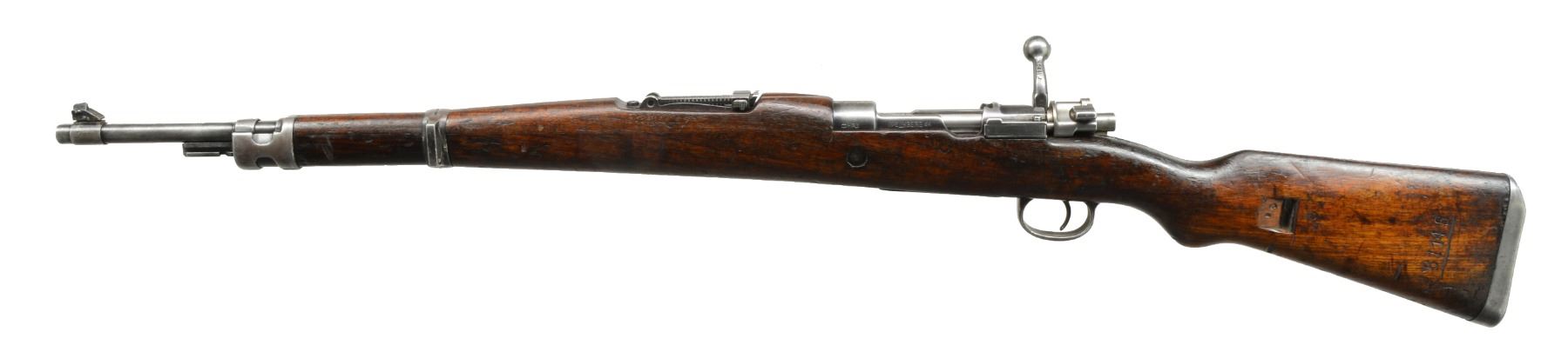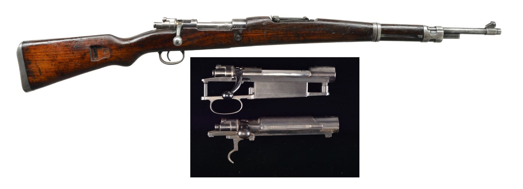 1) ZASTAVA MODEL 48A BOLT ACTION RIFLE. Cal. 8mm Mauser. S# R61146. Bbl. 23 1/4". Import marked only by electro penciled cal. on left side of receiver ring. All visible numbers match. Receiver marked on left rail w/ Cyrillic lettering & "44". Receiver ring marked on top w/ Yugoslavian crest & "M48A". Turned down bolt knob is flattened on under side. Tangent rear sight graduated to 2,000m. Inverted V front sight. Cleaning rod is not present. Bayonet bar present. Provision for side sling. Fabricated upper band, milled lower band. Stamped trigger guard w/ removable floorplate. Cup type buttplate. Walnut stock set is marked w/ scattered acceptance marks. CONDITION: stock set has wear, dents, staining & scratches throughout. Has 2" crack behind receiver tang. Metal turning gray has traces of blue w/ wear & scratches. Fair worn bore w/ fine pitting ahead of chamber. (20-577/RW). CURIO. 2) CZ VZ33. S# 5172B. Sporterized military action w/ crest over front bridge. Drilled & tapped for scope bases. Forged & lowered bolt handle w/ flattened underside of knob having checkering. Bolt root numbered "1957". Standard 30-06 sized bolt face. Bright bolt body & blued handle w/ military shroud (S#1877) & cocking piece (S#776) having #19 safety. Lower portion of receiver below stock line has milled lightening cuts on each side. Missing bolt stop/ejector assembly. Includes floorplate & box mag. assembly but no trigger components. Front scope mt. hole in rear bridge goes partly through prior plugged hole. Good usable condition as is because scope bases will hide flaws. (20-579/NW). MODERN. 3) KOSHIKAWA MODEL 1903 (TYPE 45). Cal. 8mm Siamese Mauser. S# 32241. Complete upper half of action w/ dust cover; no trigger guard or box mag. Complete Asian markings. Left side of receiver has Koishikawa Arsenal symbol. Action often used for 45-70 & 444 Marlin conversions. Good overall appearance w/ scattered peppery oxidation; retains original Asian characters w/ electro engraved S# on left side of receiver. (20-580/NW). MODERN. $350-550.