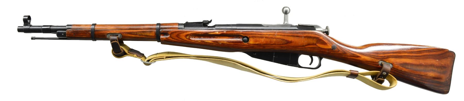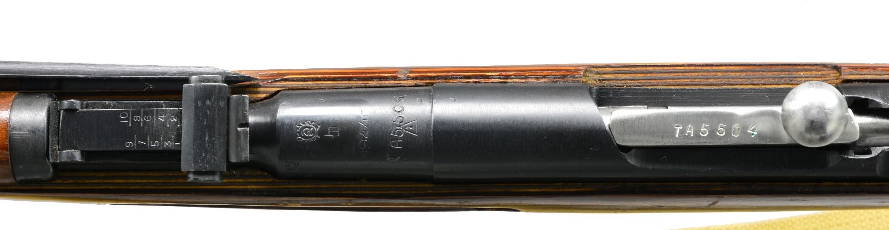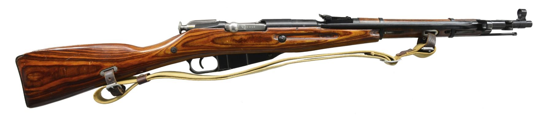 Cal. 7.62x54R. S# TA5504. Bbl. 20 1/4" import marked on right side. Rnd. receiver. Straight bolt handle. Bbl. is marked w/ Izhevsk Arsenal marking dated "1944". Tangent rear sight graduated to 1,000m. Post front sight w/ protective hood. Folding 12 1/4" spike bayonet. Cleaning rod is present. Has sling slots. Green web sling w/ leather collars. Laminated buttstock & hardwood handguard. Bands retained by springs. Transverse reinforcing bolt at wrist. CONDITION: stock has replaced wood at toe. Arsenal rework finish w/ light wear & scattered handling marks. Metal has 90% arsenal rework finish w/ light wear. Good shiny bore w/ light wear to lands. (20-226/RW). CURIO. $300-450.