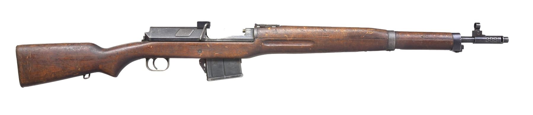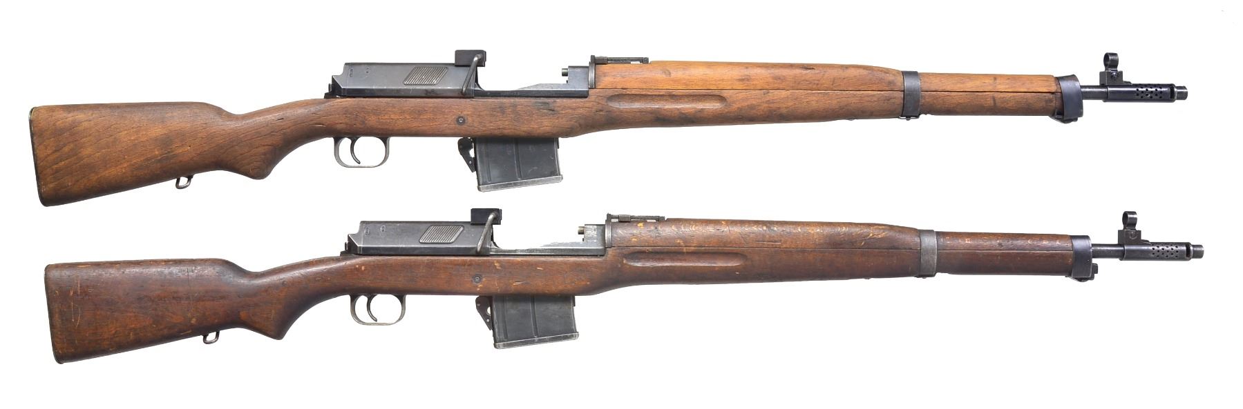 BOTH: cal. 8mm Mauser. Bbls. 25 5/8" including flash suppressor. Import marked on bbl. Receivers are stamped on right rail "HAKIM 7.9mm MADE IN EGYPT". Receivers marked on left side in Arabic. Tangent rear sights w/ Arabic graduations. Blade front sights w/ protective hoods adj. for windage. Provisions for side sling. 2 Piece hardwood stocks. MAGS: 1 detachable 10 rd. for each rifle. 1) S# 27807. CONDITION: stock set has sanding marks, light wear & staining throughout. Metal has 70% original finish w/ thinning, wear & scattered scratches. Very good shiny bore. (19-5957/RW). 2) S# 40675. CONDITION: hardwood stock set has remnants of white rack number on left side of butt. Stock set has moderate wear, dents, staining & scratches throughout. Metal has 50% original thinning finish w/ wear, scattered sm. dents & scratches. Good bore w/ light wear to lands. (19-5958/RW). BOTH CURIO. $600-1,000.