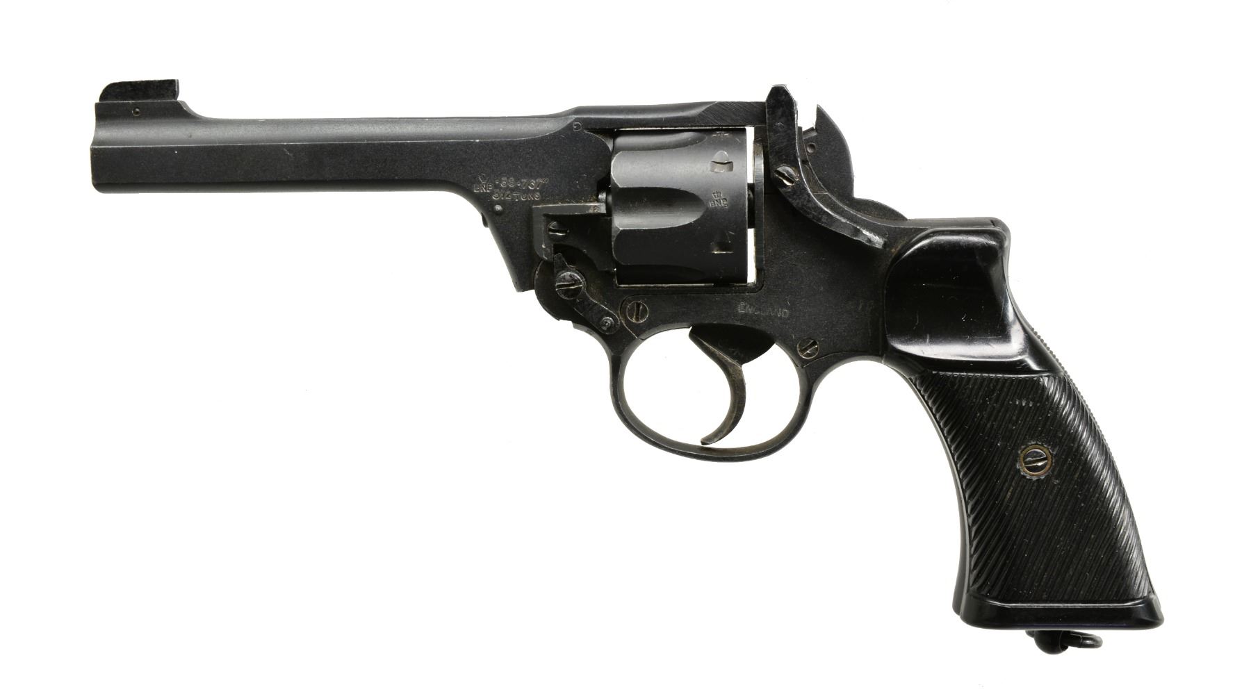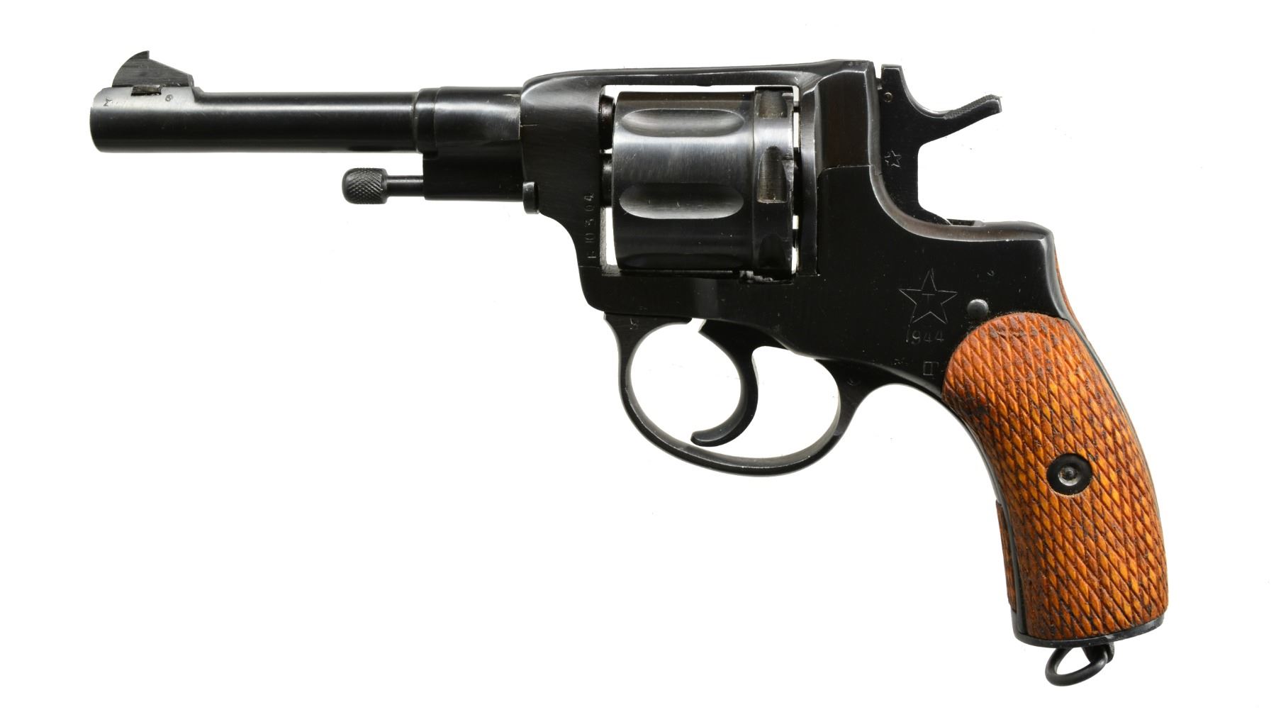 1) ENFIELD NO. 2 MK I**. Cal. 38 S&W. S# U4009. Bbl. 5". Mfg. for tank use having spurless hammer operating DAO. Grooved black plastic grips w/ thumb & finger recesses. Lanyard loop in butt. "ENGLAND" on sideplate above trigger. Matching numbered bbl. & cyl. Numerous British proofs throughout. CONDITION: all aspects near excellent as refinished. (19-5793/NW). 2)TULA 1895 NAGANT. Cal. 7.62 X 38R. S# 189501513(b yu 304). Bbl. 4 1/2". Mfg. 1944 w/ matching numbered cyl. 189501513 is ATF assigned S# for import through Century Arms; B YU 304 is translated Russian S#. Checkered hardwood grips plus lanyard loop at butt. CONDITION: all aspects near excellent as arsenal quality refinished including bore. (19-5794/NW). BOTH CURIO. $750-1,000.