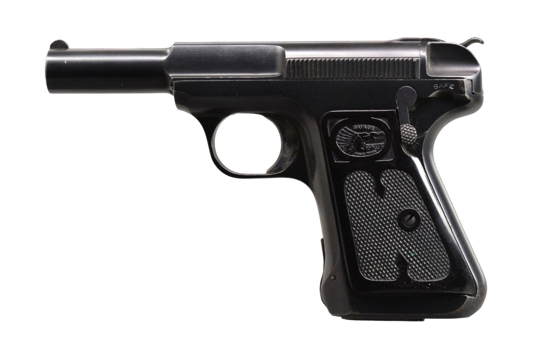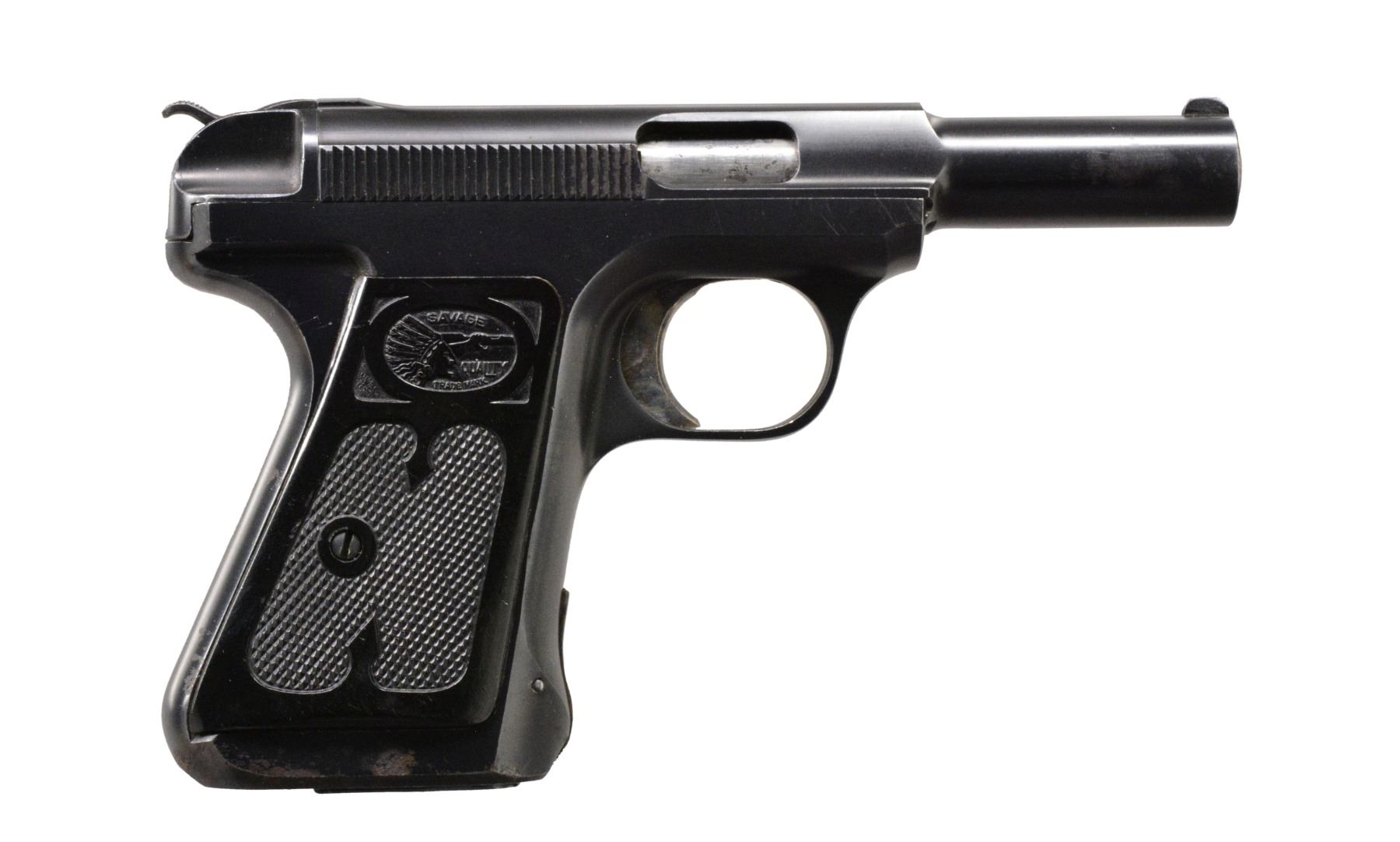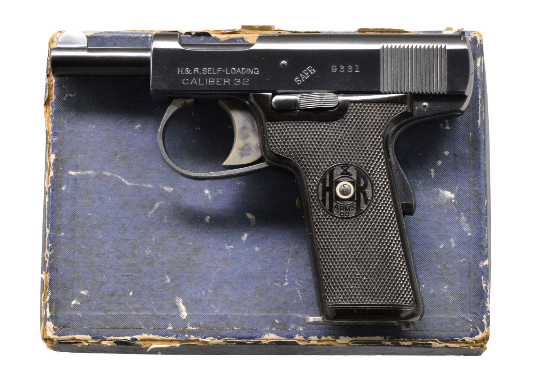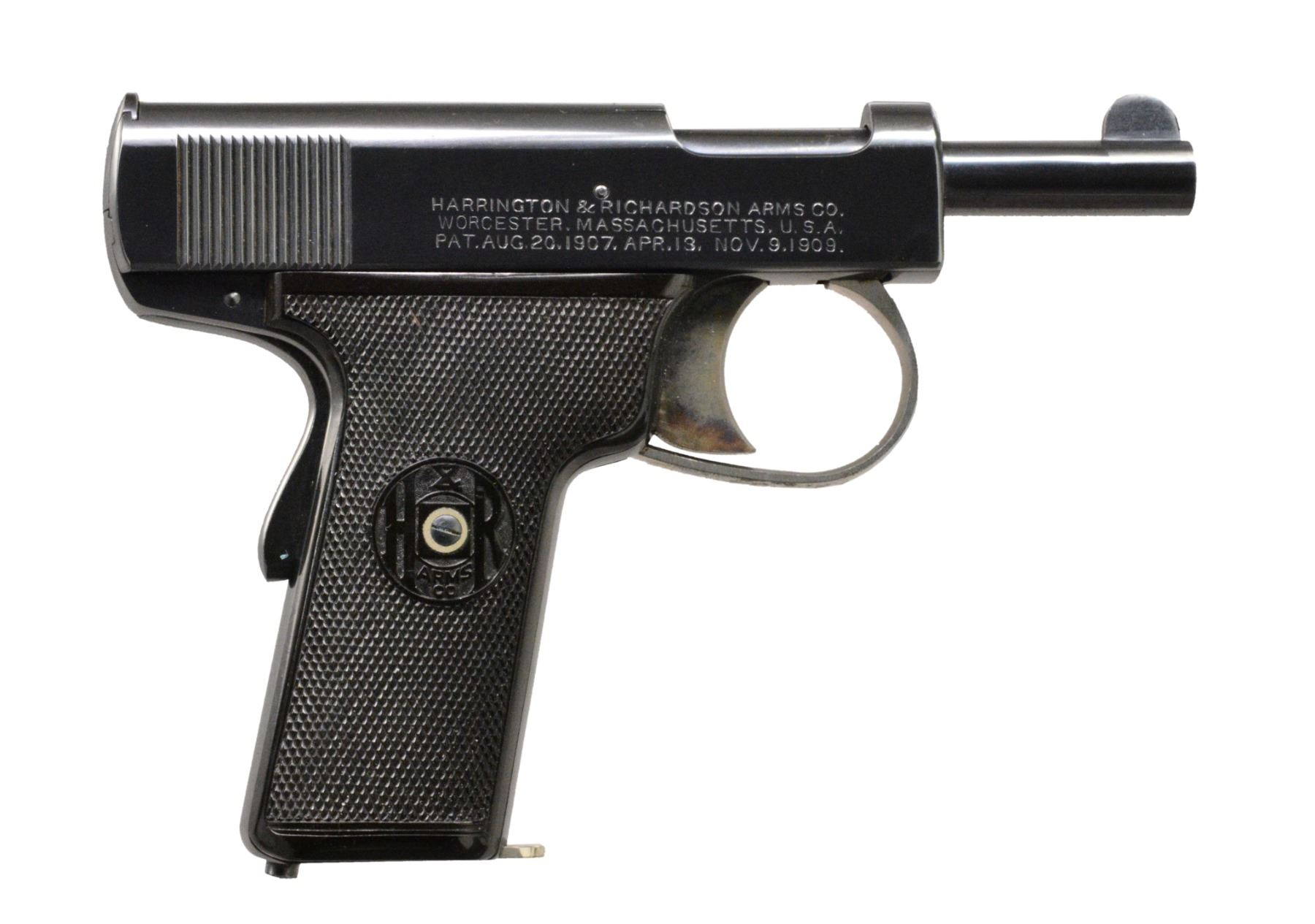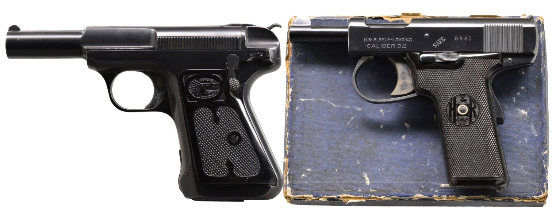 BOTH: cal. 32 ACP. 1) SAVAGE MODEL 1907. S# 234570. Bbl. 3 3/16". Blue finished exposed hammer action w/ case colored trigger. 2 Piece checkered Indian head hard rubber grips. Mfg. 1910-1917. MAGS: 1 detachable 9 rd. CONDITION: 90% lightly worn blue w/ spots of pitting on grip frame. Trigger has good case colors. Grips show wear & handling marks. Bright bore w/ sharp rifling. (19-5719/DS). 2) HARRINGTON & RICHARDSON SELF LOADING. S# 9331. Bbl. 3 1/2". Blue finished action w/ nickel finished trigger guard & case colored trigger. 2 Piece checkered hard rubber grips. Mfg. 1914-1924. MAGS: 1 detachable 8 rd. UNATTACHED ACCESSORIES: 1 piece blue box w/ pistol info inside of list. Box is tattered w/ torn corners. CONDITION: 98% metal finish showing sm. spots of corrosion on slide. Very good grips. Bright bore w/ sharp rifling. (19-5736/DS). BOTH CURIO. $600-900.