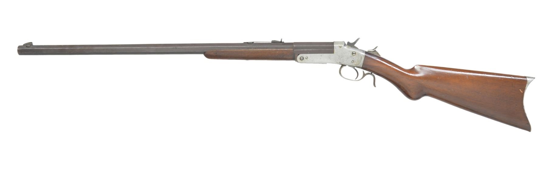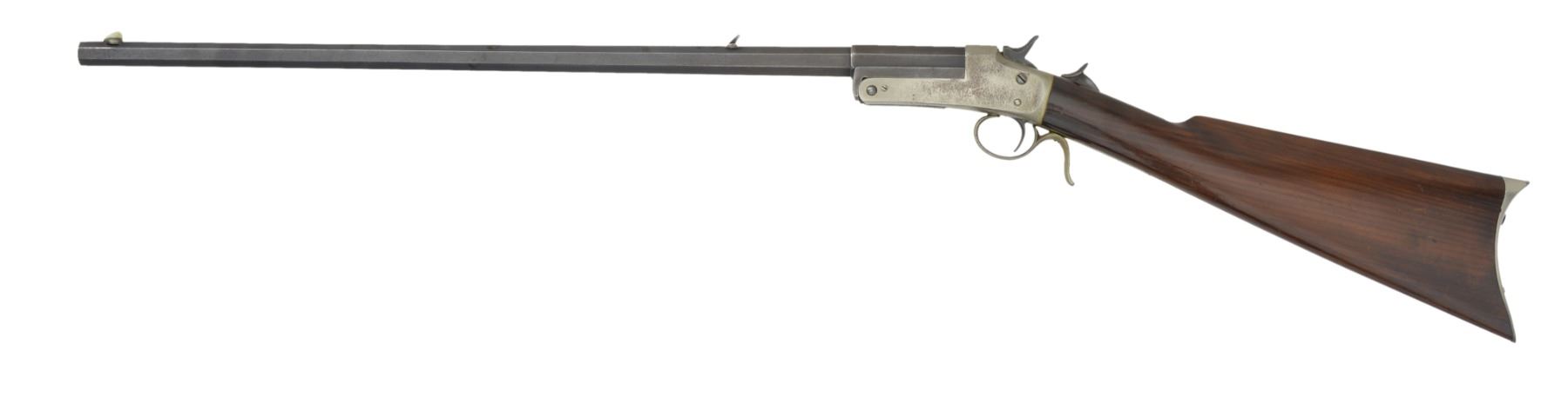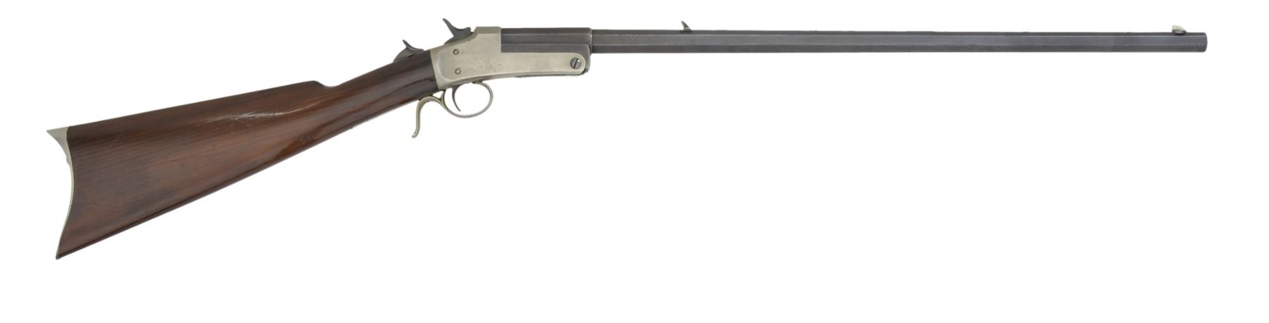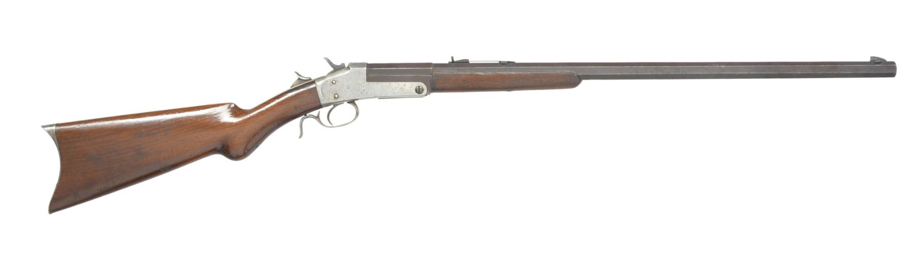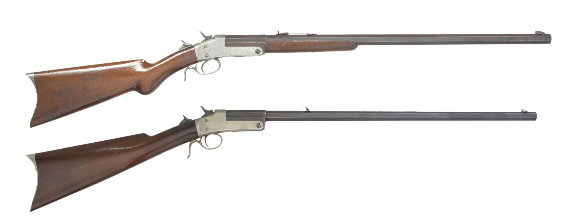 BOTH: mfg. in Philadelphia, PA 1880's-1890's. Exposed hammer action w/ thumb piece opener on top tang. 1) Cal. 32 RF. S# 1271. Bbl. 25" medium weight oct. w/ Rocky Mountain front sight & U notch sporting rear sight. Nickel finished action w/ conventional trigger & finger curl trigger guard. Walnut forearm & rnd. knob stock w/ nickel finished crescent steel buttplate. CONDITION: bbl. finish has faded to brown showing spots of light corrosion. Action retains faint traces of nickel in protected areas fading to gray & showing scattered spots of light pitting. Forearm has worn appearance w heavy wear along right bbl. channel. Original stock finish showing numerous scratches & handling marks. Dark pitted bore. (01-17183/DS). 2) Cal. 22 RF. S# 1121. Bbl. 24" lightweight oct. w/ German silver blade front sight & fixed V notch rear sight. Nickel finished action w/ conventional trigger & finger curl trigger guard. Rifle is not fitted for forearm. Straight grip walnut stock w/ nickel finished crescent steel buttplate. CONDITION: bbl. retains 40% worn blue fading to brown & showing spots of surface corrosion & light pitting. Action retains 70% nickel blending w/ spots of flaking. Stock has good finish showing scratches & marks. Dark pitted bore. (01-17184/DS). BOTH ANTIQUE. $800-1,200.