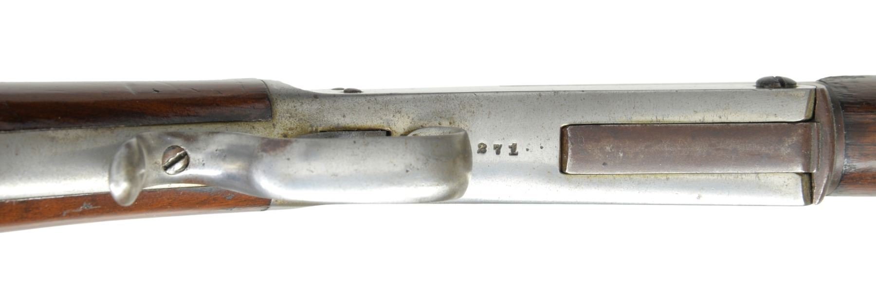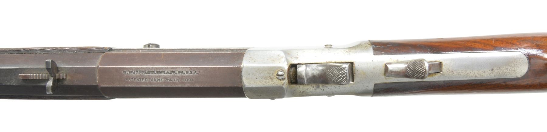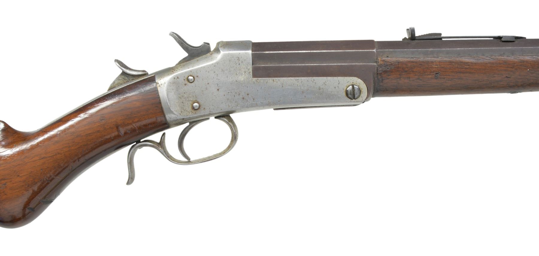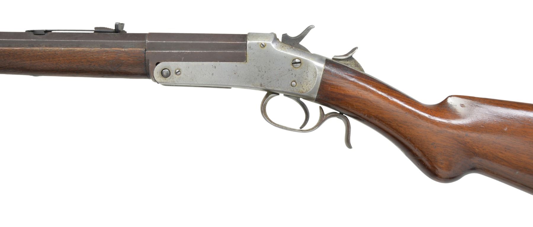 BOTH: mfg. in Philadelphia, PA 1880's-1890's. Exposed hammer action w/ thumb piece opener on top tang. 1) Cal. 32 RF. S# 1271. Bbl. 25" medium weight oct. w/ Rocky Mountain front sight & U notch sporting rear sight. Nickel finished action w/ conventional trigger & finger curl trigger guard. Walnut forearm & rnd. knob stock w/ nickel finished crescent steel buttplate. CONDITION: bbl. finish has faded to brown showing spots of light corrosion. Action retains faint traces of nickel in protected areas fading to gray & showing scattered spots of light pitting. Forearm has worn appearance w heavy wear along right bbl. channel. Original stock finish showing numerous scratches & handling marks. Dark pitted bore. (01-17183/DS). 2) Cal. 22 RF. S# 1121. Bbl. 24" lightweight oct. w/ German silver blade front sight & fixed V notch rear sight. Nickel finished action w/ conventional trigger & finger curl trigger guard. Rifle is not fitted for forearm. Straight grip walnut stock w/ nickel finished crescent steel buttplate. CONDITION: bbl. retains 40% worn blue fading to brown & showing spots of surface corrosion & light pitting. Action retains 70% nickel blending w/ spots of flaking. Stock has good finish showing scratches & marks. Dark pitted bore. (01-17184/DS). BOTH ANTIQUE. $800-1,200.