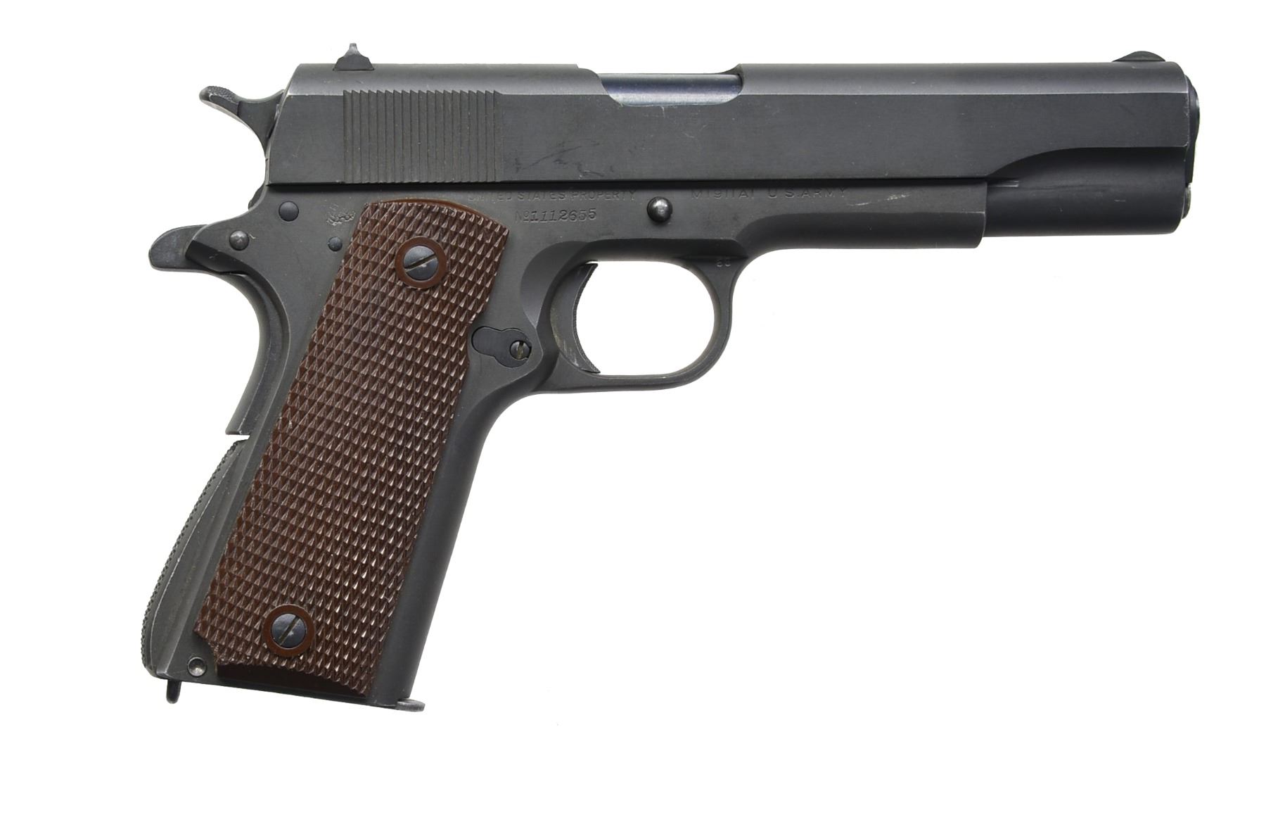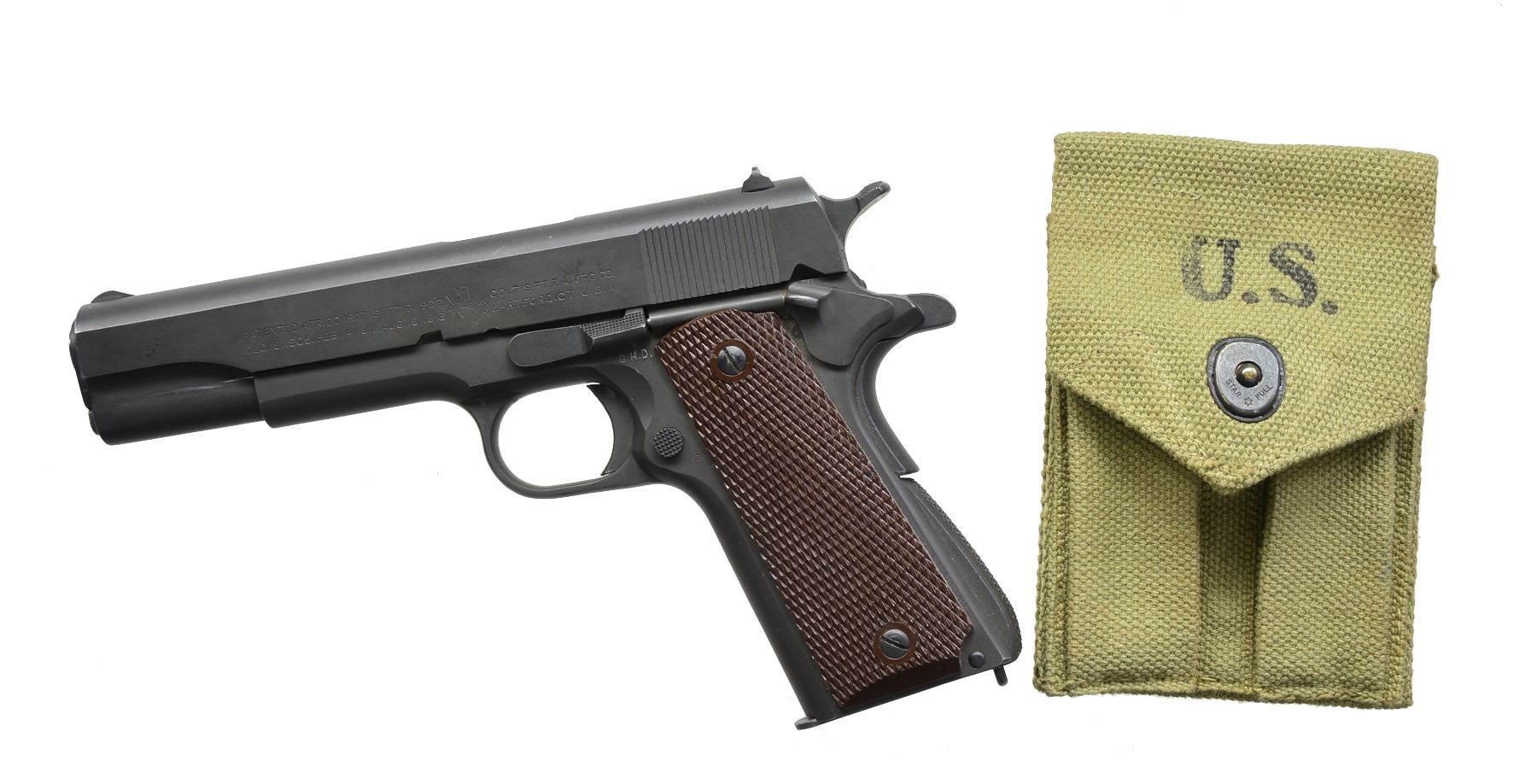 Cal. 45 ACP. S# 1112655. Bbl. 5" marked above left leg w/ "COLT 45 AUTO" (correct Type 6), "P" on leg. Mfg. 1943 w/ correct Coltwood lg. ring Type 7 grips & matching numbered slide. All other features correct for model including sights & coarse checkered arched mainspring housing (per J.C. Harrison reference guide). MAGS: 1 near excellent parkerized Scovill 7 rd. but not "C-S" marked for Colt. UNATTACHED ACCESSORIES: near excellent U.S. marked Avery 1942 dbl. canvas mag pouch. CONDITION: overall near excellent w/ some very sm. flaws; occasional light mark such as from improper slide stop installation & wear from dust cover rubbing on front of slide. A very nice 1943 Colt w/ near excellent bore & grips. (20-1202/NW). CURIO. $1,000-1,500.