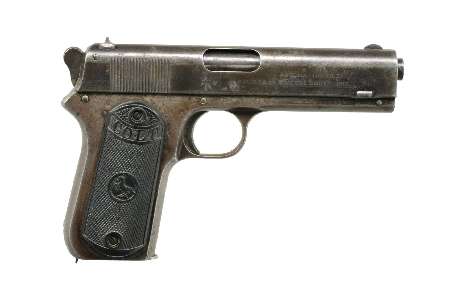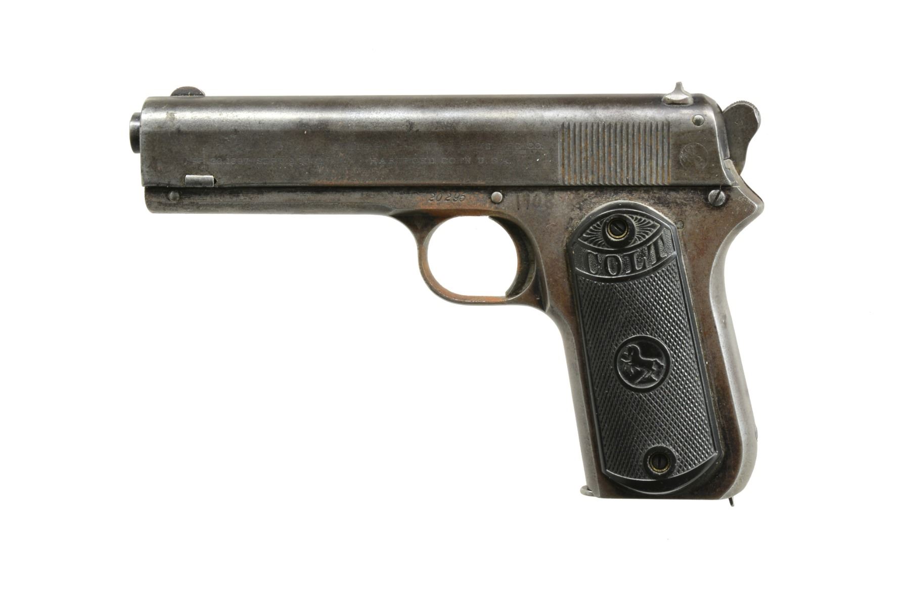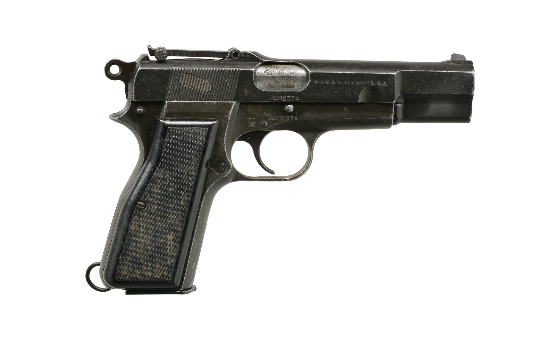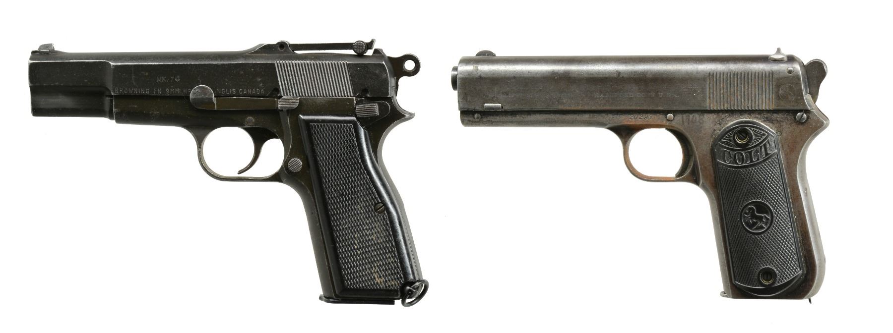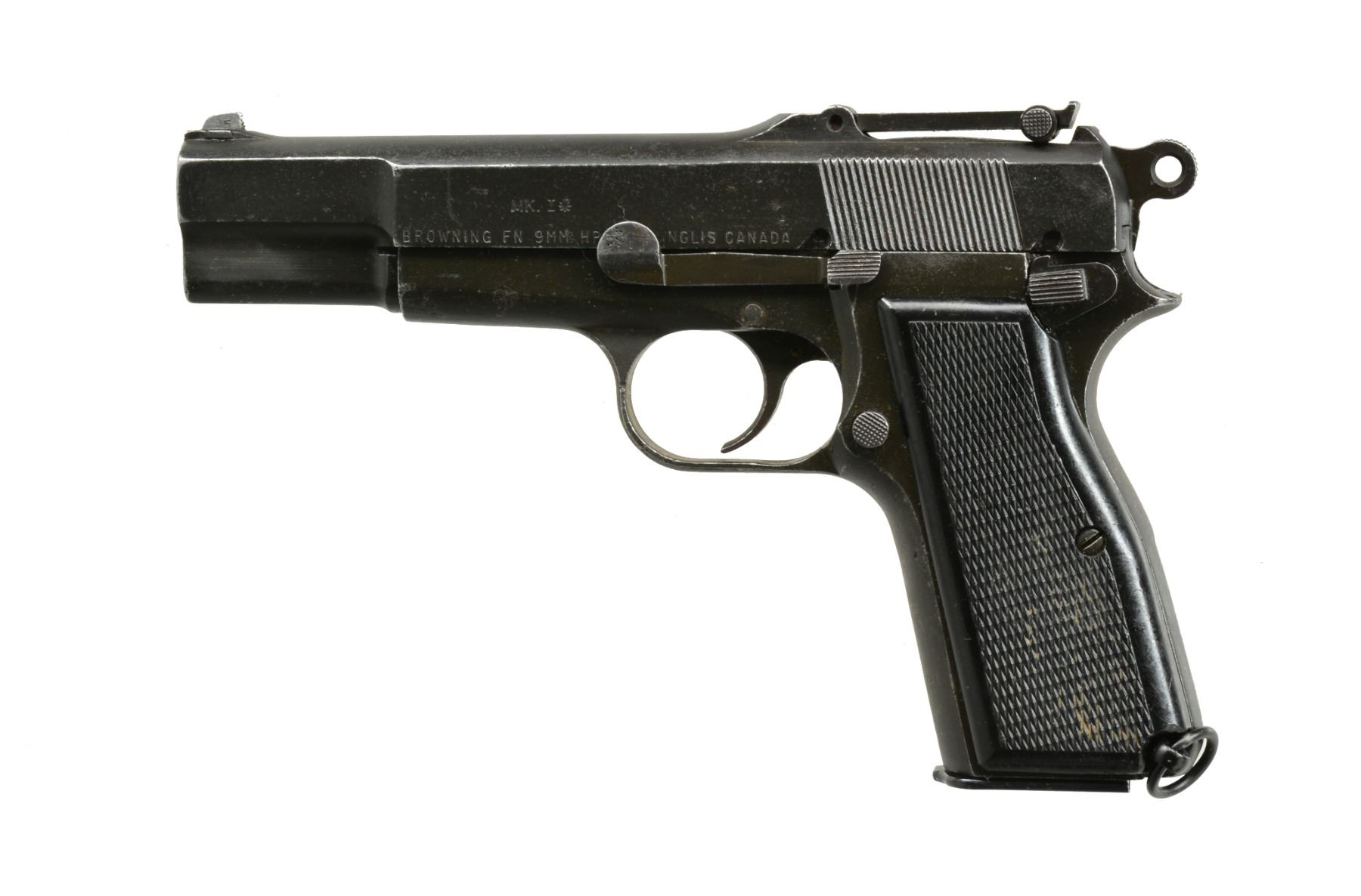 1) INGLIS MK. I * HIGH POWER. Cal. 9mm. S# 3CH2374. Bbl. 4 3/4". Serrated blade front sight w/ tangent rear sight. Single action pistol w/ ring hammer, lanyard ring at butt & slotted backstrap for stock attachment. 2 Piece checkered hard rubber grips. MAGS: 1 modern Italian marked 16 rd. replacement. Mag. latch has stiff operation w/ replacement mag. CONDITION: metal retains 90% of added flat black paint. Grips show moderate wear. Bore has darkened appearance w/ lightly worn rifling. (20-982/DS). 2) COLT 1903 POCKET. Cal. 38 Rimless. S# 20295. Bbl. 4 1/2". Semi circular front sight w/ fixed U notch rear sight. Early production model w/ rounded hammer. 2 Piece checkered grips. MAGS: 1 detachable 7 rd. CONDITION: sm. amount of dull blue fading to brown patina showing spots of corrosion & light pitting. Right grip panel is cracked. Bore has darkened appearance & worn rifling. (20-990/DS). BOTH CURIO. $600-900.