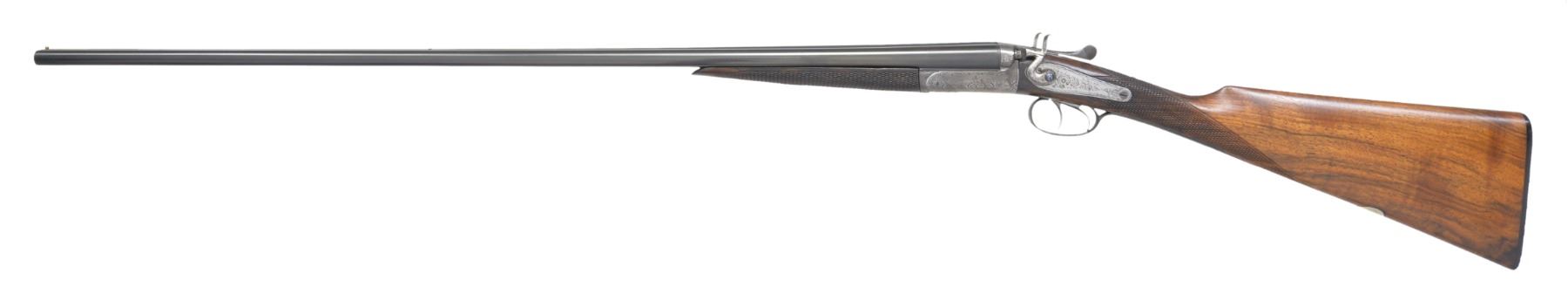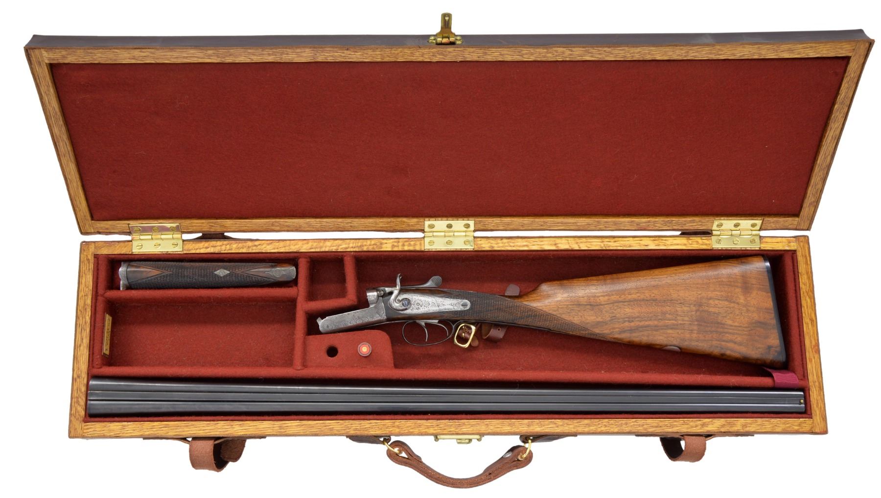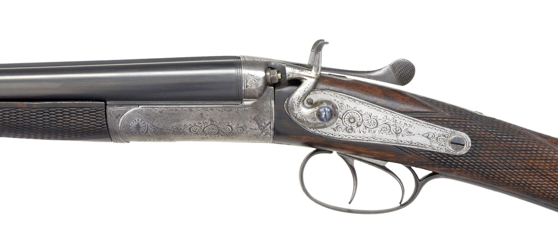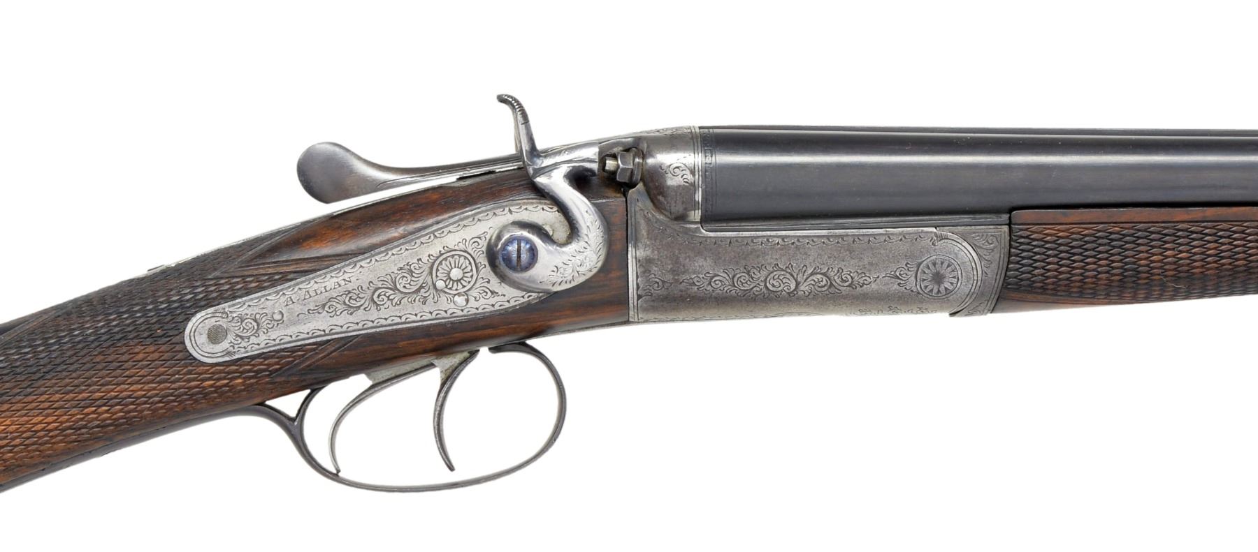 Cal. 410, 3". S# H6322. Bbls. 28" dovetailed, fitted w/ game rib, engraved "A. Allan. Glasgow". Bbl. flats are stamped w/ old Birmingham proofs & 1999 reproofs for 3" chambers. Rnd. bodied top lever action is fitted w/ isolated back spring locks w/ sm. serpentine hammers. Action & locks are engraved w/ 40% scroll. "A. Allan" is on each lockplate. Sm. bow trigger guard w/ scroll on bow has S# on tang. Nicely fiddle figured, lightly marbled European walnut straight grip buttstock measures 14 3/8" over ribbed horn buttplate. Point pattern checkering is at grip & a vacant silver oval is on toeline. Matching splinter forend w/ shaped metal tip, has spring tension release. Bore diameters at muzzles: left - .400, choke .010 ? (mod), right - .410, choke .000 ? (cyl). Wall thickness: left - .030, right - .025. DAC: 1 3/8". DAH: 2 5/16". Cast approx. 1/4" off. LOP: 14 3/8". WEIGHT: 4 lbs. 4 oz. UNATTACHED ACCESSORIES: custom made oak & dark leather case is lined in burgundy felt & is in excellent condition. CONDITION: nicely refurbished. Bbls. have nearly all of a fine quality reblue. Action cleaned to silver gray w/ some pinprick pitting & areas on left side of action somewhat etched. Engraving on trigger guard picked up. Stocks lightly refinished in oil w/ some light marks. Flat top checkering recut. Bores are bright & shiny. Action is tight. Locks strong. Top tang is broken just forward of tang screw. (19-5775/MGM39). CURIO. $1,200-1,800.