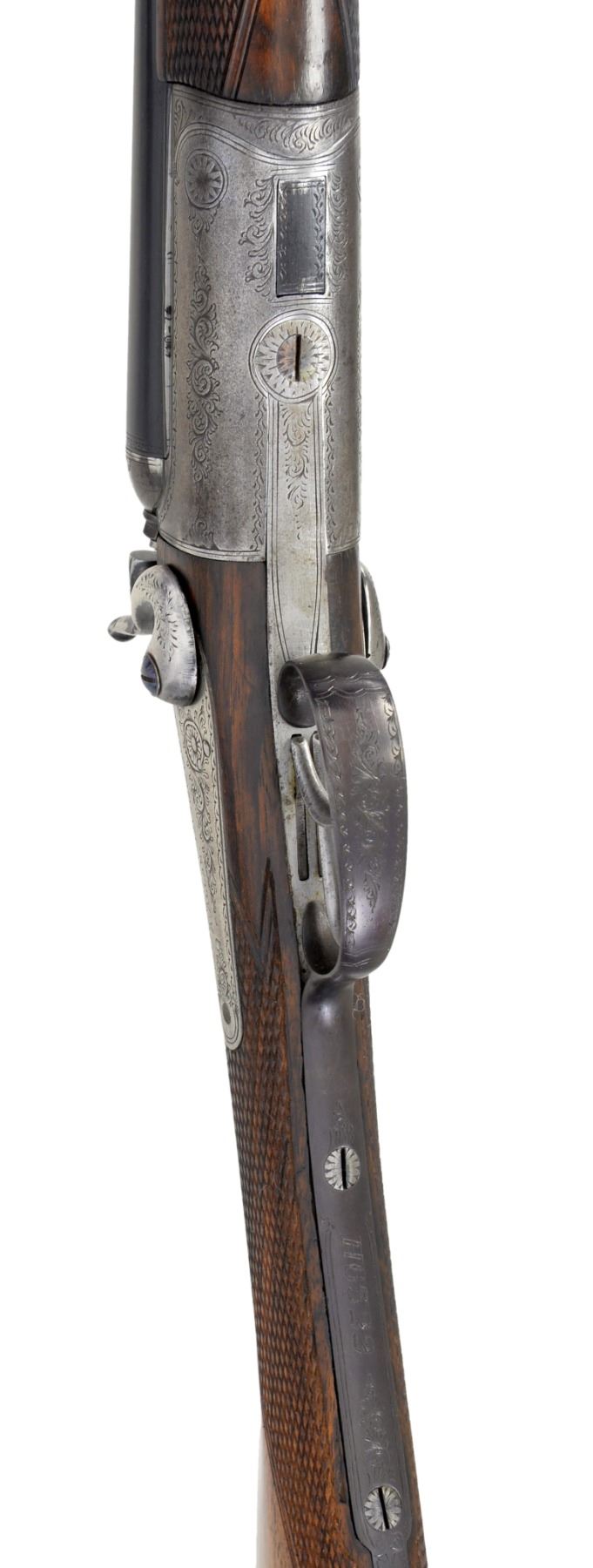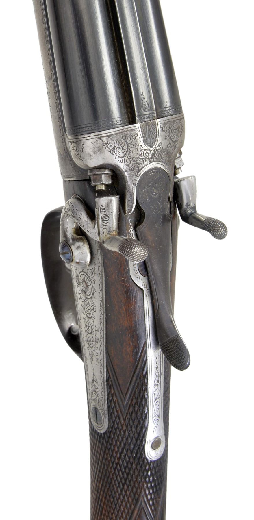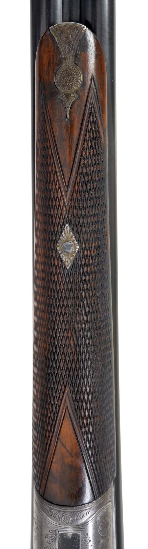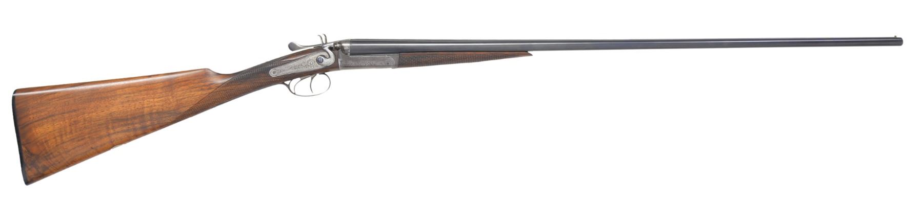 Cal. 410, 3". S# H6322. Bbls. 28" dovetailed, fitted w/ game rib, engraved "A. Allan. Glasgow". Bbl. flats are stamped w/ old Birmingham proofs & 1999 reproofs for 3" chambers. Rnd. bodied top lever action is fitted w/ isolated back spring locks w/ sm. serpentine hammers. Action & locks are engraved w/ 40% scroll. "A. Allan" is on each lockplate. Sm. bow trigger guard w/ scroll on bow has S# on tang. Nicely fiddle figured, lightly marbled European walnut straight grip buttstock measures 14 3/8" over ribbed horn buttplate. Point pattern checkering is at grip & a vacant silver oval is on toeline. Matching splinter forend w/ shaped metal tip, has spring tension release. Bore diameters at muzzles: left - .400, choke .010 ? (mod), right - .410, choke .000 ? (cyl). Wall thickness: left - .030, right - .025. DAC: 1 3/8". DAH: 2 5/16". Cast approx. 1/4" off. LOP: 14 3/8". WEIGHT: 4 lbs. 4 oz. UNATTACHED ACCESSORIES: custom made oak & dark leather case is lined in burgundy felt & is in excellent condition. CONDITION: nicely refurbished. Bbls. have nearly all of a fine quality reblue. Action cleaned to silver gray w/ some pinprick pitting & areas on left side of action somewhat etched. Engraving on trigger guard picked up. Stocks lightly refinished in oil w/ some light marks. Flat top checkering recut. Bores are bright & shiny. Action is tight. Locks strong. Top tang is broken just forward of tang screw. (19-5775/MGM39). CURIO. $1,200-1,800.