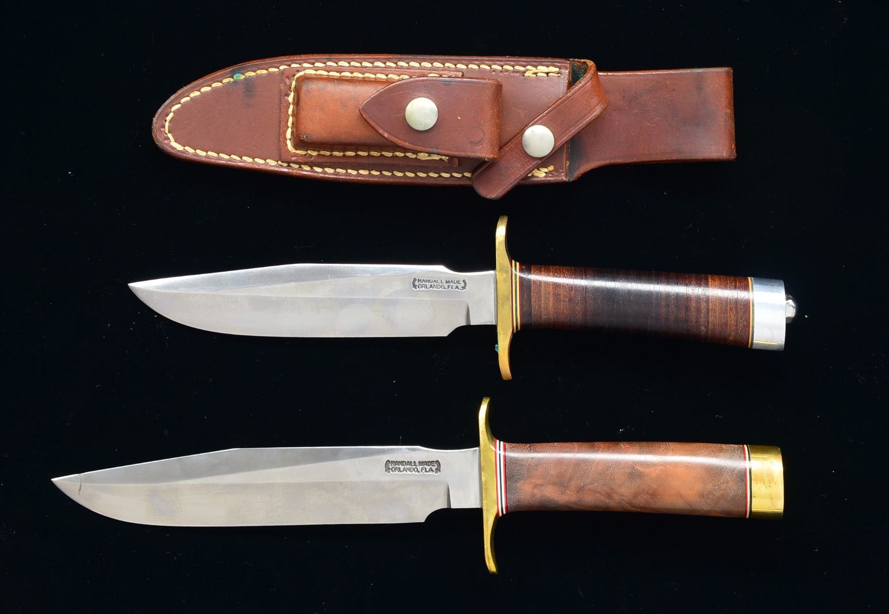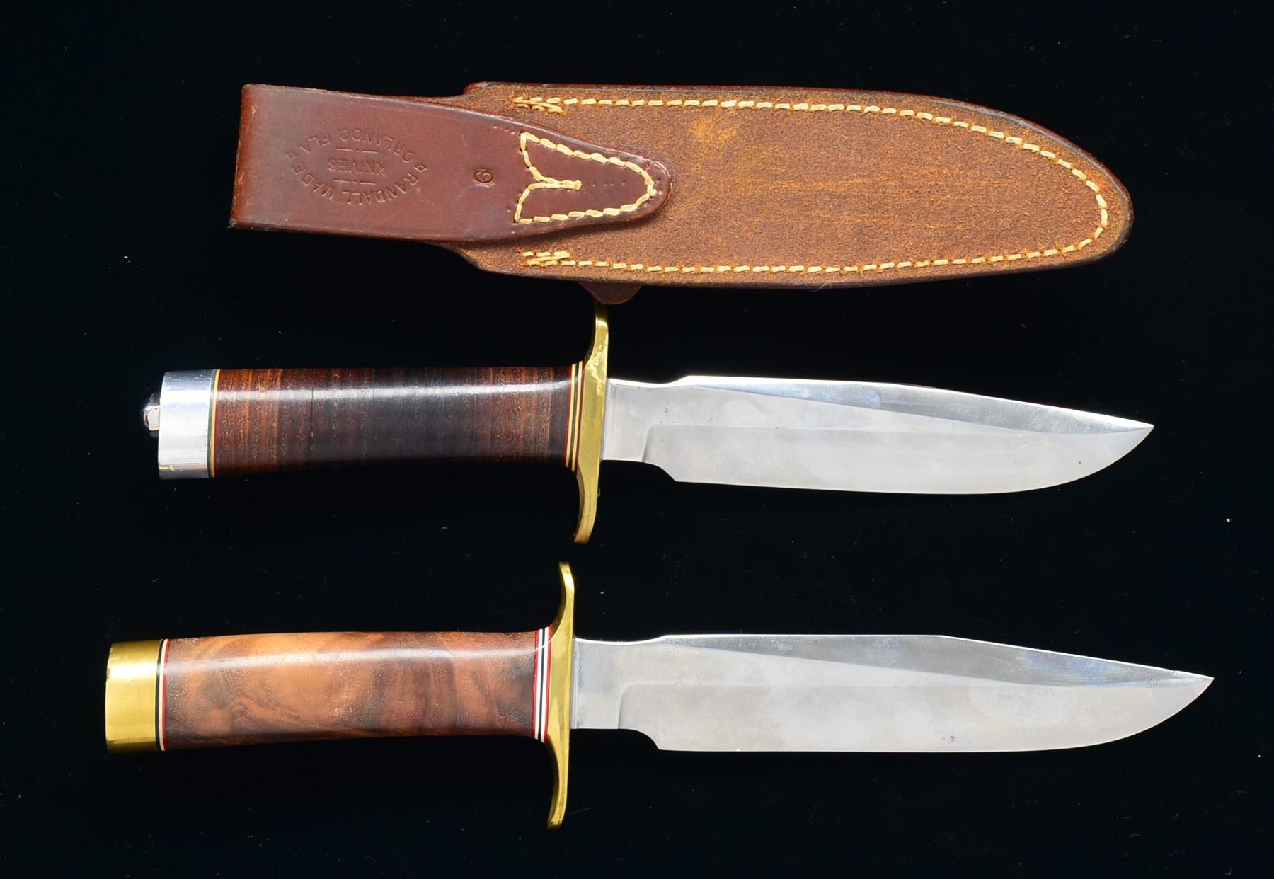 1) Blade length: 6" all purpose style. Overall length: 10 7/8". Standard shaped handle w/ stacked leather washers. Brass crossguard. Duralumin pommel w/ acorn nut finial. Blade marked on left side "RANDALL MADE ORLANDO, FLA.". Has brown leather sheath. Sheathe marked on back "RANDALL MADE ORLANDO, FLA" & "6". Has plain silver colored snaps & sharpening stone. CONDITION: knife in very good condition w/ bright blade having sm. spot of oxidation underneath next to crossguard. Brass crossguard has mustard coloration Sm. spots of staining. Leather washer handle has light handling marks. Pommel has scattered sm. scratches. Leather sheathe has tight stitching, light wear & sm. spots of staining. 2) Blade length: 7" all purpose style. Overall length: 11 7/8". Standard shaped hardwood handle w/ burl appearance. Brass crossguard & pommel w/ flat butt. Blade marked on left side "RANDALL KNIVES ORLANDO, FLA". CONDITION: bright blade has several spots of discoloration. Notable streak of discoloration approx. 1/2" behind tip. Brass parts show slight staining. Notable sm. dent on right side of pommel. Handle has very light wear w/ scattered tiny handling marks. (02-13555-5/RW). $800-1,100.