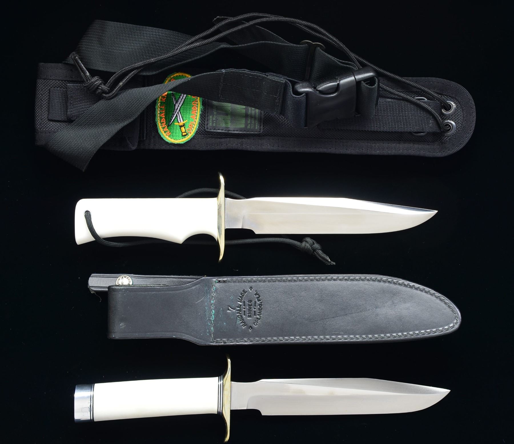 1) Blade length: 7" all purpose style. Overall length: 11 13/16". Nickel silver dbl. hilt. Standard shape ivorite handle. Duralumin butt. Left side of blade marked "RANDALL MADE KNIVES ORLANDO, FL". Black leather scabbard w/ Randall marked snaps. Has sharpening stone. Marked on back "7" & "RANDALL MADE KNIVES ORLANDO, FLA". CONDITION: all aspects including scabbard near excellent. 2) Blade length: 6 3/4" all purpose style. Overall length: 11 3/8". Nickel silver dbl. hilt. Single finger grip style 1 piece ivorite handle. Black nylon lanyard. Full length tang. Left side of blade marked "RANDALL MADE KNIVES ORLANDO, FL". Over the shoulder black nylon tactical style scabbard w/ provision for sharpening stone; not present. Scabbard marked on back "RANDALL KNIVES" crossed knife patch & Blackhawk Tactical nylon industries logo. CONDITION: all aspects of knife near excellent. Black nylon scabbard in very good condition except for brown stain across outside front. (02-13555-7/RW). $800-1,100.