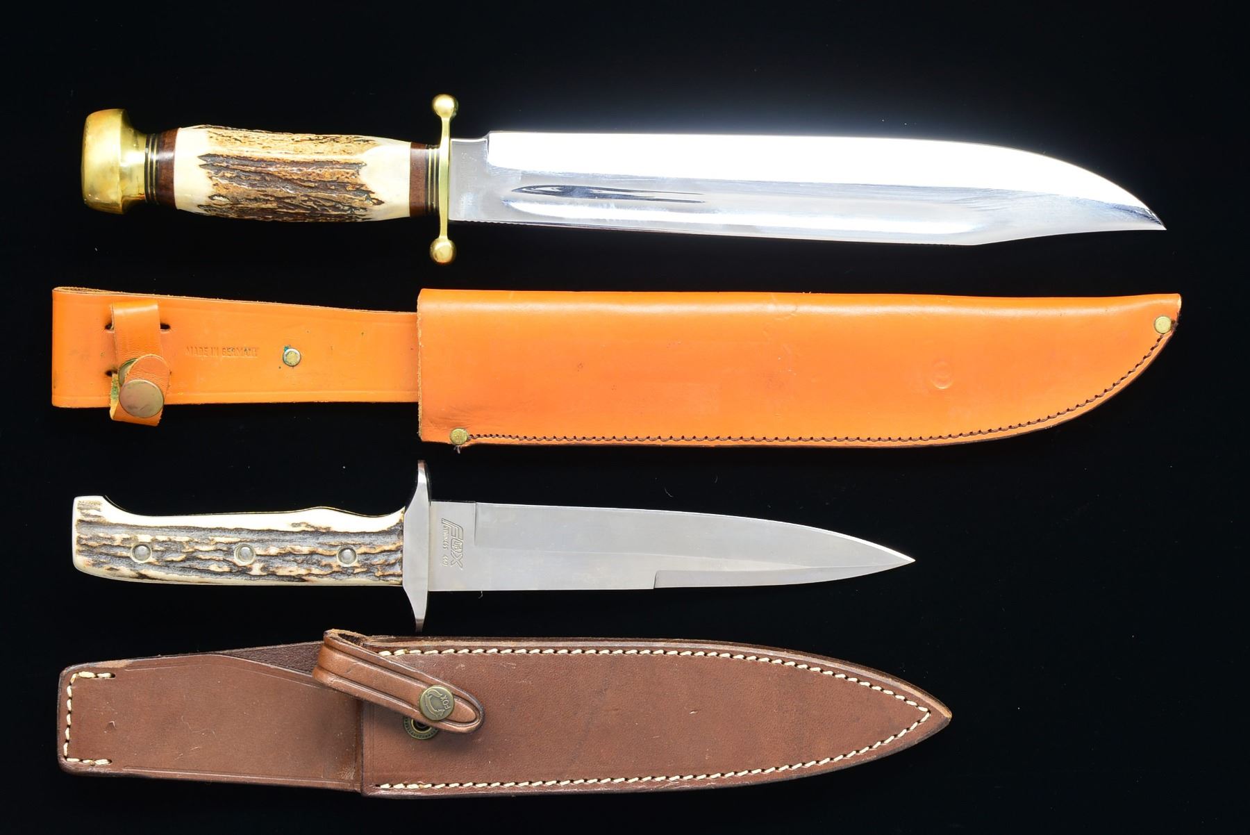 1) RUSSELL. Blade length: 10" fullered bowie style. Left ricasso marked "AG Russell Solingen Germany". Brass hilt w/ ball tips. Simulated stag handle w/ brass pommel. Brown leather sheath marked "MADE IN GERMANY". CONDITION: knife has very good overall appearance w/ very light wear. Blade has been lightly sharpened. Brass pommel & guard have patina & scattered stains. Scabbard in good serviceable condition w/ tight stitching. 2) FOX. Blade length: 6 3/4" spear point full tang blade w/ 3 3/4" false edge. Blade marked on left ricasso w/ Fox logo & "STAINLESS 440". Stainless steel dbl. hilt. Imitation stag horn grips fastened by 3 rivets. Grips have 1 finger groove. Unmarked brown leather scabbard. CONDITION: knife & scabbard in very good overall condition w/ scattered tiny handling marks. Scabbard has scattered handling marks w/ tight stitching. (02-13557-1/RW). $150-300.