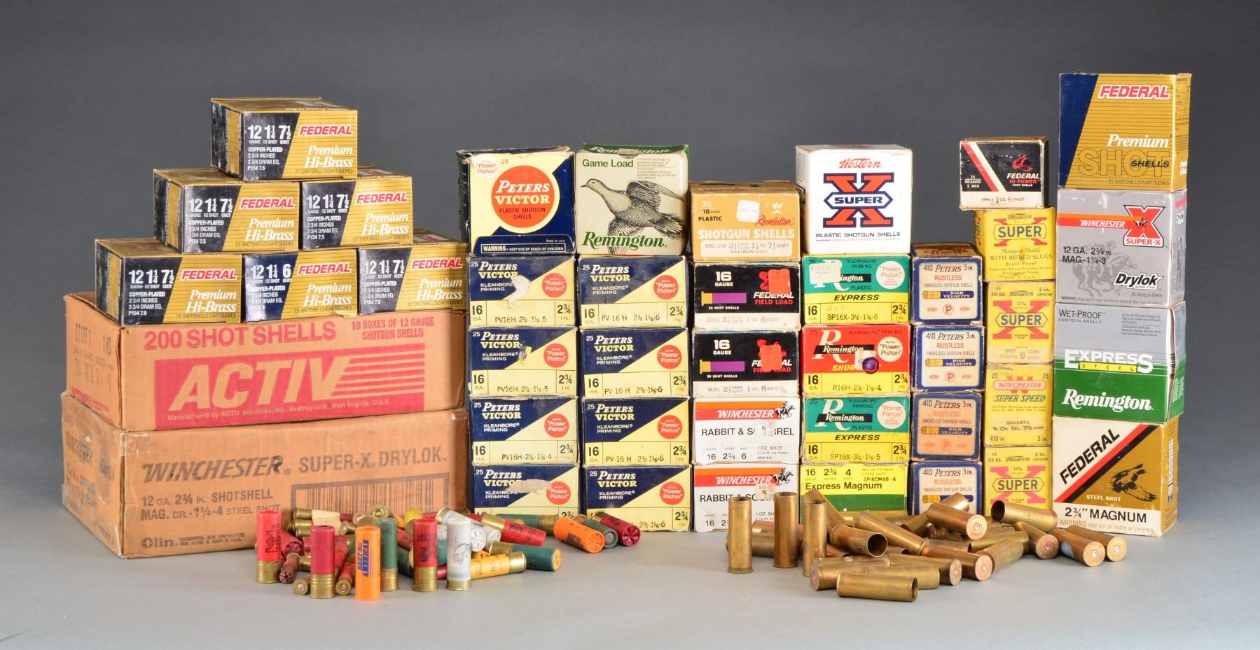 AMMO. BRASS SHELLS: box of over 95 - 12 Gauge fired brass shot shells. Most have Remington -UMC-Best head stamps w/ 1 or more marked Winchester. 410 SHOT SHELLS: 8 Remington-UMC Best 2 1/2" fired brass shot shells. / 4 Boxes of Peters Rustless High Velocity 3" in blue boxes w/ Mallard on front. / 1 Full & 2 partial boxes Win. 3". / 1 Box Federal High Power 3" paper shells. / 3 Full & 1 partial 5 packs of Western Super X 2 1/2" rifle slugs in 5 box carton missing lid. / Partial Box Win. Super X 3". 16 GAUGE SHOT SHELLS: 9 Full boxes & 1 partial box Peters 2 3/4" plastic shells in blue & yellow box w/ red circular Peters markings. / 3 Boxes of Remington Express. / 1 Box Remington Sure Shot. / 1 Part box Remington Game Load. / 2 Boxes Federal Field Load. / 1 Box Revelation. / 2 Partial Boxes Win. Rabbit & Squirrel. / 1 Box Western Super X. / 1 Partial Box Rem. Express Extra Long Range missing end flap. 12 GAUGE SHOT SHELLS: 6 Full & 1 partial Federal Premium 2 3/4" copper plated. / 1 Box 2 3/4" Super X Dry Lock steel shot. / 1 Box Rem. 2 3/4" Express Steel. / 1 Box Federal 2 3/4" Magnum steel shot. / 2 Boxes 5 rd. Win. Super X rifle slugs. / 2 Federal 5 rd. boxes rifles slugs. / 1 Box Win. Supreme XX Magnum turkey loads. / 1 Flat of 10 boxes Win. Drylok 2 3/4" steel shot. / 1 Flat 200 rd. Active 2 3/4" steel shot. MISC: 1 Gallon plastic bag of loose shot shells of mix cals. & brands. / 1 Partial Box. CCI 22 Magnum HP. (02-13409/DS). $200-400.