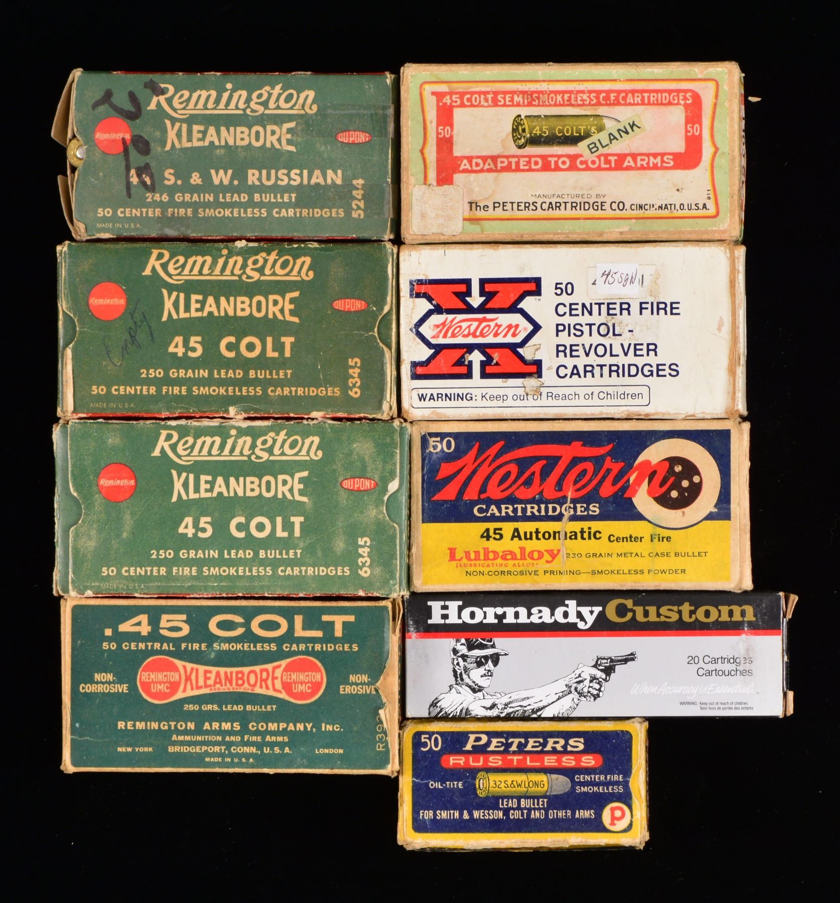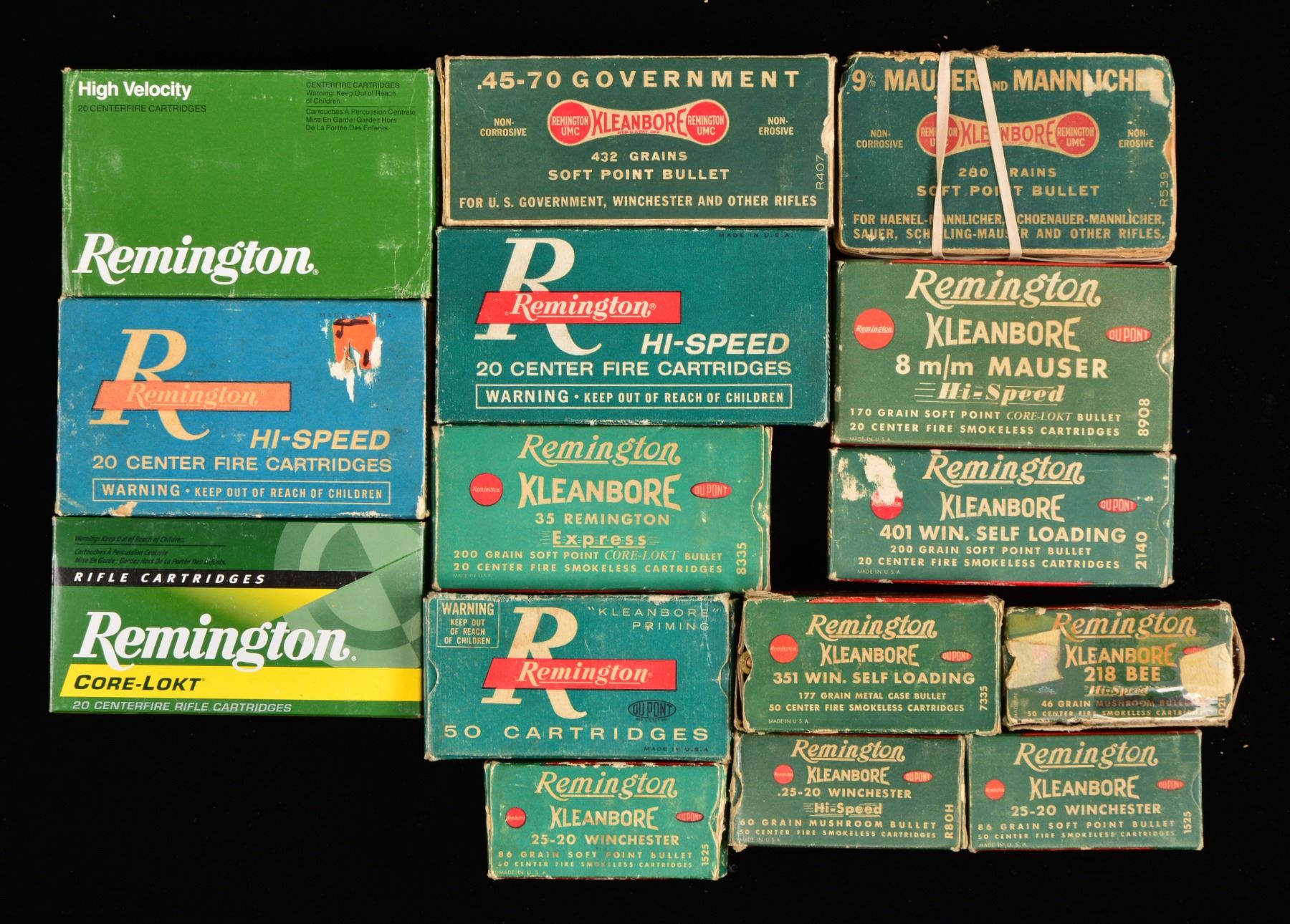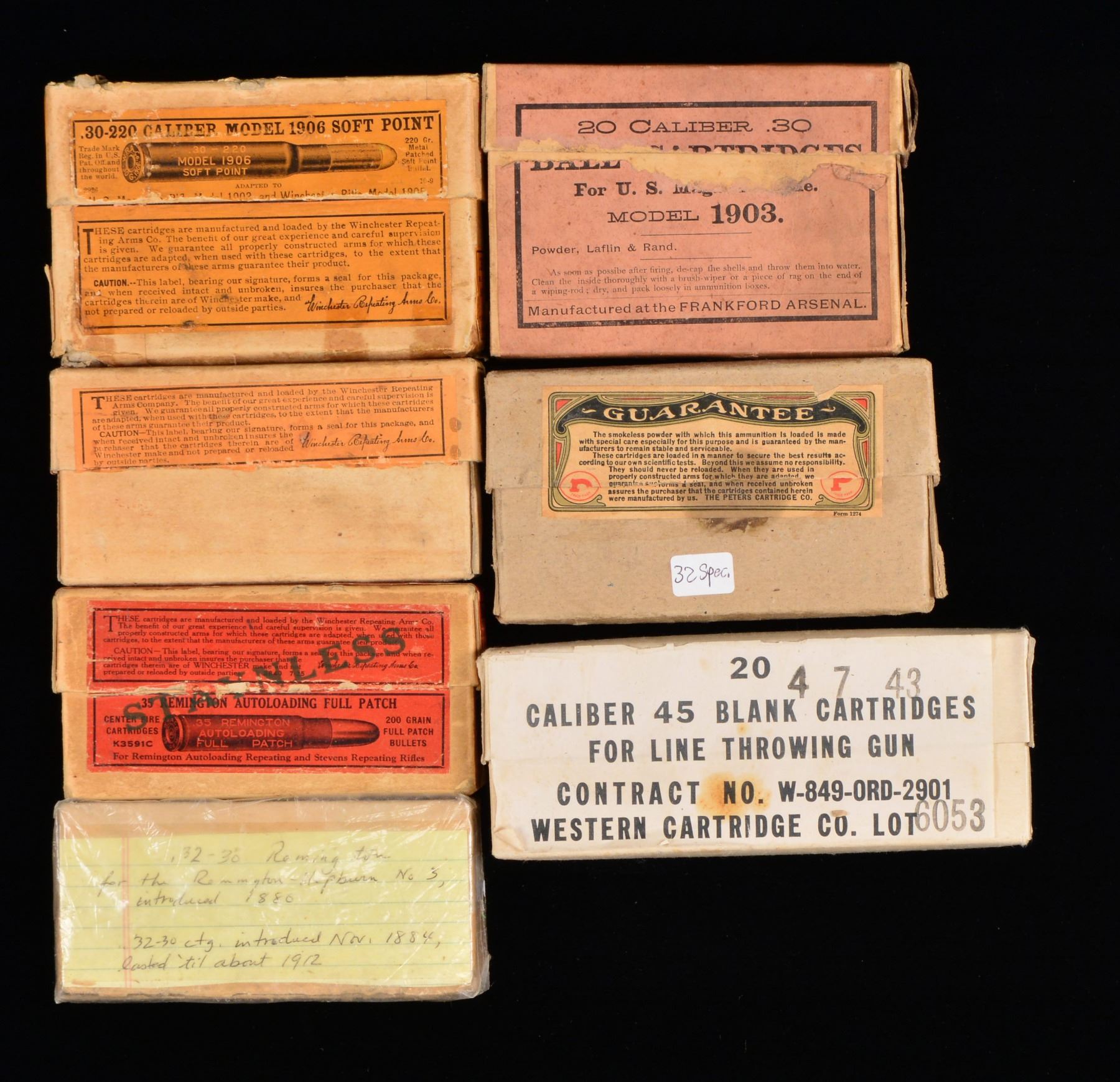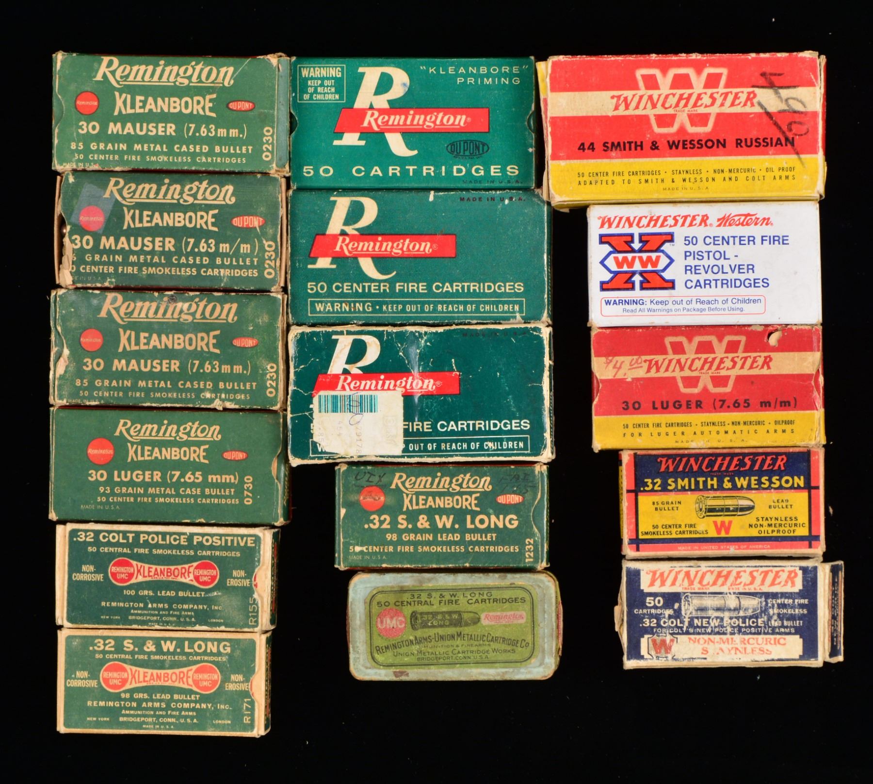 Approx. 100 boxes. ALL ROUND COUNTS ARE APPROXIMATIONS. THIS LOT WEIGHS APPROX. 140 LBS. PISTOL AMMO: 15 REMINGTON 50 RD. BOXES: 3 full red & green boxes of 30 Mauser; torn flaps. / 1 Full Red & green box of 30 Luger. / 1 Full red & green box of 32 Colt Police Positive w/ torn flap. / 2 Full red & green boxes of 32 S&W Long. / 2 Full green boxes 32 Short Colt. / 1 Green box of 32 S&W Long w/ mixed ammo. / 1 Two piece box w/ green label of REM-UMC 32 S&W Long, mixed ammo. / 3 Green & red boxes of 45 Colt w/ torn flaps & mixed ammo. / 1 Green & red box of 44 S&W Russian w/ torn flap & mixed ammo. / 2 PETERS 50 RD. BOXES: 1 Partial blue, red & yellow box of 32 S&W Long, w/ mixed ammo. / 1 Two piece box of 45 Colt blanks, missing 1 rd. / 5 WINCHESTER 50 RD. BOXES: 1 Full blue box w/ red writing of 32 Colt New Police w/ torn flaps. / 1 partial red & yellow box 30 Luger. / 1 Partial red, blue & yellow box of 32 S&W w/ mixed ammo. / 1 Partial white box of 30 Luger box. / 1 Red & yellow box of 44 S&W Russian w/ mixed ammo. / 2 WESTERN 50 RD. BOXES: 1 partial blue, yellow & red box of 45 Automatic w/ mixed ammo. / 1 White box of Super X containing mixed 45 S&W ammo. / 1 HORNADY 20 RD BOX: 1 full box of Custom 480 Ruger. / CENTERFIRE RIFLE AMMO: 7 TWO PIECE BOXES (all 20 rd. boxes): 1 Box w/ red label of Winchester Stainless in 35 Rem. Autoloading, mixed ammo. / 1 Full box w/ orange label of Winchester cal. 30-220 Model 1906 220 gr. SP. / 1 Full box w/ orange label of Winchester 30 WCF. / 1 Peters box of 32 Win. Spl., mixed ammo. / 1 Unmarked box missing lid of 32-30 Rem. Hepburn. / 1 Partial box of Franklin Arsenal 30 Model 1903, 15 rds. in stripper clips. / 1 White box of Western Cartridge Co. 45-70 blank line throwing cartridges. / 18 WINCHESTER 20 RD. BOXES: 1 Red & yellow box Super Speed 219 Zipper w/ mixed rds. / 2 Full red & yellow boxes of 220 Swift. / 1 Silver box of 22-250 Rem. w/ 11 rds. / 1 Blue, red & yellow box 22 High Power w/ mixed ammo. / 1 Blue, red & yellow box of 25-35 Win. w/ mixed cartridges. / 1 Red & yellow box of 250 Savage mixed cartridges w/ torn flap. / 1 Full red & yellow box of 270 Win. / 1 Full red & yellow box of 30 Rem. w/ torn flaps. / 1 Red & yellow box of 30-30 w/ mixed cartridges. / 1 Blue box w/ red markings 30 Army, mixed cartridges. / 1 Blue, yellow & red box w/ grizzly of 300 H&H, 17 mixed cartridges. / 1 Torn box of 32 Rem. mixed ammo. / 1 Box of 32 Win. Spl., mixed ammo w/ torn flaps. / 1 Full brown box of 7.92 Mauser. / 3 Yellow boxes of 35 Rem. mixed cartridges. / 4 WINCHESTER 50 RD. BOXES: 1 - 218 Bee yellow & red 50 rd. box, full. / 2 - 25-20 silver 50 rd. boxes, full. / 1 - 32-20 white 50 rd. box, mixed cartridges. 14 WESTERN 20 RD. BOXES: 1 Yellow box 25-35, mixed ammo. / 1 Full white box of 25-35. / 1 Blue, red & yellow box of 243 Win., mixed ammo. / 1 Blue, yellow & red box w/ grizzly of 250 Savage, mixed ammo. / 1 Blue, red & yellow box of 270 Win., mixed ammo. / 1 Yellow box of 30 Rem., mixed ammo. / 1 Blue, red & yellow box of 30-06 Super Match, mixed ammo. / 1 Yellow box of 300 Win. Mag., mixed ammo. / 2 Full blue, yellow & red boxes 8x56 MS. / 1 Blue, yellow & red box of 32 Rem. Autoloading, mixed ammo. / 1 Blue, yellow & red box of 35 Rem., mixed ammo. / 2 Blue, yellow & red boxes of 45-70, mixed ammo & torn flaps. / 6 NORMA 20 RD. BOXES: 1 box of 220 Swift w/ mixed ammo. / 1 Full box of 6.5 Jap. / 1 Full box of 270 Win. / 1 Full box of 7.62 Russian. / 1 Box of 7.7 Jap., mixed ammo. / 1 Full box of 8x57JS. / 4 PETERS 20 RD. BOXES: 1 blue, red & yellow box of 30-06, 14 mixed rds. / 1 Blue, red & white box of 32 Rem., mixed rds. / 1 Blue, red & yellow box of 35 Rem. / 1 Blue, red & yellow box of 45-70, torn box w/ mixed rds. / 20 REMINGTON 20 RD. BOXES: 1 green & red box 220 Swift, mixed rds. / 1 Red & green box of 25-35 Win., mixed rds. / 1 Box of 25-35 Marlin mixed rds. w/ torn cover. / 1 Full red & green box of 250 Savage, w/ torn flap. / 1 Red & green box of 257 Roberts, mixed rds. & torn flap. / 1 Yellow & green box of 7mm Rem. Mag., mixed rds. / 1 Green box of 300 Savage, mixed rds. & torn flap. / 1 Full green box of 30 Springfield. / 1 Full red & green box of 30-06 Springfield. / 1 Green & yellow box of 300 Win. Mag., mixed rds. / 1 Green box of 303 British, mixed rds. / 1 Full green & yellow box of 303 British. / 1 Green & red box of 32 Win. Spl., mixed rds. / 1 Green & red box of 8mm Mauser, mixed rds. / 1 Full green & red box of 35 Rem. / 1 Green & yellow box of 35 Rem., mixed rds. / 1 Full green box of 9mm Mauser & Mannlicher torn. / 1 Full red & green box of 401 Winchester SL. / 1 Green box of 444 Marlin, mixed cartridges. / 1 Green box of 45-70 Kleanbore, mixed cartridges & torn flaps. / 6 REMINGTON 50 RD. BOXES: 1 red & green box of 218 Bee, torn w/ mixed cartridges. / 3 Red & green boxes of Kleanbore 25-20 Winchester, mixed ammo & 1 w/ torn flaps. / 1 Green box 25-20 Winchester, mixed ammo. / 1 Red & green box of 351 Winchester SL, mixed ammo & torn flaps. 1 FEDERAL PREMIUM 20 RD. BOX: 1 box of 7-30 Waters, mixed ammo. / 1 CIL 20 RD. BOX: 1 blue & yellow box of 300 Savage, mixed ammo. / 3 KYNOCH 10 RD. BOXES: 1 full box of 9mm MS. / 1 Full box of 9mm Mauser. / 1 Full box of 35 Win.. (02-13274/DS). $1,750-3,500.