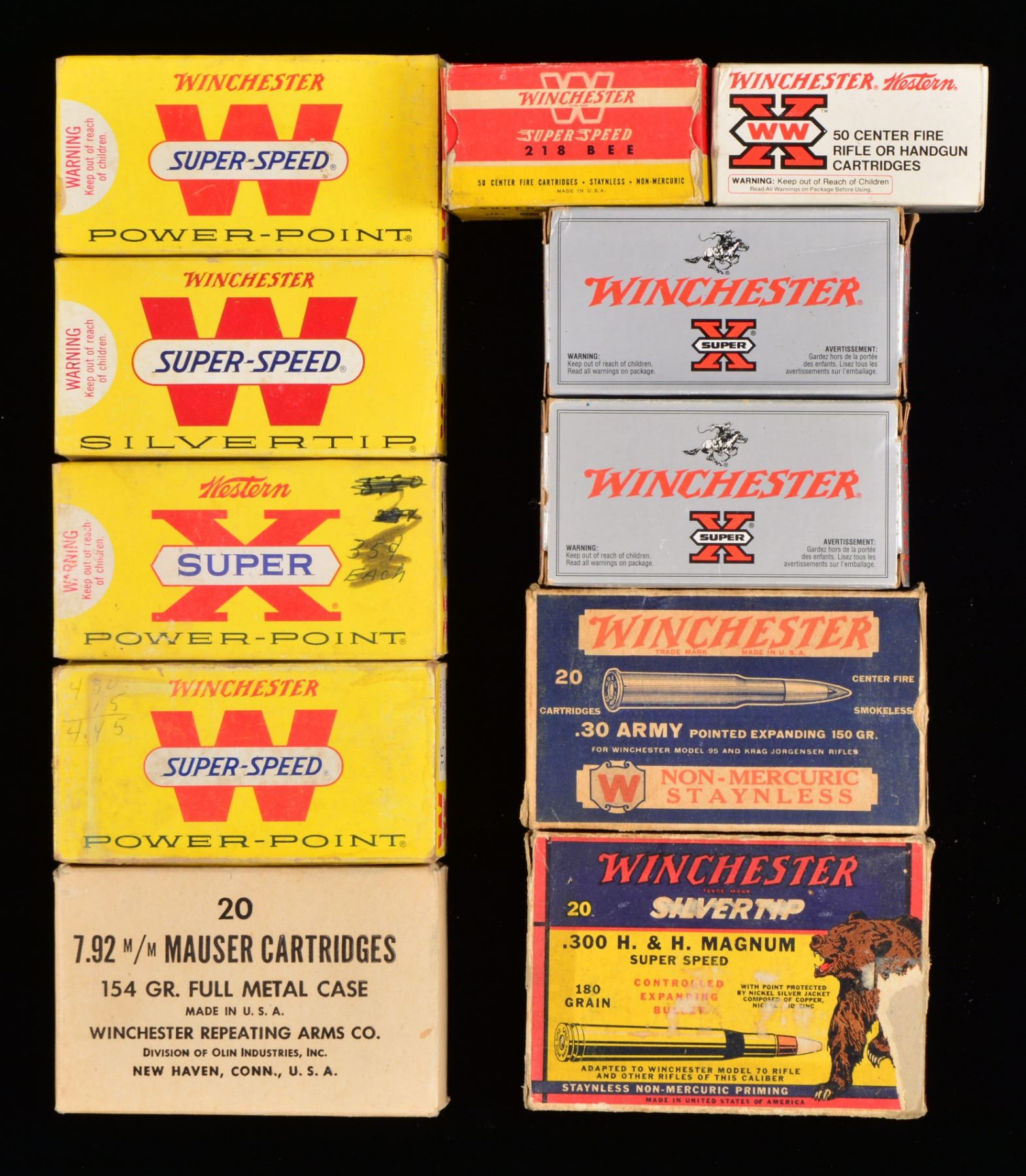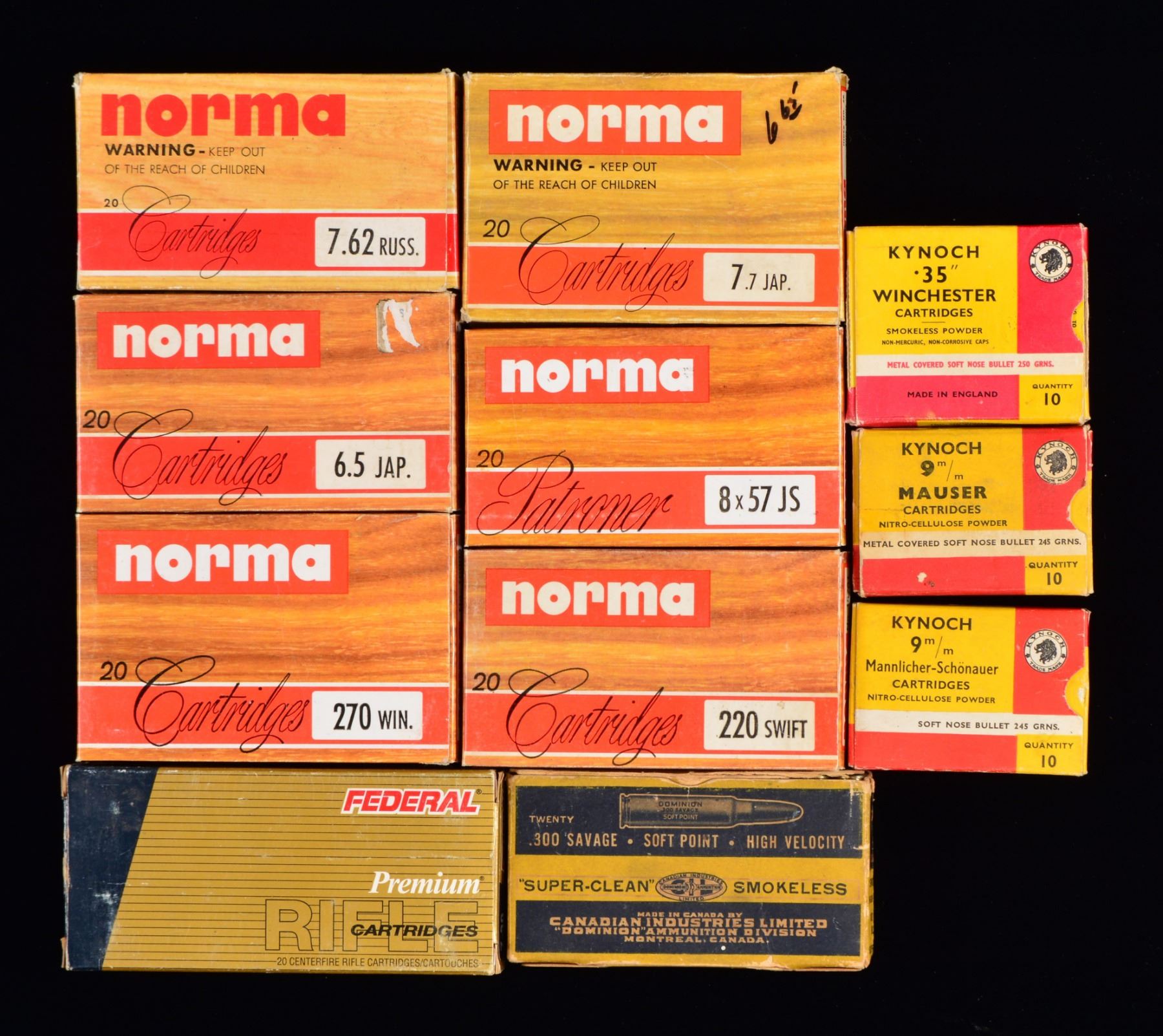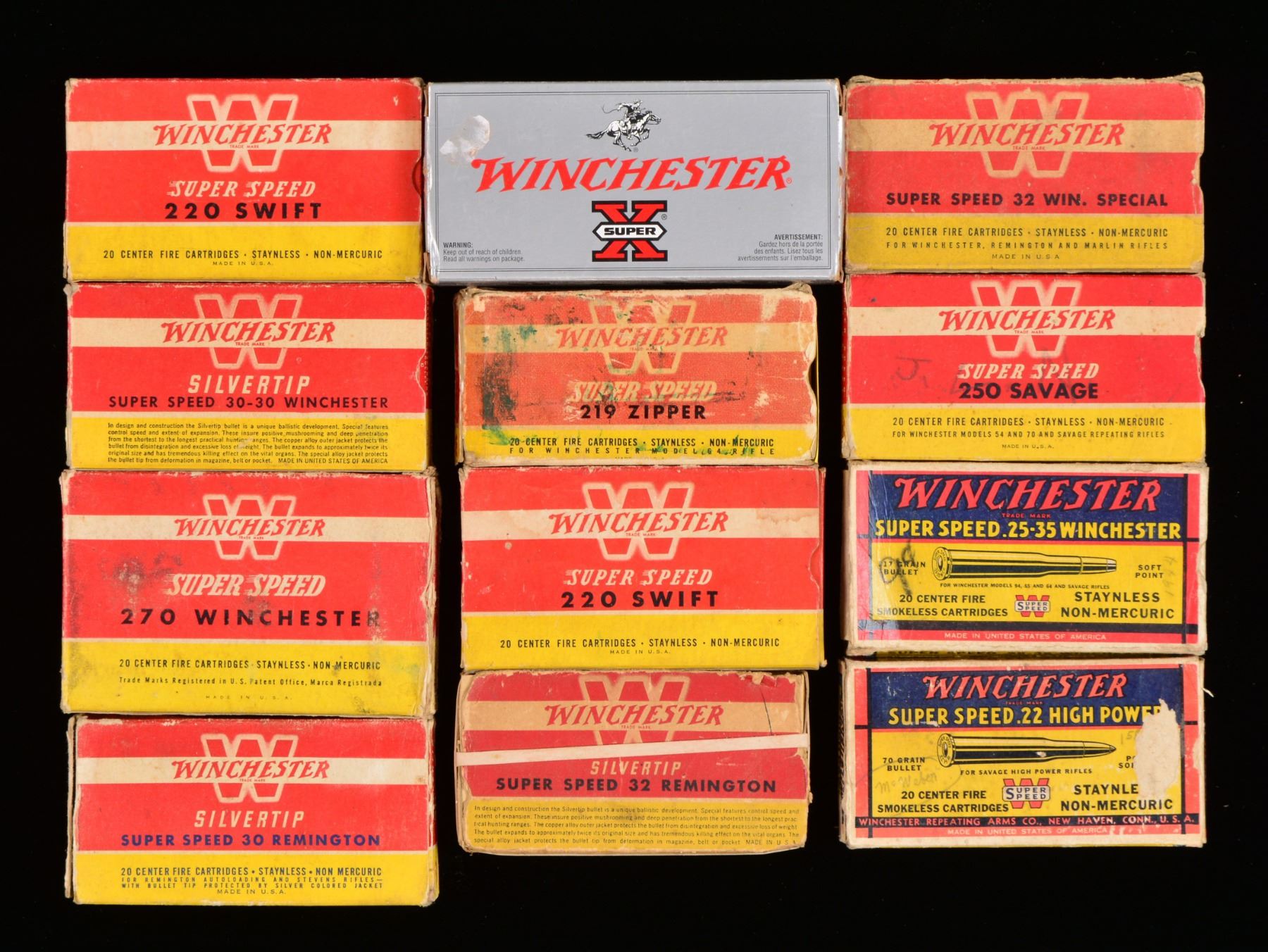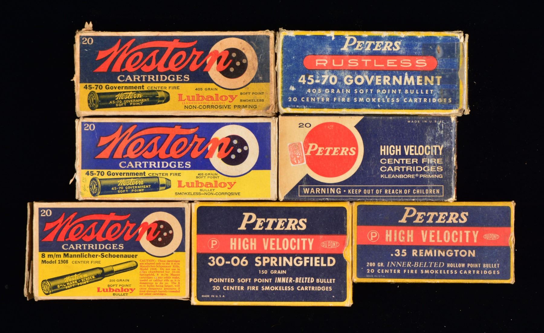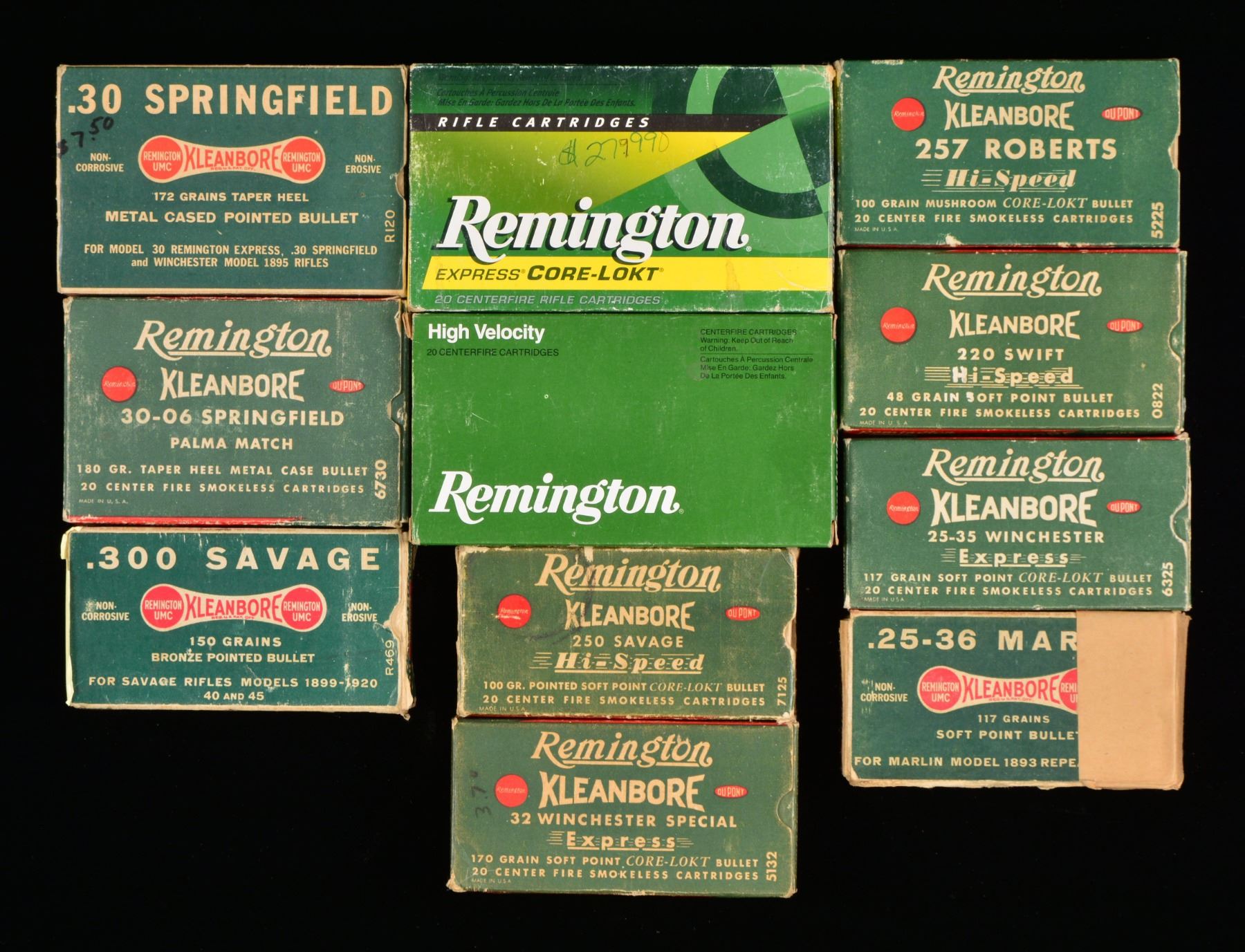 Approx. 100 boxes. ALL ROUND COUNTS ARE APPROXIMATIONS. THIS LOT WEIGHS APPROX. 140 LBS. PISTOL AMMO: 15 REMINGTON 50 RD. BOXES: 3 full red & green boxes of 30 Mauser; torn flaps. / 1 Full Red & green box of 30 Luger. / 1 Full red & green box of 32 Colt Police Positive w/ torn flap. / 2 Full red & green boxes of 32 S&W Long. / 2 Full green boxes 32 Short Colt. / 1 Green box of 32 S&W Long w/ mixed ammo. / 1 Two piece box w/ green label of REM-UMC 32 S&W Long, mixed ammo. / 3 Green & red boxes of 45 Colt w/ torn flaps & mixed ammo. / 1 Green & red box of 44 S&W Russian w/ torn flap & mixed ammo. / 2 PETERS 50 RD. BOXES: 1 Partial blue, red & yellow box of 32 S&W Long, w/ mixed ammo. / 1 Two piece box of 45 Colt blanks, missing 1 rd. / 5 WINCHESTER 50 RD. BOXES: 1 Full blue box w/ red writing of 32 Colt New Police w/ torn flaps. / 1 partial red & yellow box 30 Luger. / 1 Partial red, blue & yellow box of 32 S&W w/ mixed ammo. / 1 Partial white box of 30 Luger box. / 1 Red & yellow box of 44 S&W Russian w/ mixed ammo. / 2 WESTERN 50 RD. BOXES: 1 partial blue, yellow & red box of 45 Automatic w/ mixed ammo. / 1 White box of Super X containing mixed 45 S&W ammo. / 1 HORNADY 20 RD BOX: 1 full box of Custom 480 Ruger. / CENTERFIRE RIFLE AMMO: 7 TWO PIECE BOXES (all 20 rd. boxes): 1 Box w/ red label of Winchester Stainless in 35 Rem. Autoloading, mixed ammo. / 1 Full box w/ orange label of Winchester cal. 30-220 Model 1906 220 gr. SP. / 1 Full box w/ orange label of Winchester 30 WCF. / 1 Peters box of 32 Win. Spl., mixed ammo. / 1 Unmarked box missing lid of 32-30 Rem. Hepburn. / 1 Partial box of Franklin Arsenal 30 Model 1903, 15 rds. in stripper clips. / 1 White box of Western Cartridge Co. 45-70 blank line throwing cartridges. / 18 WINCHESTER 20 RD. BOXES: 1 Red & yellow box Super Speed 219 Zipper w/ mixed rds. / 2 Full red & yellow boxes of 220 Swift. / 1 Silver box of 22-250 Rem. w/ 11 rds. / 1 Blue, red & yellow box 22 High Power w/ mixed ammo. / 1 Blue, red & yellow box of 25-35 Win. w/ mixed cartridges. / 1 Red & yellow box of 250 Savage mixed cartridges w/ torn flap. / 1 Full red & yellow box of 270 Win. / 1 Full red & yellow box of 30 Rem. w/ torn flaps. / 1 Red & yellow box of 30-30 w/ mixed cartridges. / 1 Blue box w/ red markings 30 Army, mixed cartridges. / 1 Blue, yellow & red box w/ grizzly of 300 H&H, 17 mixed cartridges. / 1 Torn box of 32 Rem. mixed ammo. / 1 Box of 32 Win. Spl., mixed ammo w/ torn flaps. / 1 Full brown box of 7.92 Mauser. / 3 Yellow boxes of 35 Rem. mixed cartridges. / 4 WINCHESTER 50 RD. BOXES: 1 - 218 Bee yellow & red 50 rd. box, full. / 2 - 25-20 silver 50 rd. boxes, full. / 1 - 32-20 white 50 rd. box, mixed cartridges. 14 WESTERN 20 RD. BOXES: 1 Yellow box 25-35, mixed ammo. / 1 Full white box of 25-35. / 1 Blue, red & yellow box of 243 Win., mixed ammo. / 1 Blue, yellow & red box w/ grizzly of 250 Savage, mixed ammo. / 1 Blue, red & yellow box of 270 Win., mixed ammo. / 1 Yellow box of 30 Rem., mixed ammo. / 1 Blue, red & yellow box of 30-06 Super Match, mixed ammo. / 1 Yellow box of 300 Win. Mag., mixed ammo. / 2 Full blue, yellow & red boxes 8x56 MS. / 1 Blue, yellow & red box of 32 Rem. Autoloading, mixed ammo. / 1 Blue, yellow & red box of 35 Rem., mixed ammo. / 2 Blue, yellow & red boxes of 45-70, mixed ammo & torn flaps. / 6 NORMA 20 RD. BOXES: 1 box of 220 Swift w/ mixed ammo. / 1 Full box of 6.5 Jap. / 1 Full box of 270 Win. / 1 Full box of 7.62 Russian. / 1 Box of 7.7 Jap., mixed ammo. / 1 Full box of 8x57JS. / 4 PETERS 20 RD. BOXES: 1 blue, red & yellow box of 30-06, 14 mixed rds. / 1 Blue, red & white box of 32 Rem., mixed rds. / 1 Blue, red & yellow box of 35 Rem. / 1 Blue, red & yellow box of 45-70, torn box w/ mixed rds. / 20 REMINGTON 20 RD. BOXES: 1 green & red box 220 Swift, mixed rds. / 1 Red & green box of 25-35 Win., mixed rds. / 1 Box of 25-35 Marlin mixed rds. w/ torn cover. / 1 Full red & green box of 250 Savage, w/ torn flap. / 1 Red & green box of 257 Roberts, mixed rds. & torn flap. / 1 Yellow & green box of 7mm Rem. Mag., mixed rds. / 1 Green box of 300 Savage, mixed rds. & torn flap. / 1 Full green box of 30 Springfield. / 1 Full red & green box of 30-06 Springfield. / 1 Green & yellow box of 300 Win. Mag., mixed rds. / 1 Green box of 303 British, mixed rds. / 1 Full green & yellow box of 303 British. / 1 Green & red box of 32 Win. Spl., mixed rds. / 1 Green & red box of 8mm Mauser, mixed rds. / 1 Full green & red box of 35 Rem. / 1 Green & yellow box of 35 Rem., mixed rds. / 1 Full green box of 9mm Mauser & Mannlicher torn. / 1 Full red & green box of 401 Winchester SL. / 1 Green box of 444 Marlin, mixed cartridges. / 1 Green box of 45-70 Kleanbore, mixed cartridges & torn flaps. / 6 REMINGTON 50 RD. BOXES: 1 red & green box of 218 Bee, torn w/ mixed cartridges. / 3 Red & green boxes of Kleanbore 25-20 Winchester, mixed ammo & 1 w/ torn flaps. / 1 Green box 25-20 Winchester, mixed ammo. / 1 Red & green box of 351 Winchester SL, mixed ammo & torn flaps. 1 FEDERAL PREMIUM 20 RD. BOX: 1 box of 7-30 Waters, mixed ammo. / 1 CIL 20 RD. BOX: 1 blue & yellow box of 300 Savage, mixed ammo. / 3 KYNOCH 10 RD. BOXES: 1 full box of 9mm MS. / 1 Full box of 9mm Mauser. / 1 Full box of 35 Win.. (02-13274/DS). $1,750-3,500.