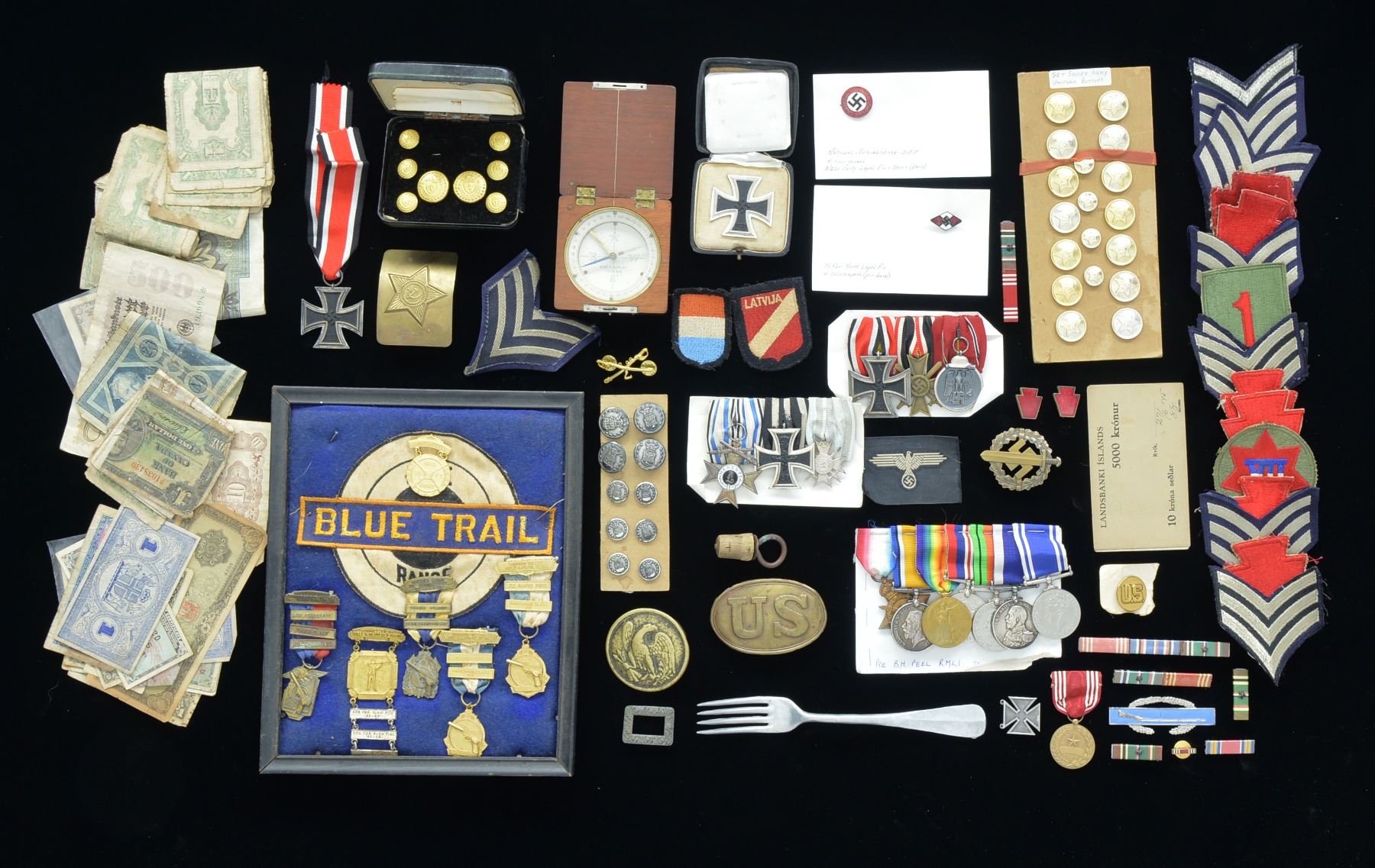 This lg. & varied group includes 13 Boy Scout merit badges. / 20 US military rank & divisional patches. / Sm. group of US military ribbons & insignia. / 2 US Asiatic theater photographs. / 8 Post WWI Massachusetts buttons. / 1 Post WWI collar insignia for the 7th Cavalry. / 2 Merchant Marine buttons. / 1 US engineers compass. / 1 frame w/ 6 Connecticut shooting medals & 2 patches. / 10 US Air Force buttons. / 18 Russian buttons. / 1 Russian belt buckle. / A group of 7 British medals belonging to "PO. 14515, PTE. P.H. BEEL R.M.L.I.". Medals include 1914-18 Star (named), 1914-18 War Medal (named), WWI Victory (named), 1939-45 medal (unnamed), 1939-45 Defense medal (unnamed), Navy Long Service & Good Conduct (named), Police Service medal (named). / 1 Reproduction Civil War crossbelt plate. / 1 Civil War arrow hook belt buckle. / 1 Partial colonial knee buckle. / 1 Spanish American War canteen stopper. / 1 Partial tompion. / 1 Coat Civil War Navy button. / 1 Cuff Civil War Navy button. / A group of well circulated foreign & military occupation currency. / 1 Hitler stamp. / 1 WWII German bronze SA Sports badge. / 1 WWII German 3 award medal bar including 2nd Class Iron Cross, War Merit Cross w/ swords & Russian Front medal. / 1 WWI German 3 award medal bar including Iron Cross, Bavarian Cross of Honor w/ swords & Bulgarian War Service Cross w/ swords. / 1 WWII German Iron Cross w/ replaced ribbon. / 1 Hitler Youth membership pin w/ damage. / 1 WWII German Party pin. / 1 Cloth SS eagle. / 1 WWII German 1st Class Iron Cross in original box. / 1 WWII German Wehrmacht aluminum fork. / 1 WWII German foreign fighters patch for Holland. / 1 WWII German foreign fighters patch for Latvia. CONDITION: condition of items in this lot varies greatly as expected. Most items show normal wear w/ little or no damage. Currency is well circulated. Medals show normal wear & tear. (02-13325/BF). $500-800.