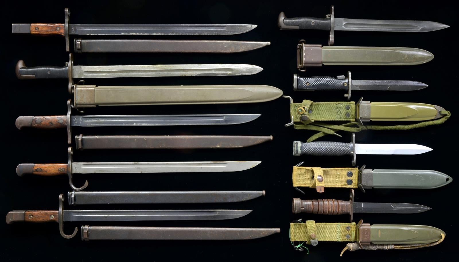 This group of bayonets includes 1 Japanese Type 30 1st Pattern Arisaka bayonet & scabbard from the Tokyo or Kokura Arsenal. / 1 Japanese Type 30 2nd Pattern bayonet & scabbard from the Howa Jyuko Arsenal. / 1 Japanese Type 30 2nd Pattern bayonet & scabbard from the Toyada Jidoshoki Seisakusho Arsenal. / 1 Japanese Type 30 1st Pattern bayonet & scabbard from an arsenal under Kokura supervision. / 1 US M1942 Springfield bayonet made by PAL w/ a USN MK1 scabbard. / 1 US M1 rifle bayonet & scabbard by UFH. / 1 US M4 bayonet & scabbard by Case. / 1 US M4 bayonet & scabbard made in Germany by Eickhorn. / 1 US M5 A1 bayonet & scabbard made by MILPAR. CONDITION: all bayonets show overall light wear w/ no broken or missing pieces. All blades are intact w/ a few showing light sharpening. (02-13482/BF). $600-900.