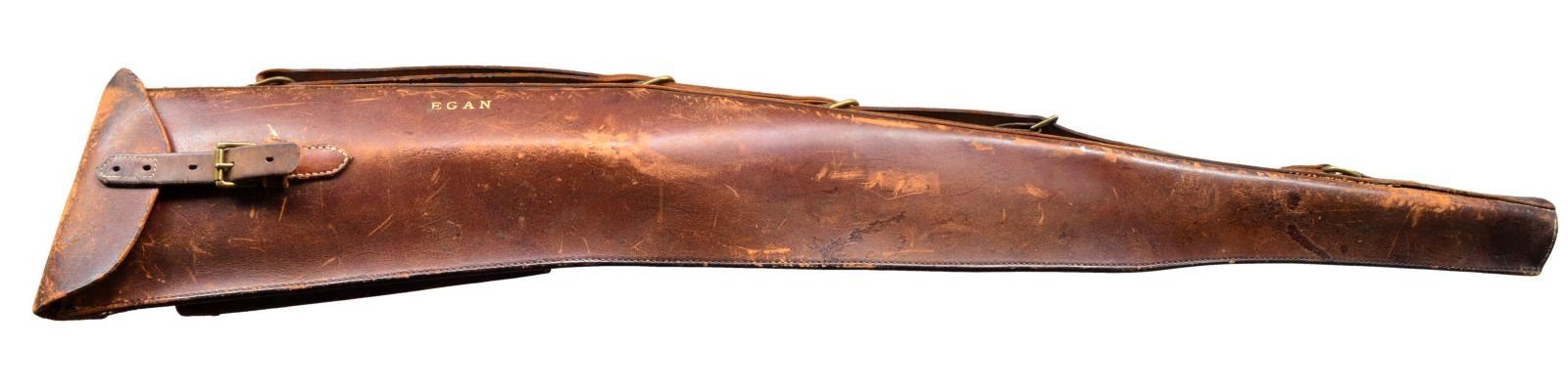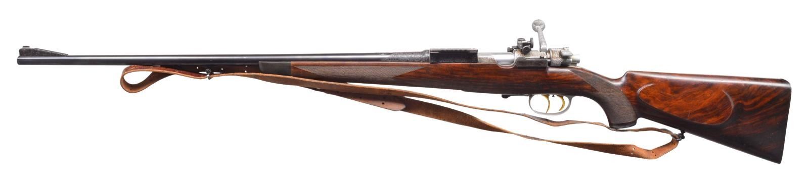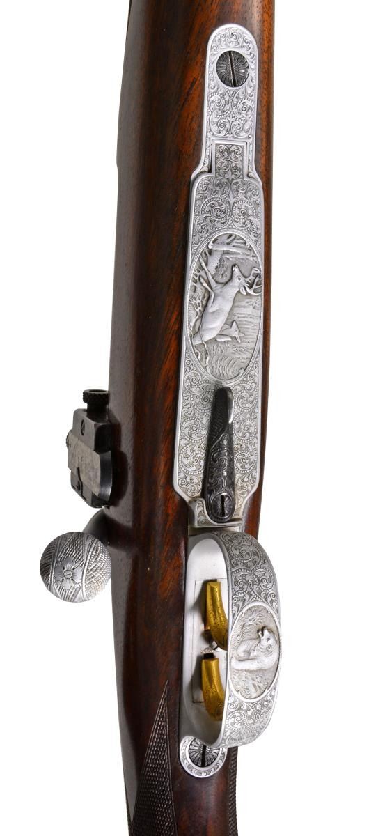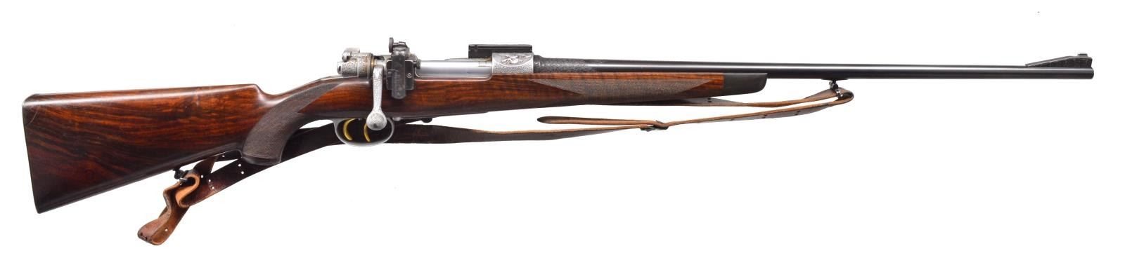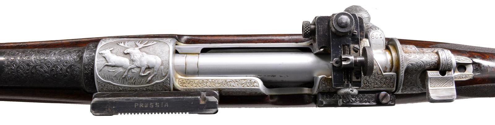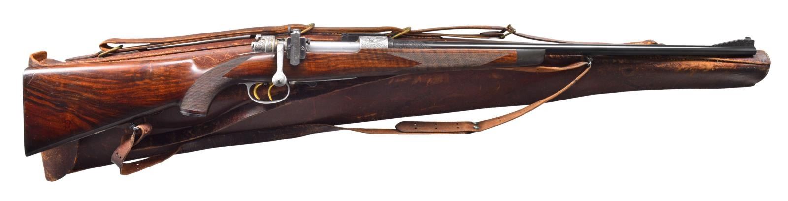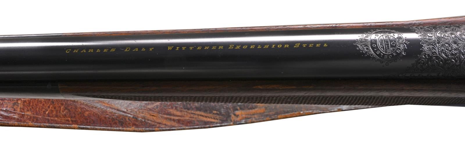 APPROACHING "REGENT DIAMOND" QUALITY WITH SUPERB HIGH RELIEF GAME SCENE ENGRAVING. Cal. 30-06. S# 26661. Charles Daly, a partner in the New York firm Schoverling, Daly & Gales, had a vision of bringing high quality European sporting arms to the American shooter. The "Prussian" Dalys imported prior to WWII were mfg. by various firms in Suhl, Germany. These firearms combined the finest European craftsmanship w/ features designed to appeal to the discriminating North American firearms enthusiast. This exceptional Prussian rifle is built on a Mauser 98 action & very few examples are known today w/ Michael Petrov having only six rifles in his database. Most are plain, one is engraved w/ game scenes & scroll, but not in high relief, like this spectacular piece. It features exquisite full coverage of exceptionally well cut open shaded scroll surrounding deep relief game scene vignettes consisting of a bull & cow moose on front receiver ring, running whitetail buck on floorplate & grizzly on the trigger guard bow. Scenes are surrounded by full coverage arabesque scroll engraving w/ beaded highlights that extend to the breech section of the bbl., front right ramp, bolt shroud, & bolt handle. Rear receiver ring has "CHARLES DALY" marking inlaid in gold. Bbl. 25" light sporter weight. Top of bbl. has gold inlaid marking "Charles Daly Wittener Excelsior Steel". Bottom of bbl. is marked "333", a Suhl date code indicating March 1933 mfg. along w/ crown over B, U, G & E proofs over "SUHL" marking. Bolt is numbered to the rifle having a wing type safety & 2 checkered panels on bolt knob. Receiver, bolt & bottom metal feature a fine satin gray finish. Gold plated dbl. set triggers. Right side of action has side mounted scope base marked "PRUSSIA". Ramp mounted bead front sight w/ Lyman receiver sight. Classic style cheekpiece sporting stock of fancy European thin shell walnut having fiddle & burl figure w/ vivid dark streaking. Features include horn forearm tip w/ engraved & blued steel trapdoor grip cap. LOP: 13 5/8" over blue finished hand engraved steel trapdoor buttplate. Toeline of stock has oval silver name plate w/ initial "E". Narrow European leather sling is held on original swivels, front swivel is bbl. mounted. WEIGHT: 8 lbs., 3.5 oz. UNATTACHED ACCESSORIES: brass takedown cleaning rod & jags held in trapdoor butt. Heavy leather rifle case w/ side pouch for scope. Right side of case has gold marking "EGAN". Case has loose stitching w/ numerous scuffs & handling marks & missing flap for scope compartment. CONDITION: bbl. retains over 98% fine rust blued finish. Receiver, bottom metal & bolt retain over 95% satin finish showing hardened residue from protective grease coating. Stock has moderately worn oil finish showing scattered scratches, sm. dents & handling marks. Bore retains strong rifling. A superb rifle which would be the centerpiece of any collection of Charles Daly offerings. (20-208/DS). CURIO. $8,000-12,000.