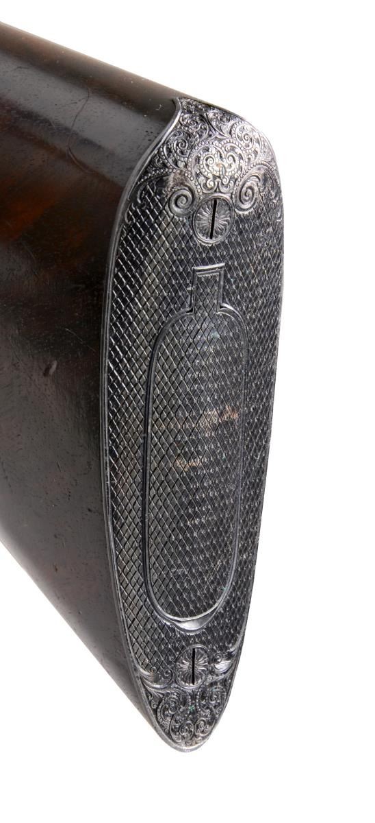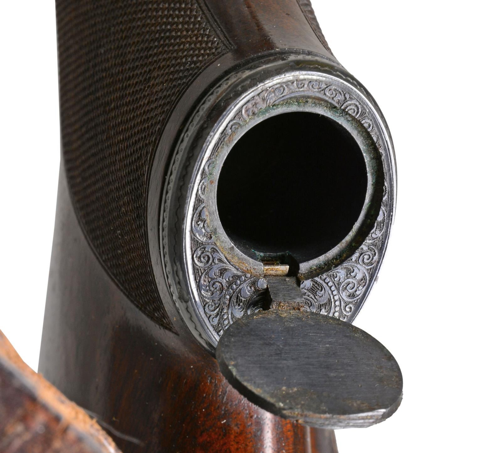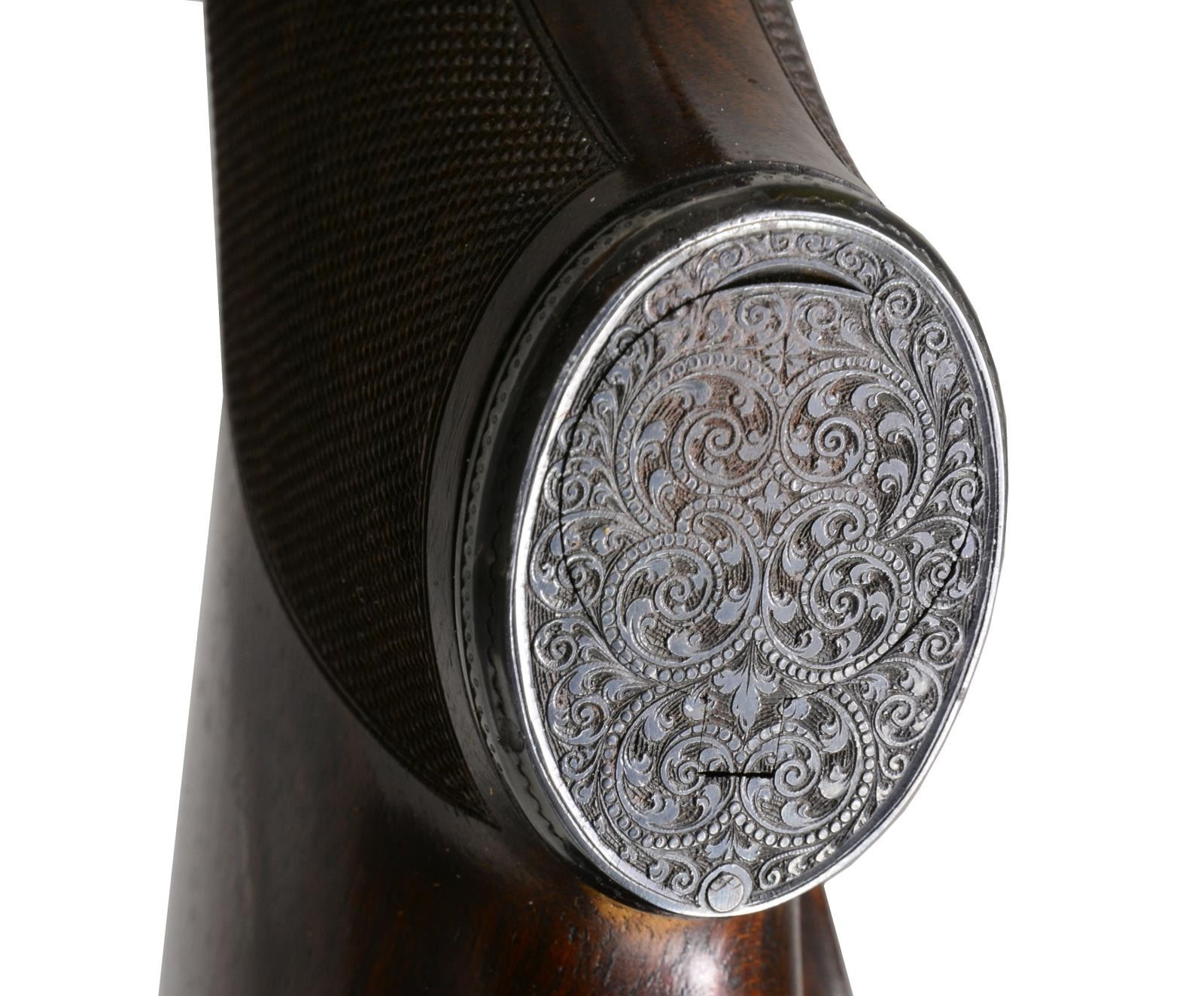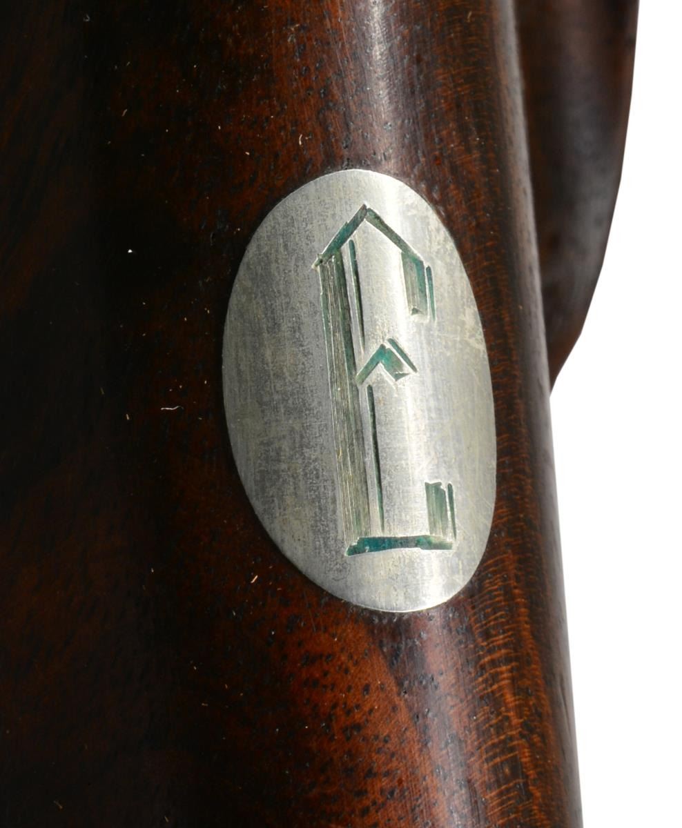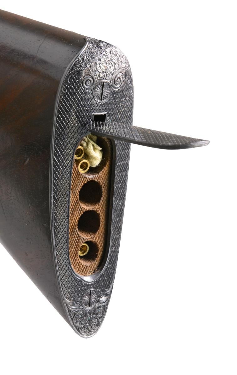 APPROACHING "REGENT DIAMOND" QUALITY WITH SUPERB HIGH RELIEF GAME SCENE ENGRAVING. Cal. 30-06. S# 26661. Charles Daly, a partner in the New York firm Schoverling, Daly & Gales, had a vision of bringing high quality European sporting arms to the American shooter. The "Prussian" Dalys imported prior to WWII were mfg. by various firms in Suhl, Germany. These firearms combined the finest European craftsmanship w/ features designed to appeal to the discriminating North American firearms enthusiast. This exceptional Prussian rifle is built on a Mauser 98 action & very few examples are known today w/ Michael Petrov having only six rifles in his database. Most are plain, one is engraved w/ game scenes & scroll, but not in high relief, like this spectacular piece. It features exquisite full coverage of exceptionally well cut open shaded scroll surrounding deep relief game scene vignettes consisting of a bull & cow moose on front receiver ring, running whitetail buck on floorplate & grizzly on the trigger guard bow. Scenes are surrounded by full coverage arabesque scroll engraving w/ beaded highlights that extend to the breech section of the bbl., front right ramp, bolt shroud, & bolt handle. Rear receiver ring has "CHARLES DALY" marking inlaid in gold. Bbl. 25" light sporter weight. Top of bbl. has gold inlaid marking "Charles Daly Wittener Excelsior Steel". Bottom of bbl. is marked "333", a Suhl date code indicating March 1933 mfg. along w/ crown over B, U, G & E proofs over "SUHL" marking. Bolt is numbered to the rifle having a wing type safety & 2 checkered panels on bolt knob. Receiver, bolt & bottom metal feature a fine satin gray finish. Gold plated dbl. set triggers. Right side of action has side mounted scope base marked "PRUSSIA". Ramp mounted bead front sight w/ Lyman receiver sight. Classic style cheekpiece sporting stock of fancy European thin shell walnut having fiddle & burl figure w/ vivid dark streaking. Features include horn forearm tip w/ engraved & blued steel trapdoor grip cap. LOP: 13 5/8" over blue finished hand engraved steel trapdoor buttplate. Toeline of stock has oval silver name plate w/ initial "E". Narrow European leather sling is held on original swivels, front swivel is bbl. mounted. WEIGHT: 8 lbs., 3.5 oz. UNATTACHED ACCESSORIES: brass takedown cleaning rod & jags held in trapdoor butt. Heavy leather rifle case w/ side pouch for scope. Right side of case has gold marking "EGAN". Case has loose stitching w/ numerous scuffs & handling marks & missing flap for scope compartment. CONDITION: bbl. retains over 98% fine rust blued finish. Receiver, bottom metal & bolt retain over 95% satin finish showing hardened residue from protective grease coating. Stock has moderately worn oil finish showing scattered scratches, sm. dents & handling marks. Bore retains strong rifling. A superb rifle which would be the centerpiece of any collection of Charles Daly offerings. (20-208/DS). CURIO. $8,000-12,000.