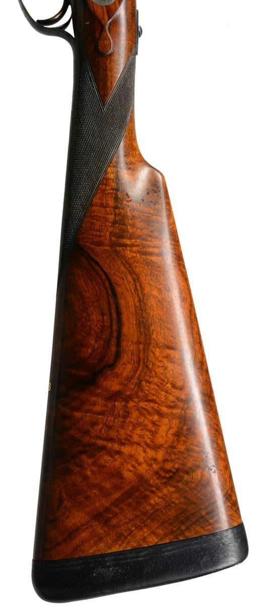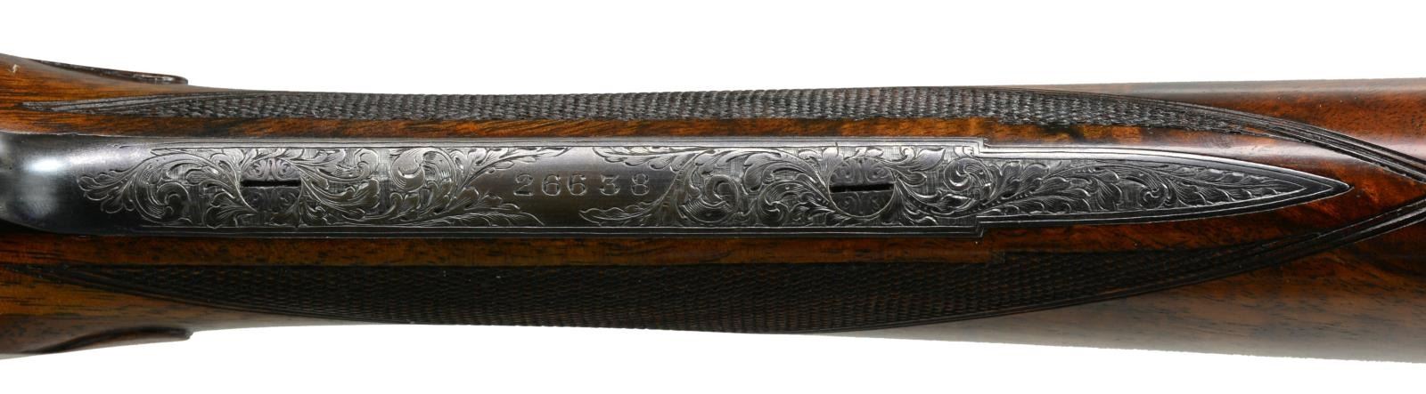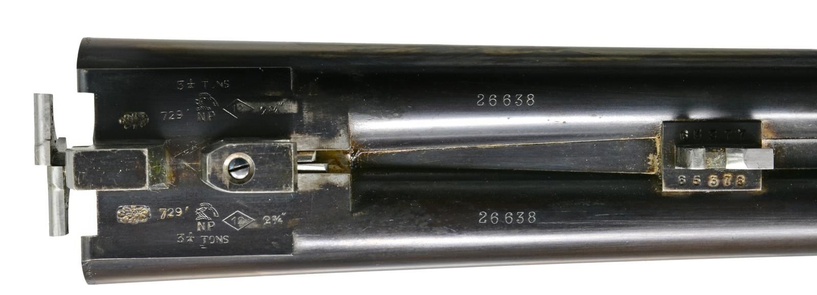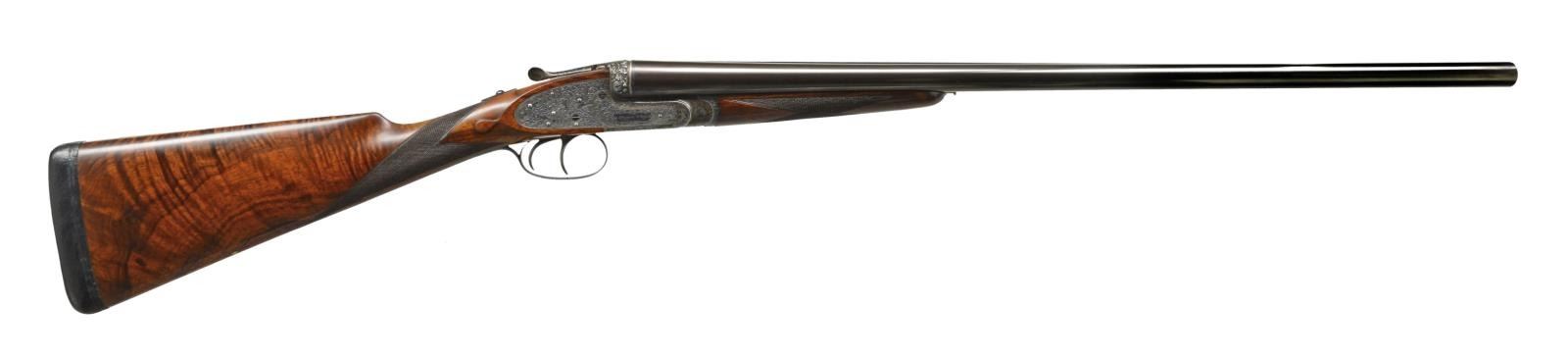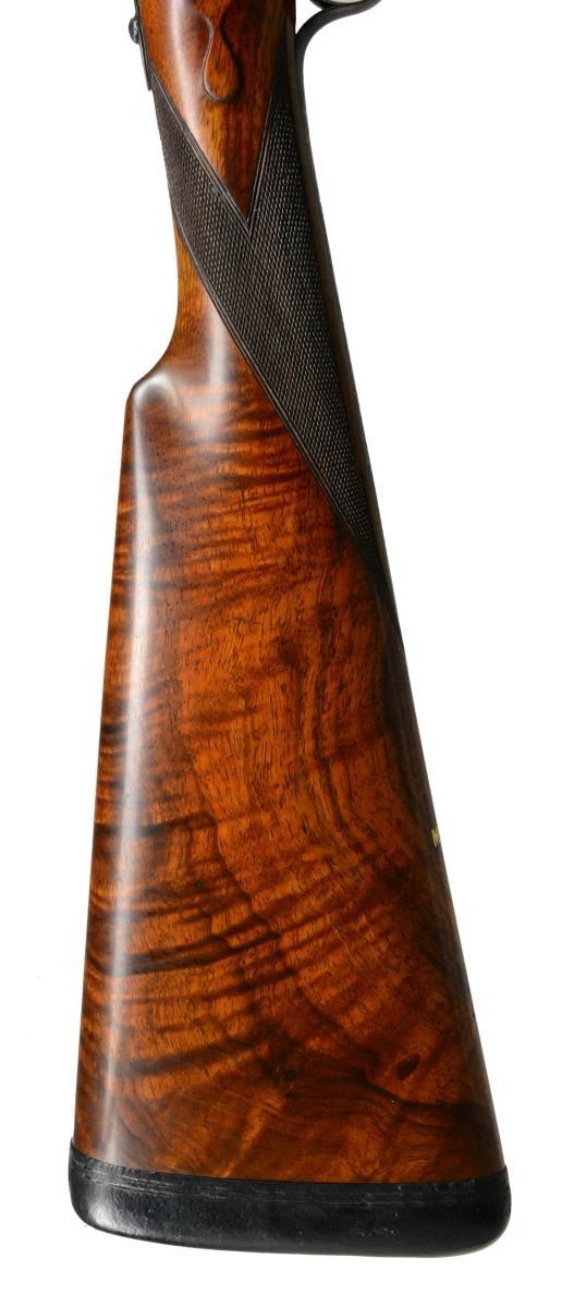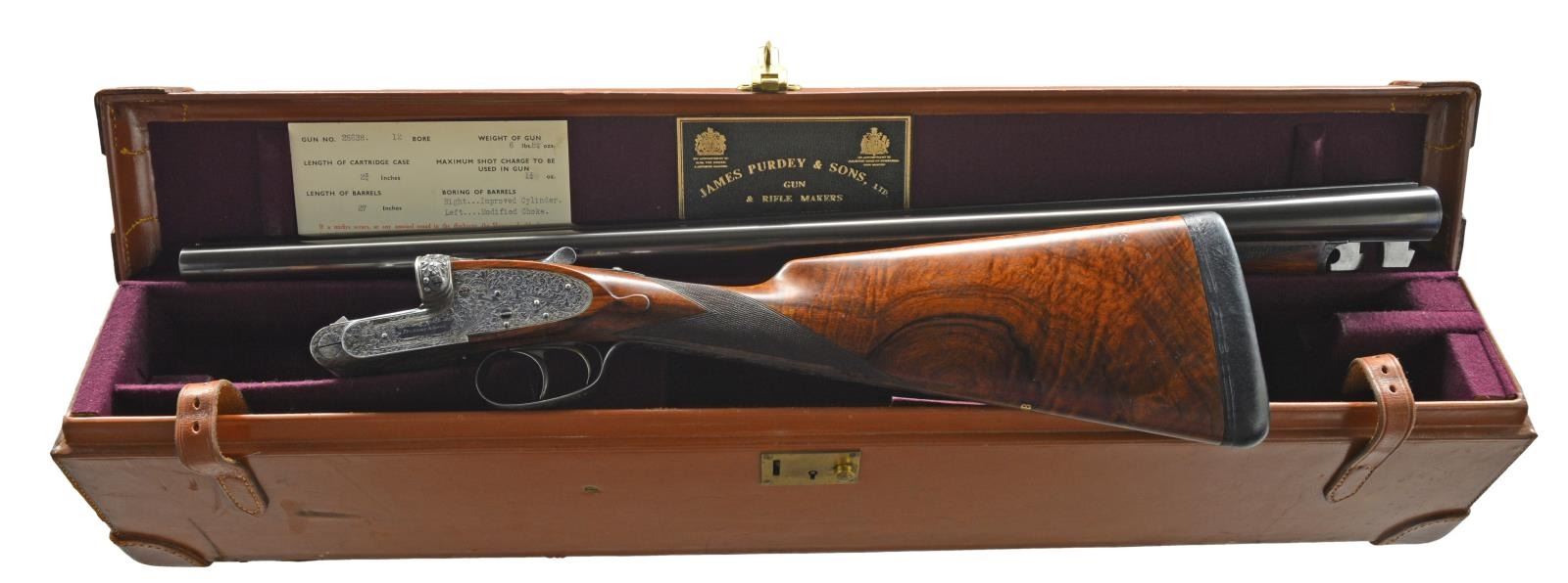 JAMES PURDEY HEAVY PROOF SIDELOCK EJECTOR GAME GUN IN SUPERB ORIGINAL CONDITION WITH CASE. Cal. 12 Ga., 2 3/4". S# 26638. (1956). Bbls. 27" Chopper lump fitted with very narrow matted game rib are engraved "J Purdey & Sons." "Audley House South Audley Street, London. England." on tops. Bbl. flats are stamped with London nitro proofs for 2 3/4". Bottoms of bbls. are stamped with serial numbers, and barrel makers initials "G.W" (George Wood). Tube numbers "65377" and "65378" are on loop. Casehardened Beesley patent self opening sidelock action features automatic safety (SAFE inlaid in gold), bushed strikers, raised rib tumbler end cocking indicators, and double triggers. Action and lockplates are engraved with near full coverage large open broad shaded scroll with strap work highlights, as originated by, and in this case executed by, the revered Harry Kell (per factory letter). "J. Purdey & Sons" is on the front part of each lockplate, as well as on bottom of action over "London" "England". Fences are finely full relief carved in oak leaf and acorn motif, as usually found in this "extra finish" pattern. Blued top lever and trigger guard are also engraved with acanthus scroll. Serial number is on trigger guard tang. Dense, nicely marbled, and strikingly stump/ fiddle figured European walnut straight grip buttstock measures 14 1/8" over black leather covered pad. Stock features usual drop points and point pattern checkering at grip. Individual gold initials "M V B" are inlet on toeline. Factory records indicate this gun was made for Mrs. Sherburn M. Becker. Matching splinter ejector forend has Anson release. Actioners initials "M.T" (Maurice Timbers) are on iron. UNATTACHED ACCESSORIES: Makers tan leather motor case with stitched leather corners is embossed "M. V. B." on lid. Interior is lined in purple cloth, and has gold embossed black leather Purdey label along with charge card for this particular gun in lid. Case contains Purdey marked square oil bottle, two horn handled striker keys, pull-through 12 ga. cleaning kit, two piece rosewood and brass cleaning rod with mops and jag, and a 1929 dated Purdey Guns instruction booklet. Bore diameters: left -.731, right - .731. Restriction: left - .025 (mod), right - .008 (IC). Minimum wall thickness: left - .035, right - .034. DAH: 2 7/16". DAC: 1 9/16". No cast. WEIGHT: 6 lbs. 10 oz. CONDITION: extra fine, mostly original. Bbls. have over 95% what appears to be original blue, thinned a bit on sides, which is possibly an old reblue. Action retains approx. 85-90% original casehardening color, pleasingly silvered on fences and beads. Lockplates have nearly all of their original color. Hinge pin retains most of its temper blue, as do lock pin heads and other pins. Back portion of safety is silvered. Forend iron retains most of its original blue. Forend tip is considerably silvered. Trigger guard has blue thinning on bow and silvering at grip. Stocks retain over 90% original "slackum" finish thinning on high edges with a number of light marks and dings. Checkering is somewhat worn and dark. Pad appears to be original, slightly flattened at heel. Bores are excellent, sharp and shiny throughout, with little evidence of dents or repairs. Action is tight. Bbls. are on face. Ejectors are in time. Drop is down a bit, iron just beginning to contact bottom of action. Case leather is still light in color. Straps and handle are good. Interior has a few rubs and compressions. Accessories are fine. A truly exceptional, good handling Purdey game gun; to have this gun built today would cost well over $150,000.00. (20-917/MGM73). CURIO. $30,000-40,000.