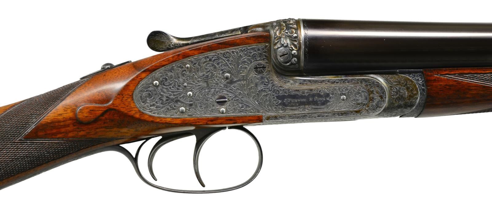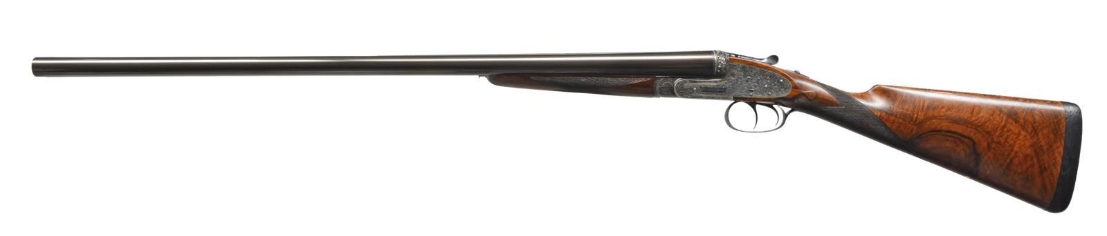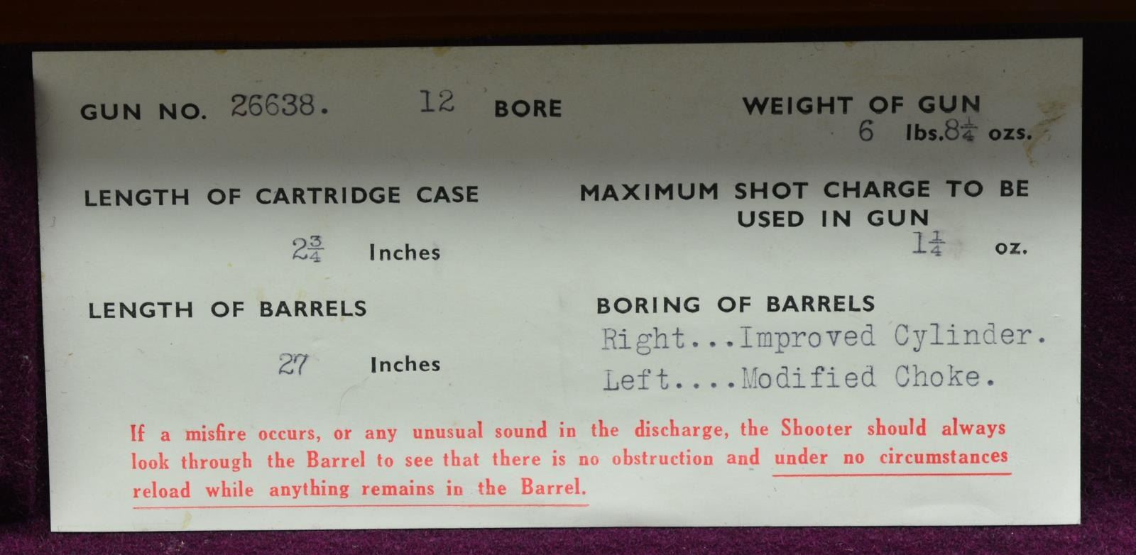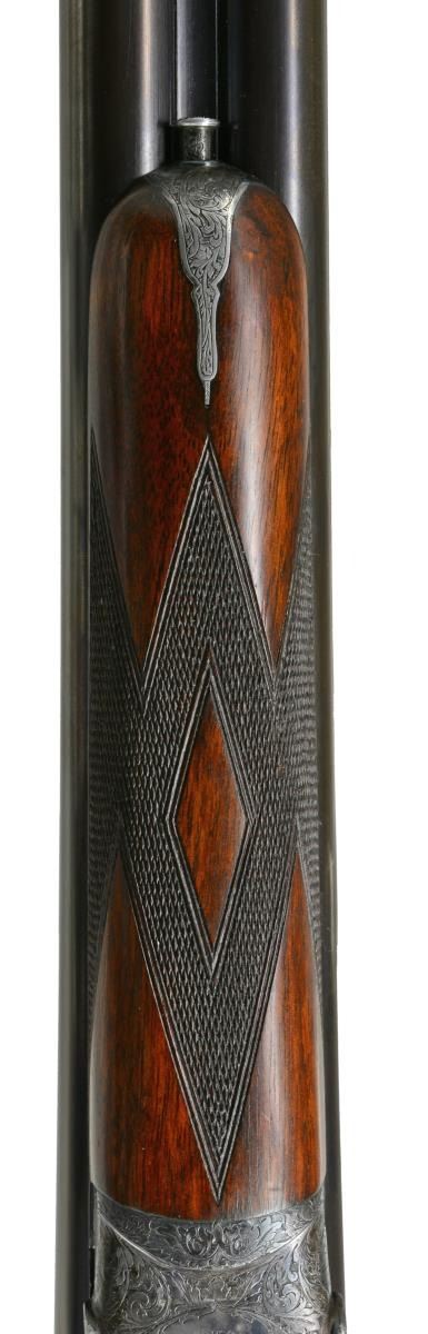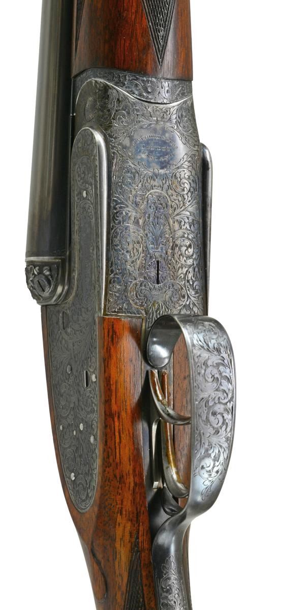JAMES PURDEY HEAVY PROOF SIDELOCK EJECTOR GAME GUN IN SUPERB ORIGINAL CONDITION WITH CASE. Cal. 12 Ga., 2 3/4". S# 26638. (1956). Bbls. 27" Chopper lump fitted with very narrow matted game rib are engraved "J Purdey & Sons." "Audley House South Audley Street, London. England." on tops. Bbl. flats are stamped with London nitro proofs for 2 3/4". Bottoms of bbls. are stamped with serial numbers, and barrel makers initials "G.W" (George Wood). Tube numbers "65377" and "65378" are on loop. Casehardened Beesley patent self opening sidelock action features automatic safety (SAFE inlaid in gold), bushed strikers, raised rib tumbler end cocking indicators, and double triggers. Action and lockplates are engraved with near full coverage large open broad shaded scroll with strap work highlights, as originated by, and in this case executed by, the revered Harry Kell (per factory letter). "J. Purdey & Sons" is on the front part of each lockplate, as well as on bottom of action over "London" "England". Fences are finely full relief carved in oak leaf and acorn motif, as usually found in this "extra finish" pattern. Blued top lever and trigger guard are also engraved with acanthus scroll. Serial number is on trigger guard tang. Dense, nicely marbled, and strikingly stump/ fiddle figured European walnut straight grip buttstock measures 14 1/8" over black leather covered pad. Stock features usual drop points and point pattern checkering at grip. Individual gold initials "M V B" are inlet on toeline. Factory records indicate this gun was made for Mrs. Sherburn M. Becker. Matching splinter ejector forend has Anson release. Actioners initials "M.T" (Maurice Timbers) are on iron. UNATTACHED ACCESSORIES: Makers tan leather motor case with stitched leather corners is embossed "M. V. B." on lid. Interior is lined in purple cloth, and has gold embossed black leather Purdey label along with charge card for this particular gun in lid. Case contains Purdey marked square oil bottle, two horn handled striker keys, pull-through 12 ga. cleaning kit, two piece rosewood and brass cleaning rod with mops and jag, and a 1929 dated Purdey Guns instruction booklet. Bore diameters: left -.731, right - .731. Restriction: left - .025 (mod), right - .008 (IC). Minimum wall thickness: left - .035, right - .034. DAH: 2 7/16". DAC: 1 9/16". No cast. WEIGHT: 6 lbs. 10 oz. CONDITION: extra fine, mostly original. Bbls. have over 95% what appears to be original blue, thinned a bit on sides, which is possibly an old reblue. Action retains approx. 85-90% original casehardening color, pleasingly silvered on fences and beads. Lockplates have nearly all of their original color. Hinge pin retains most of its temper blue, as do lock pin heads and other pins. Back portion of safety is silvered. Forend iron retains most of its original blue. Forend tip is considerably silvered. Trigger guard has blue thinning on bow and silvering at grip. Stocks retain over 90% original "slackum" finish thinning on high edges with a number of light marks and dings. Checkering is somewhat worn and dark. Pad appears to be original, slightly flattened at heel. Bores are excellent, sharp and shiny throughout, with little evidence of dents or repairs. Action is tight. Bbls. are on face. Ejectors are in time. Drop is down a bit, iron just beginning to contact bottom of action. Case leather is still light in color. Straps and handle are good. Interior has a few rubs and compressions. Accessories are fine. A truly exceptional, good handling Purdey game gun; to have this gun built today would cost well over $150,000.00. (20-917/MGM73). CURIO. $30,000-40,000.