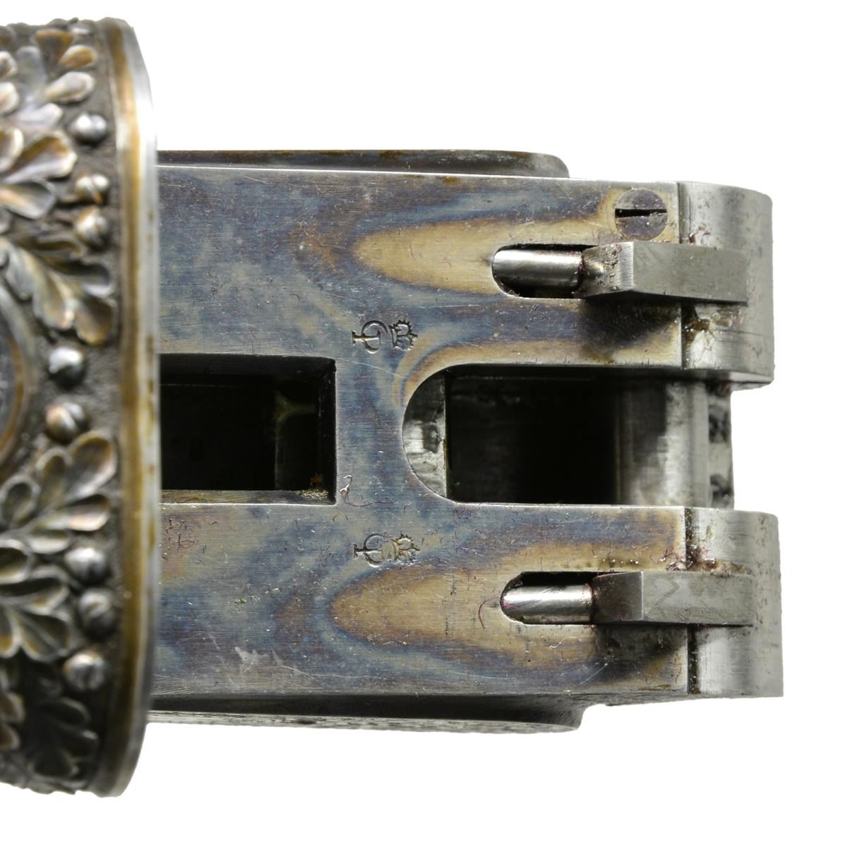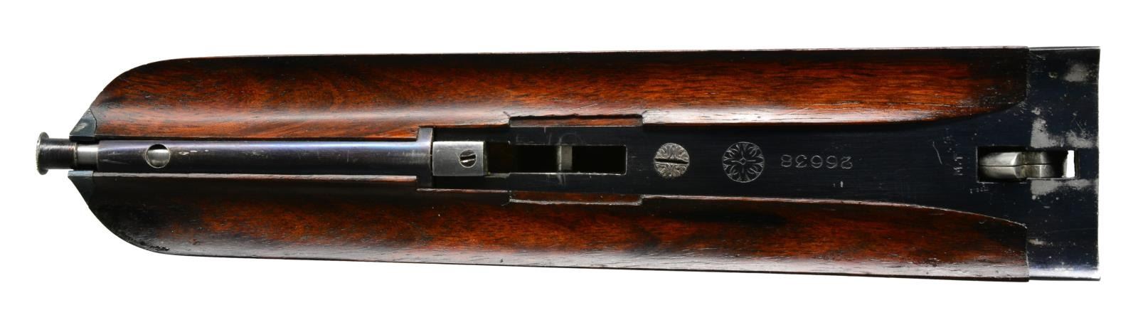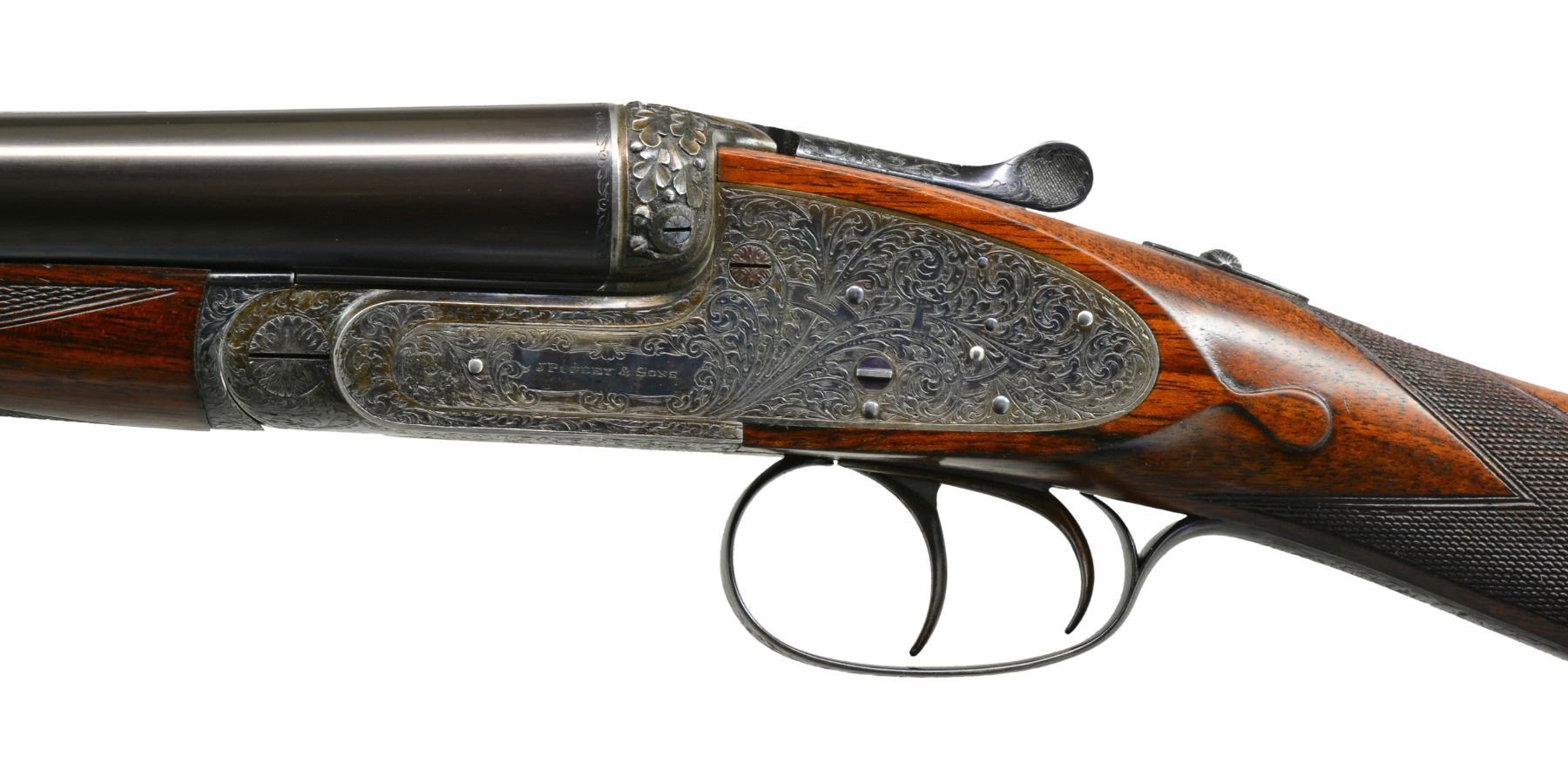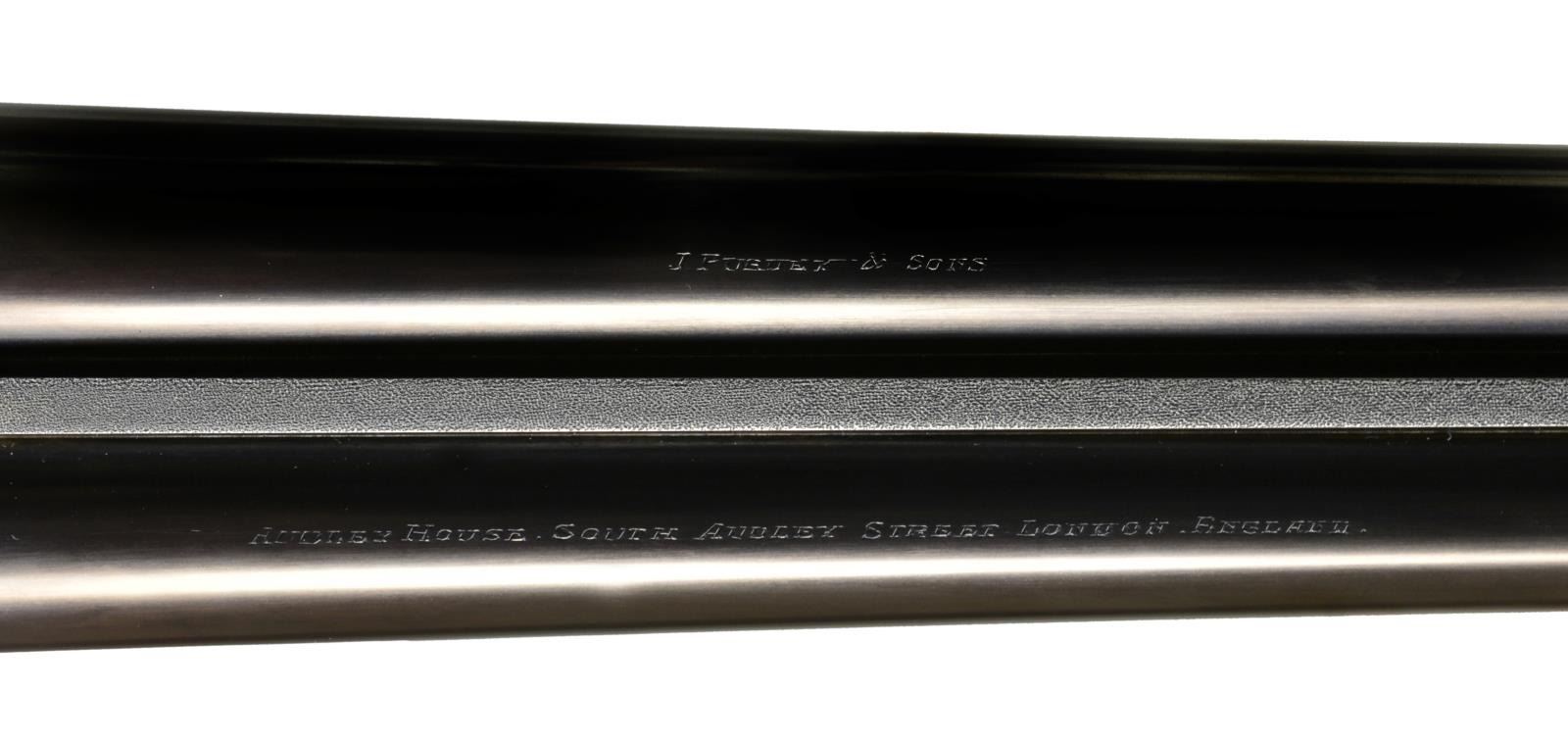 JAMES PURDEY HEAVY PROOF SIDELOCK EJECTOR GAME GUN IN SUPERB ORIGINAL CONDITION WITH CASE. Cal. 12 Ga., 2 3/4". S# 26638. (1956). Bbls. 27" Chopper lump fitted with very narrow matted game rib are engraved "J Purdey & Sons." "Audley House South Audley Street, London. England." on tops. Bbl. flats are stamped with London nitro proofs for 2 3/4". Bottoms of bbls. are stamped with serial numbers, and barrel makers initials "G.W" (George Wood). Tube numbers "65377" and "65378" are on loop. Casehardened Beesley patent self opening sidelock action features automatic safety (SAFE inlaid in gold), bushed strikers, raised rib tumbler end cocking indicators, and double triggers. Action and lockplates are engraved with near full coverage large open broad shaded scroll with strap work highlights, as originated by, and in this case executed by, the revered Harry Kell (per factory letter). "J. Purdey & Sons" is on the front part of each lockplate, as well as on bottom of action over "London" "England". Fences are finely full relief carved in oak leaf and acorn motif, as usually found in this "extra finish" pattern. Blued top lever and trigger guard are also engraved with acanthus scroll. Serial number is on trigger guard tang. Dense, nicely marbled, and strikingly stump/ fiddle figured European walnut straight grip buttstock measures 14 1/8" over black leather covered pad. Stock features usual drop points and point pattern checkering at grip. Individual gold initials "M V B" are inlet on toeline. Factory records indicate this gun was made for Mrs. Sherburn M. Becker. Matching splinter ejector forend has Anson release. Actioners initials "M.T" (Maurice Timbers) are on iron. UNATTACHED ACCESSORIES: Makers tan leather motor case with stitched leather corners is embossed "M. V. B." on lid. Interior is lined in purple cloth, and has gold embossed black leather Purdey label along with charge card for this particular gun in lid. Case contains Purdey marked square oil bottle, two horn handled striker keys, pull-through 12 ga. cleaning kit, two piece rosewood and brass cleaning rod with mops and jag, and a 1929 dated Purdey Guns instruction booklet. Bore diameters: left -.731, right - .731. Restriction: left - .025 (mod), right - .008 (IC). Minimum wall thickness: left - .035, right - .034. DAH: 2 7/16". DAC: 1 9/16". No cast. WEIGHT: 6 lbs. 10 oz. CONDITION: extra fine, mostly original. Bbls. have over 95% what appears to be original blue, thinned a bit on sides, which is possibly an old reblue. Action retains approx. 85-90% original casehardening color, pleasingly silvered on fences and beads. Lockplates have nearly all of their original color. Hinge pin retains most of its temper blue, as do lock pin heads and other pins. Back portion of safety is silvered. Forend iron retains most of its original blue. Forend tip is considerably silvered. Trigger guard has blue thinning on bow and silvering at grip. Stocks retain over 90% original "slackum" finish thinning on high edges with a number of light marks and dings. Checkering is somewhat worn and dark. Pad appears to be original, slightly flattened at heel. Bores are excellent, sharp and shiny throughout, with little evidence of dents or repairs. Action is tight. Bbls. are on face. Ejectors are in time. Drop is down a bit, iron just beginning to contact bottom of action. Case leather is still light in color. Straps and handle are good. Interior has a few rubs and compressions. Accessories are fine. A truly exceptional, good handling Purdey game gun; to have this gun built today would cost well over $150,000.00. (20-917/MGM73). CURIO. $30,000-40,000.