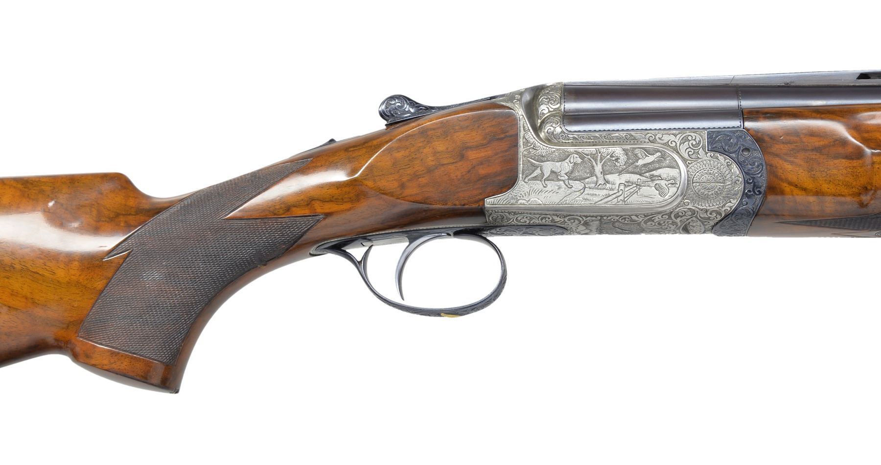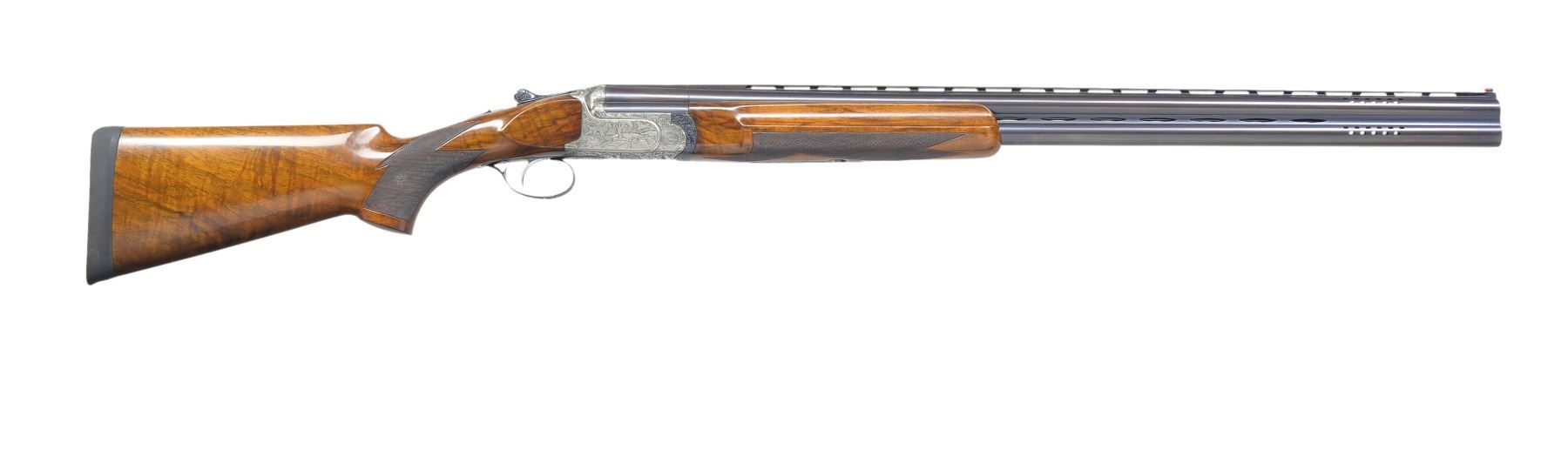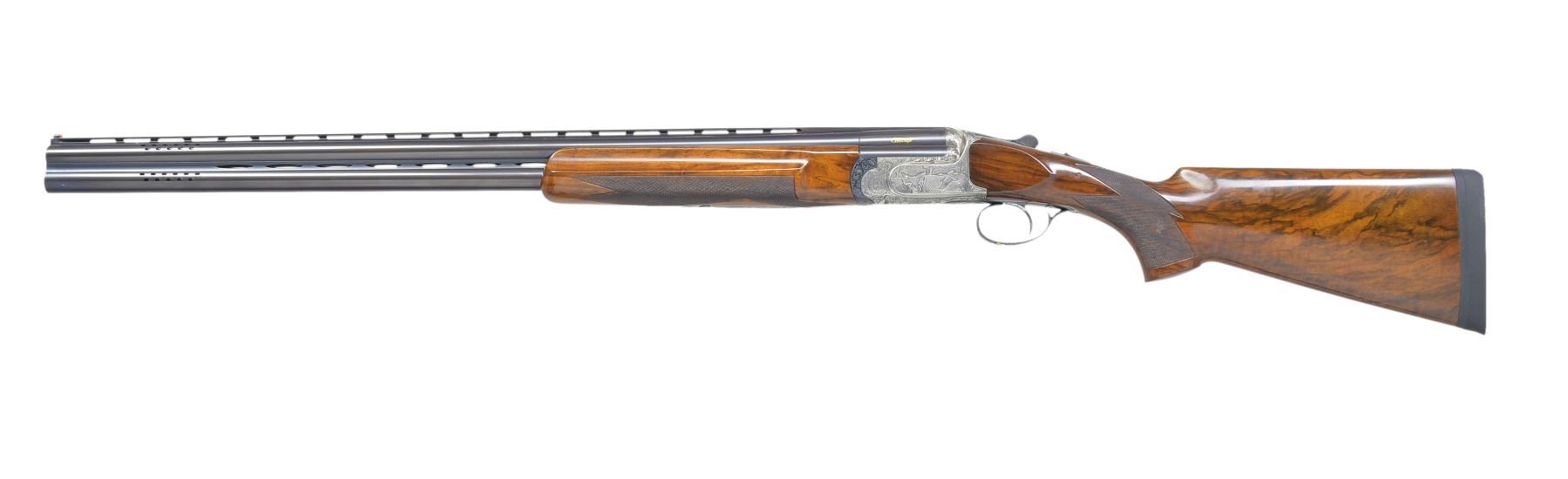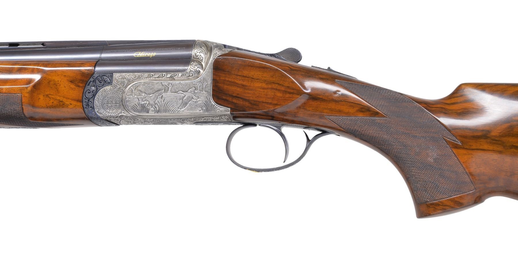 TARGET GUN WITH CHOKE TUBES. Cal. 12 Ga. S# 37127. Bbls. 28 3/8" Mono-bloc w/ Perazzi name & address on left side of mono-bloc along w/ "Mirage" inlaid in gold, feature slightly raised matted, ventilated rib, ventilated side ribs, ported bbls., & choke tubes. Bottom of mono-bloc is stamped w/ 1971 Italian nitro proofs. Coin finished action w/ removable MX 8 type trigger group is near fully engraved w/ shaded scroll surrounding game scenes w/ 2 ducks over marsh on left side & setter pointing 2 pheasant on right. 2 Grouse (?) are on bottom of action. Single beaded trigger guard has relief gold inlaid pigeon on bow. Well marbled & figured European walnut pistol grip buttstock measures 14" over black KICK-EEZ pad. Point pattern checkering is at grip. Matching semi beavertail forend has Deeley type release. DAH: 1 11/16". DAC: 1 7/16". WEIGHT: 7 lbs. 10 oz. UNATTACHED ACCESSORIES: 4 Briley thin wall choke tubes (2 in gun) giving a total of 6, w/ installation tool. CONDITION: fine as custom refinished. Bbls. retain nearly all of a quality reblack. Action repolished after engraving. Other metal parts have nearly all of their reblue. Renewed varnish finish on stocks shows some light marks & a few dents. Checkering lightly worn. Bright shiny bores. Mechanically fine. (20-926/MGM107). MODERN. $3,500-4,500.