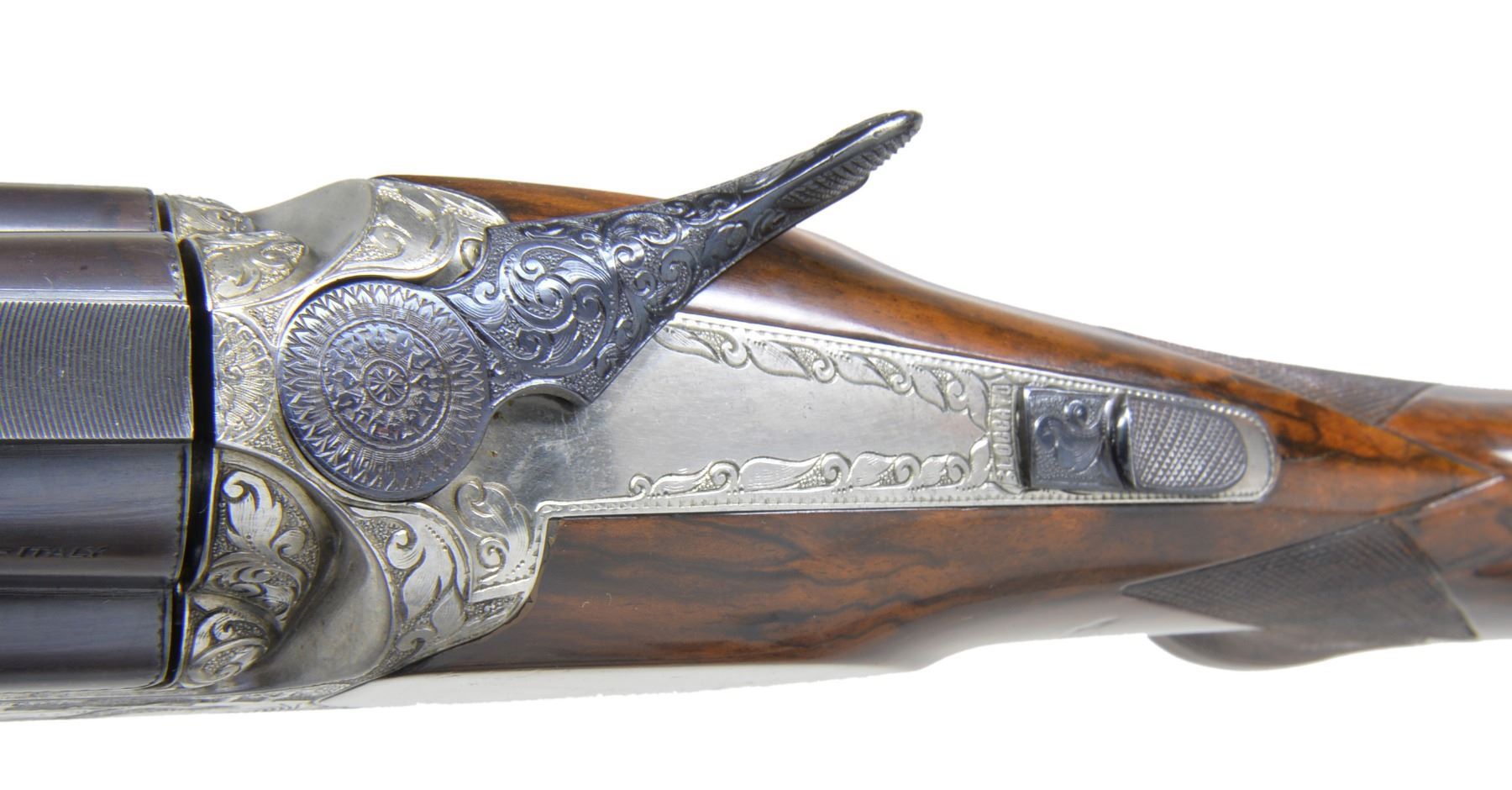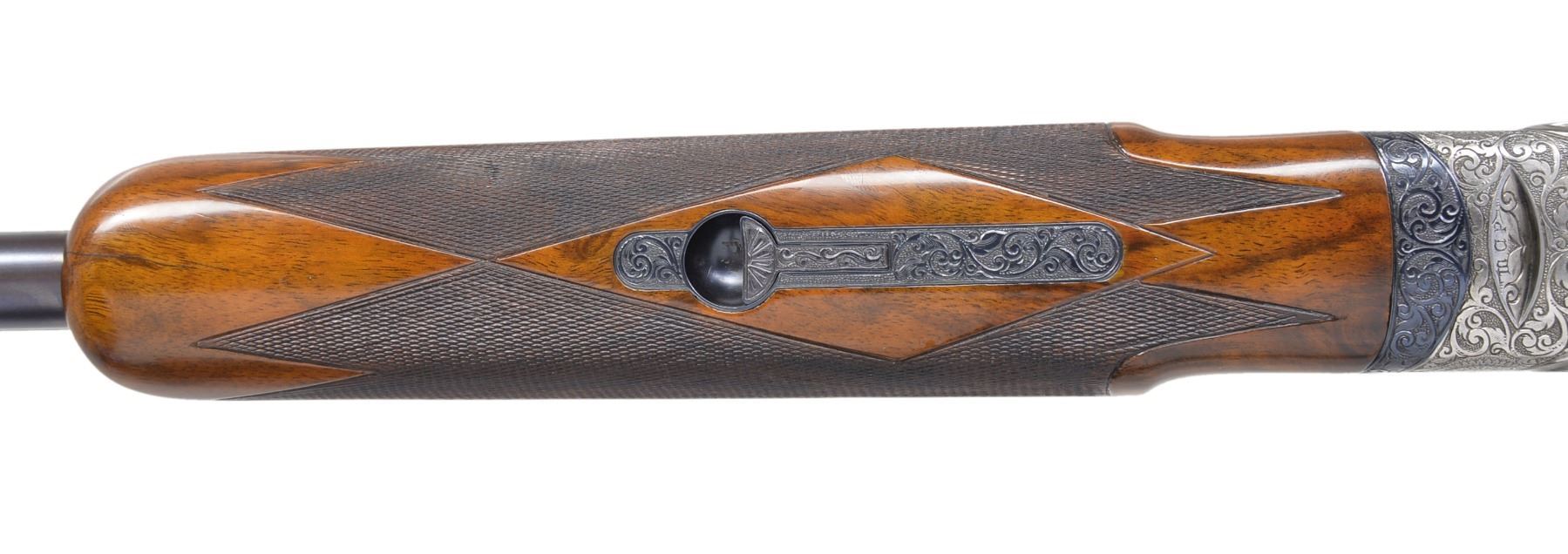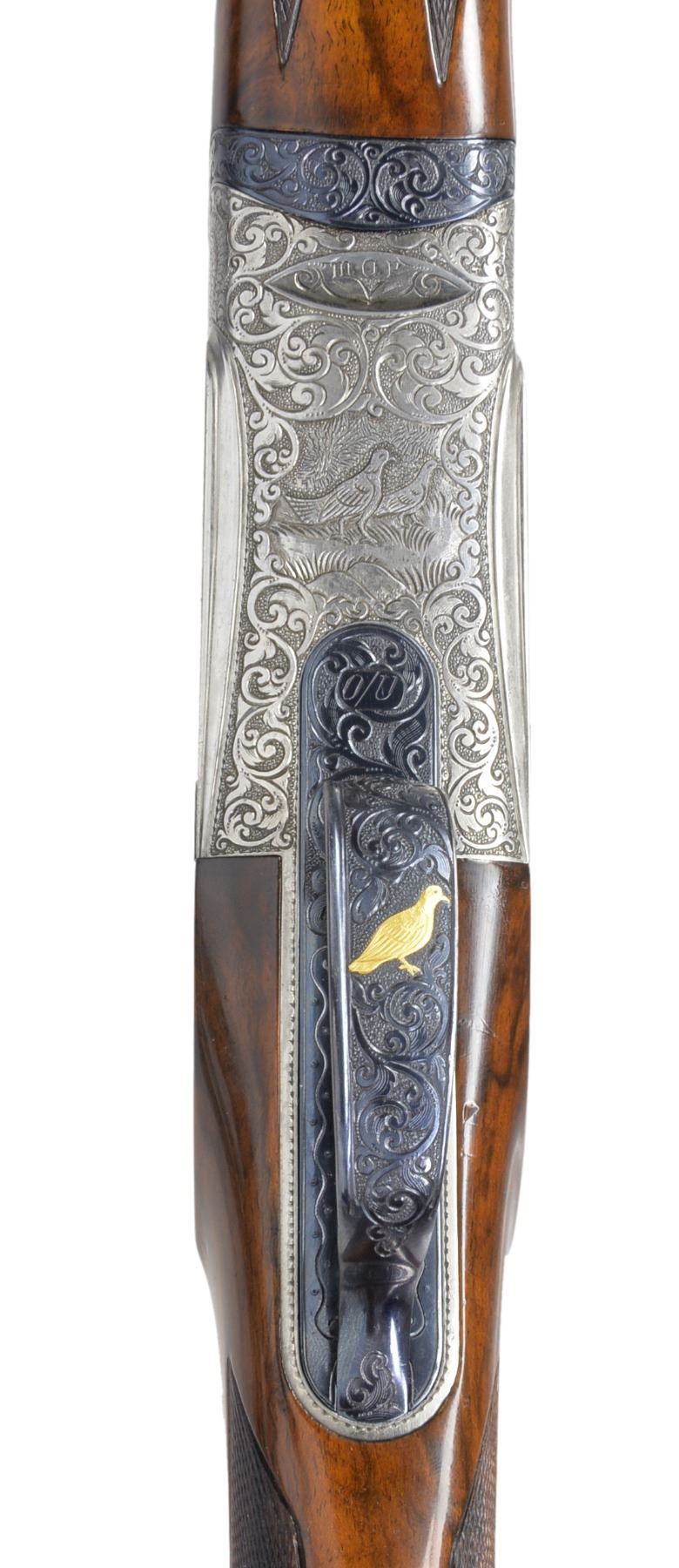 TARGET GUN WITH CHOKE TUBES. Cal. 12 Ga. S# 37127. Bbls. 28 3/8" Mono-bloc w/ Perazzi name & address on left side of mono-bloc along w/ "Mirage" inlaid in gold, feature slightly raised matted, ventilated rib, ventilated side ribs, ported bbls., & choke tubes. Bottom of mono-bloc is stamped w/ 1971 Italian nitro proofs. Coin finished action w/ removable MX 8 type trigger group is near fully engraved w/ shaded scroll surrounding game scenes w/ 2 ducks over marsh on left side & setter pointing 2 pheasant on right. 2 Grouse (?) are on bottom of action. Single beaded trigger guard has relief gold inlaid pigeon on bow. Well marbled & figured European walnut pistol grip buttstock measures 14" over black KICK-EEZ pad. Point pattern checkering is at grip. Matching semi beavertail forend has Deeley type release. DAH: 1 11/16". DAC: 1 7/16". WEIGHT: 7 lbs. 10 oz. UNATTACHED ACCESSORIES: 4 Briley thin wall choke tubes (2 in gun) giving a total of 6, w/ installation tool. CONDITION: fine as custom refinished. Bbls. retain nearly all of a quality reblack. Action repolished after engraving. Other metal parts have nearly all of their reblue. Renewed varnish finish on stocks shows some light marks & a few dents. Checkering lightly worn. Bright shiny bores. Mechanically fine. (20-926/MGM107). MODERN. $3,500-4,500.