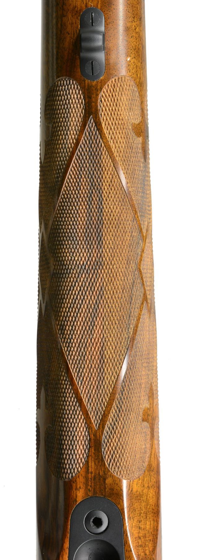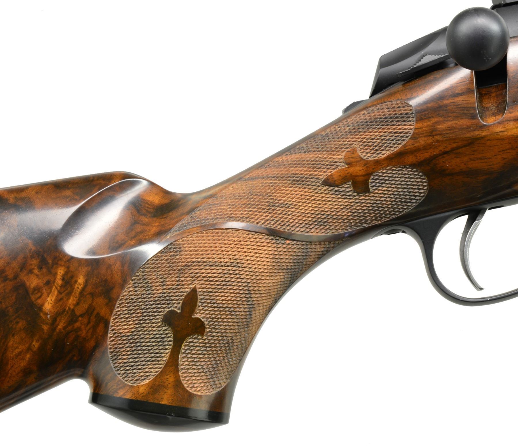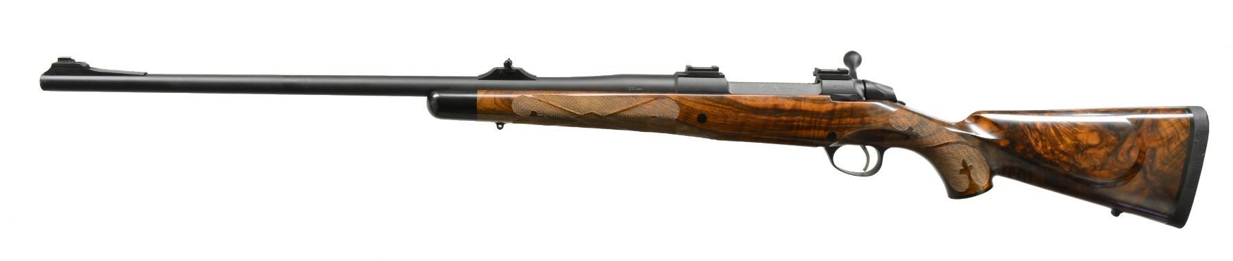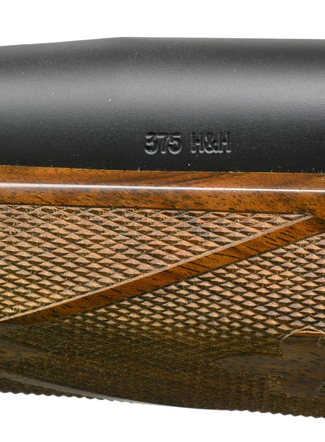 "AFRICAN" WITH TRAVEL CASE AND OTHER ACCESSORIES. Cal. 375 H&H. S# 687470. Bbl. 24" lightweight fitted with ERA rear sight block holding elevation adjustable express rear sight and front ramp with white bead. Caliber is marked at left rear. Sako 85 action fitted with QD scope mounts and has safety at right side of bolt shroud. Bottom metal holds removable magazine. All metal parts are black coated. Pistol grip stock of exhibition quality, wonderfully marbled and figured Turkish walnut, laminated (for stability) measures 13 7/8" over black Decelerator pad and features American comb, swept right hand cheekpiece, palm swell, skeletonized ebony grip cap, ebony forend tip, recoil pins, and fancy pattern fleur-di-lis checkering with panels separated by ribbons at grip and around forend. WEIGHT: 8 lbs. 2 oz. UNATTACHED ACCESSORIES: tan ABS Pelican 1750 case with green Kilimanjaro stencil on top is foam lined, and contains zippered rifle case embroidered with Kilimanjaro logo, Cobra type Kilimanjaro leather sling, jacket patch, and a black pouch containing muzzle brake which attaches with removal of ring at muzzle, QD scope rings and a drift pin. Rifle was donated to "SCI" silent auction and pertinent information is also in case. CONDITION: nearly as new, appears unfired since proof with only a few scattered handling and assembly marks in all surfaces. Mechanically crisp. Case is new. This model Kilimanjaro rifle "always custom made" retails at over $17,000.00. (20-617/MGM87). MODERN. $10,000-16,000.