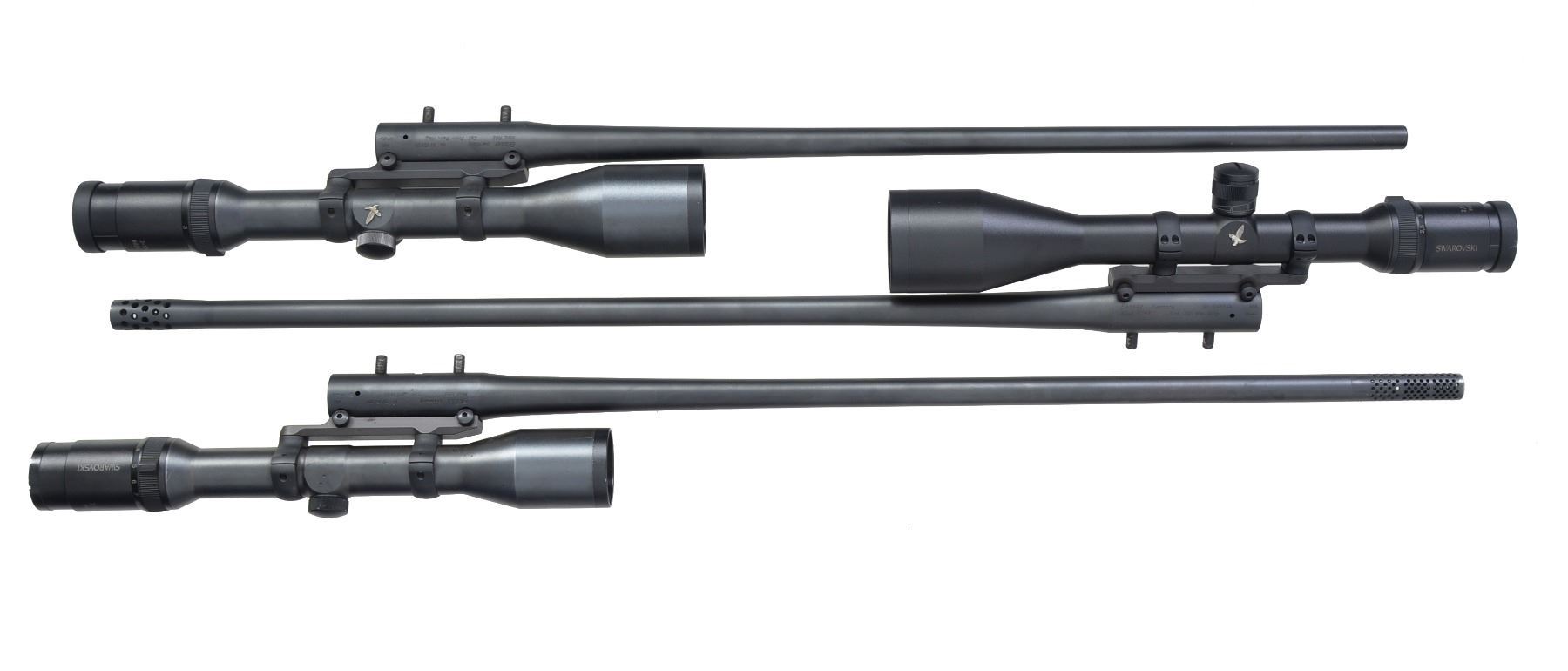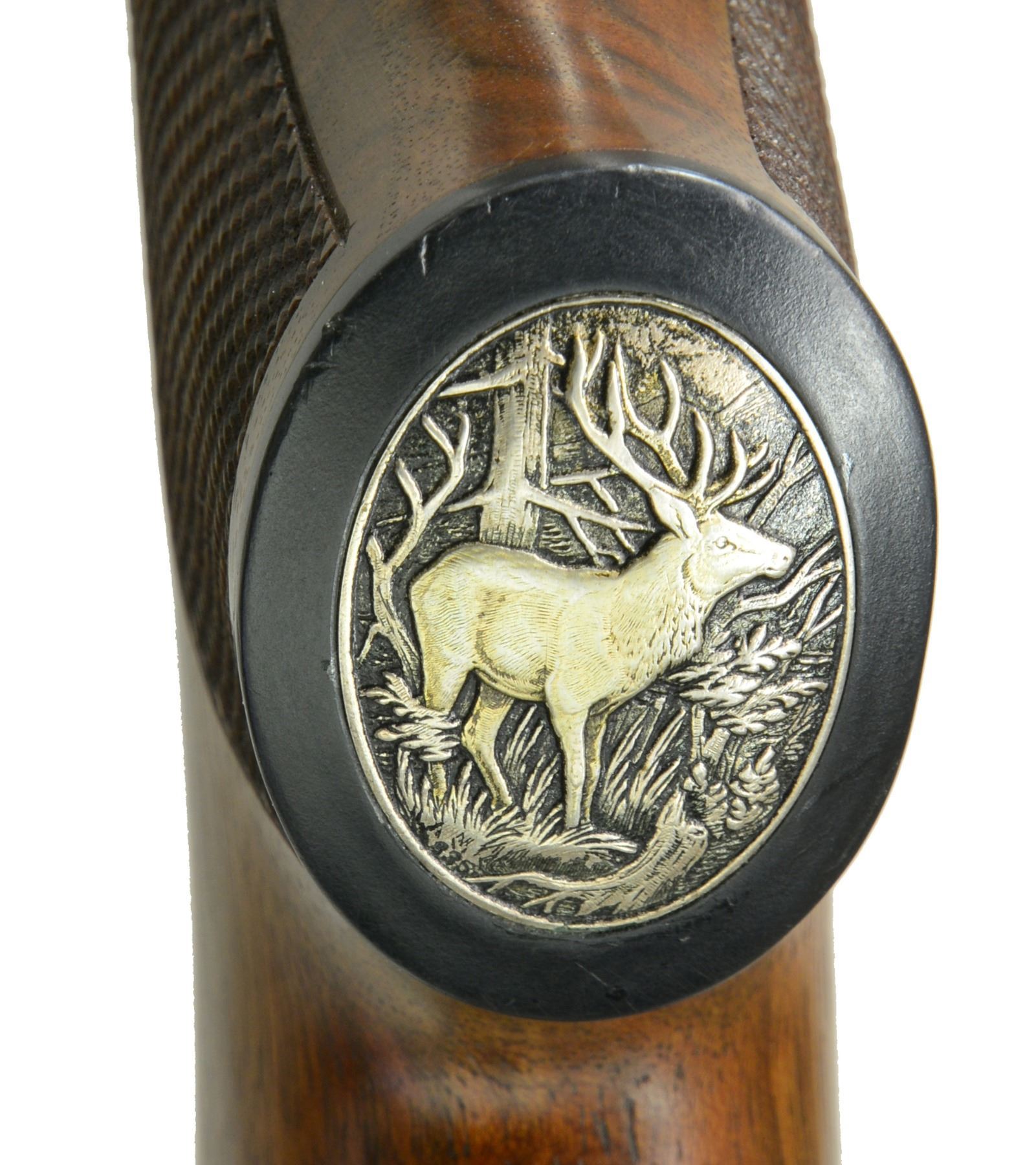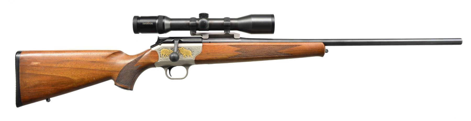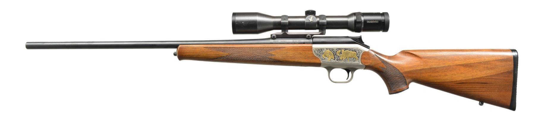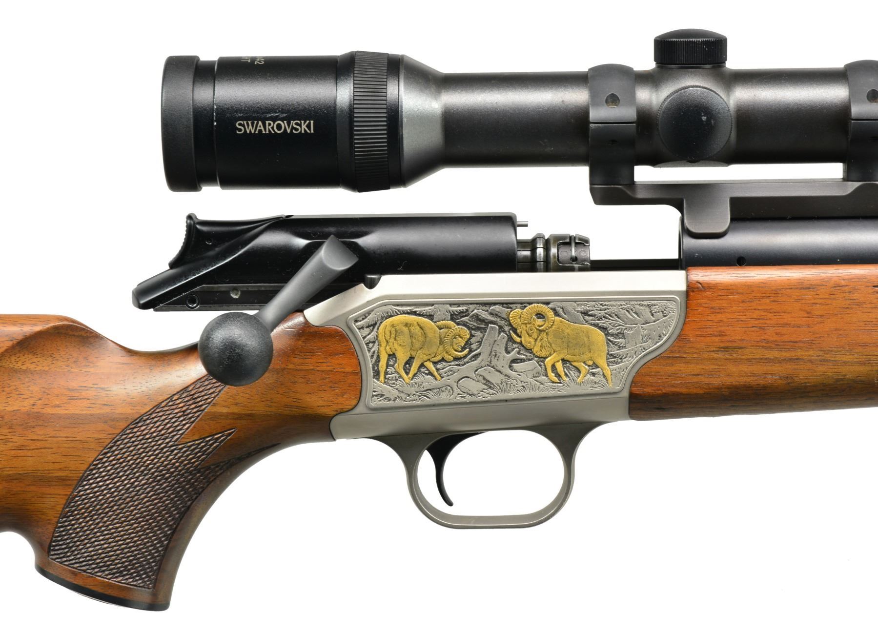 PLATES, THREE EXTRA BARRELS, ALL WITH SWAROVSKI SCOPES. Cal. .300 Win Mag, .338 Win Mag., 7mm Rem Mag, and .375 H&H mag. S# 2409. .300 WIN MAG: 24" Bbl. w/out sights is fitted w/ Blaser low scope mount holding Swarovski Habicht 2.5 " 10 X 30mm scope w/ 3 post & crosshair reticle. .375 H&H BBL.: 26 1/2" w/ muzzle brake & Swarovski 2.5 " 10 30mm w/ crosshair & three post reticle. 26 1/2".338 WIN MAG BBL.: w/ muzzle brake holding 2.5 " 10 Swarovski tall elevation turret 3 post & crosshair reticle. 24"7MM REM MAG BBL.: w/ 3 " 12 X scope w/ same reticle. Nickel finished straight pull action is fitted w/ relief cast side plates depicting gold washed moose & bear on left & big horn rams on right. Plain European walnut capped pistol grip buttstock measures 14" over black Pachmayr rifle pad. Grip cap has central medallion depicting a bull elk. Matching long forend has schnabeled tip. UNATTACHED ACCESSORIES: three bbl. & scope sets, as described, in aluminum Blaser case. CONDITION: fine, showing light use, w/ only a few minor marks in black parts. Coin finish of action shows considerable bright silver on left side. Gold wash on left side plate considerably thinned. There is some thinning of gold on right. A number of light marks in original stock finish. Scopes are very fine w/ some rubs. Scope of .375 Mag bbl. has heavy dent in front of front ring & w/ some scattered pitting. All are optically clear. Sharp shiny bores, smooth action. (20-1165/MGM163). MODERN. $8,000-12,000.