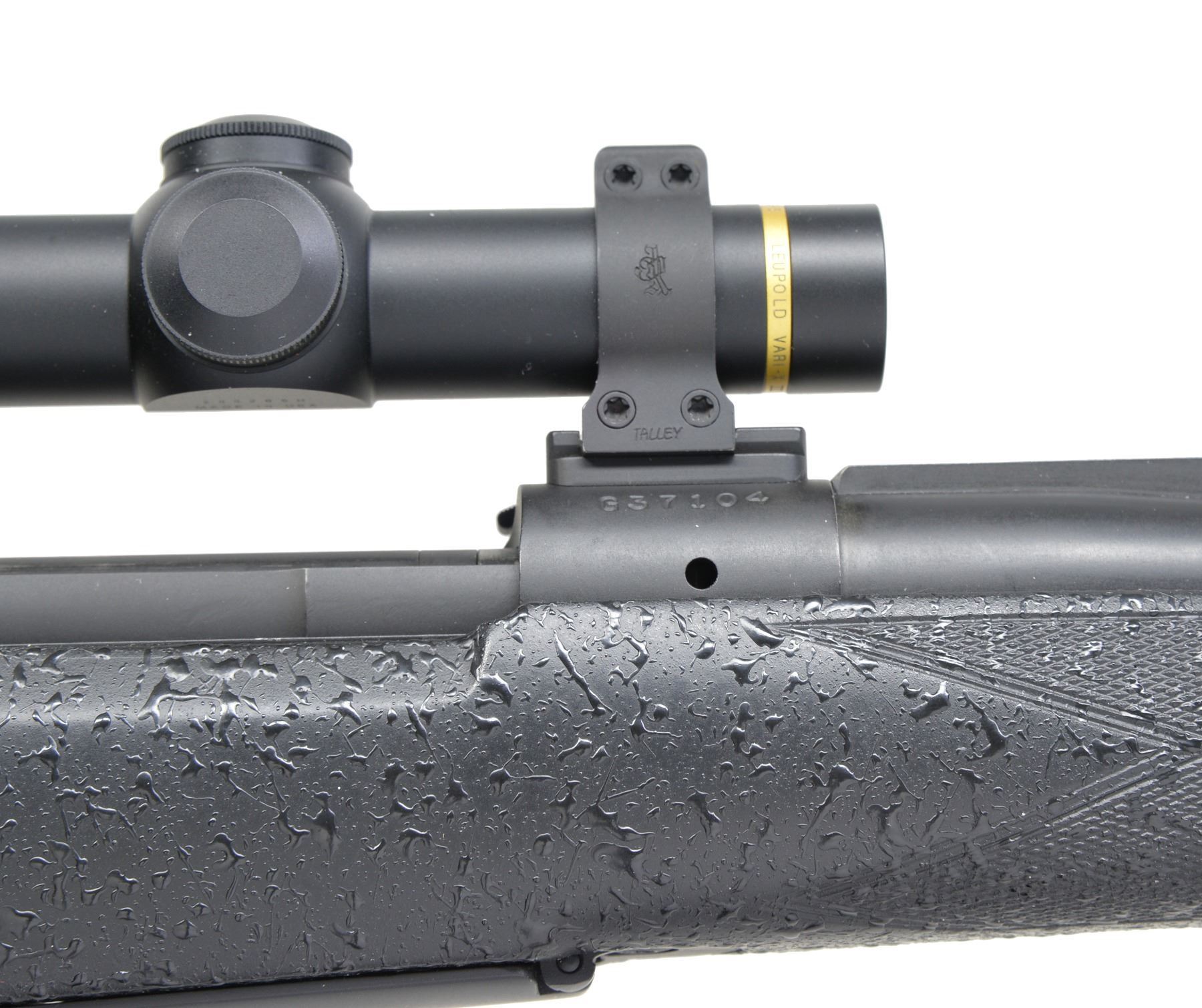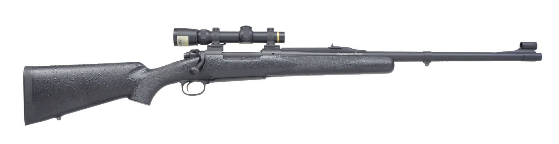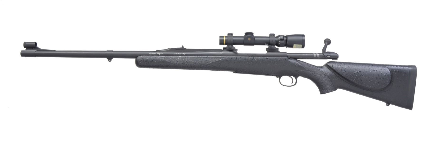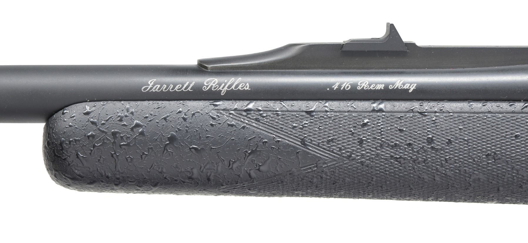 Cal. 416 Rem. Mag. S# G37104. Bbl. 23" w/ bbl. band ramp mounted hooded bead front sight & quarter rib mounted fixed V notch rear sight. Leupold VARI-X III 1.5-5 matte finished scope w/ duplex reticle on QD mts. Win. Model 70 Classic long extractor action. Matte black coated metal finish. Fiberglass straight comb cheekpiece stock w/ checkering & black texture finish. LOP: 13 3/8" over solid black Old English pad. UNATTACHED ACCESSORIES: original Jarrett marked aluminum case w/ nylon cover. CONDITION: near excellent retaining over 99% original finish. Near excellent bore. Scope has clear optics. (19-5627/DS). MODERN. $5,000-7,000.