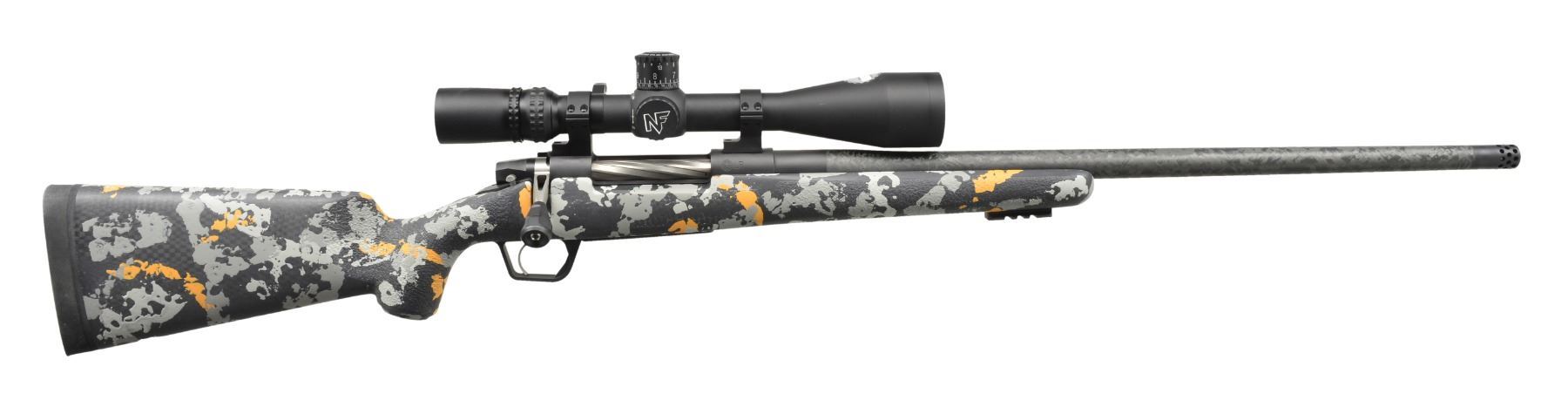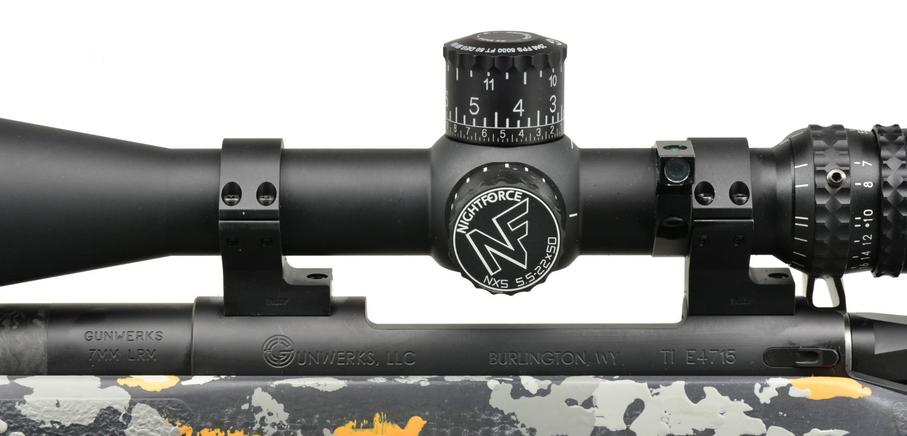1000 LONG RANGE LIGHTWEIGHT HUNTING RIFLE WITH TITANIUM ACTION, CARBON BARREL, NIGHTFORCE SCOPE, AND G 7 RANGE FINDER IN CASE. Cal. 7 mm LRM. S# E4715. The ultimate for the long range hunter. This rifle features 25" carbon fiber wrapped stainless steel bbl. fitted w/ muzzle brake. Lightweight titanium action has one piece machined bolt w/ safety at right side. Marked "Gunwerks, LLC BURLINGTON, WY TI E4715" on left side. Right side is marked "G L R". Lightweight bottom metal combines a special bedding system for extreme accuracy. Carbon fiber stock is finished in mountain camouflage gray & orange & measures 13 3/4" over black Decelerator pad. Bottom of forend has slotted rail for attachment of bi-pod (not included). Rifle is mounted w/ Nightforce NXS 5.5 " 22X scope w/ ranging reticle & spirit level. This scope is part of the LR shooting system package. Scope has been custom calibrated & includes the G 7 BR 2 ballistic range finder which takes into account range, temperature, atmospheric pressure & wind for setting reticle of scope. WEIGHT: 8 lbs. 14 oz. UNATTACHED ACCESSORIES: entire package is housed in Pelican type plastic case marked "Gunwerks" containing muzzle cap to replace muzzle brake & other parts of the system. Also included is a CD entitled "Long Range Pursuit", catalogs & shipping invoice. 4 Boxes of Gunwerks hand crafted 7mm LRM ammo w/ 180 grain hybrid bullets. CONDITION: exceptionally fine, very close to "as new" w/ evidence of having only been fired a few times. Scope is excellent. Case is new. (20-618/MGM88). MODERN. $11,000-15,000.