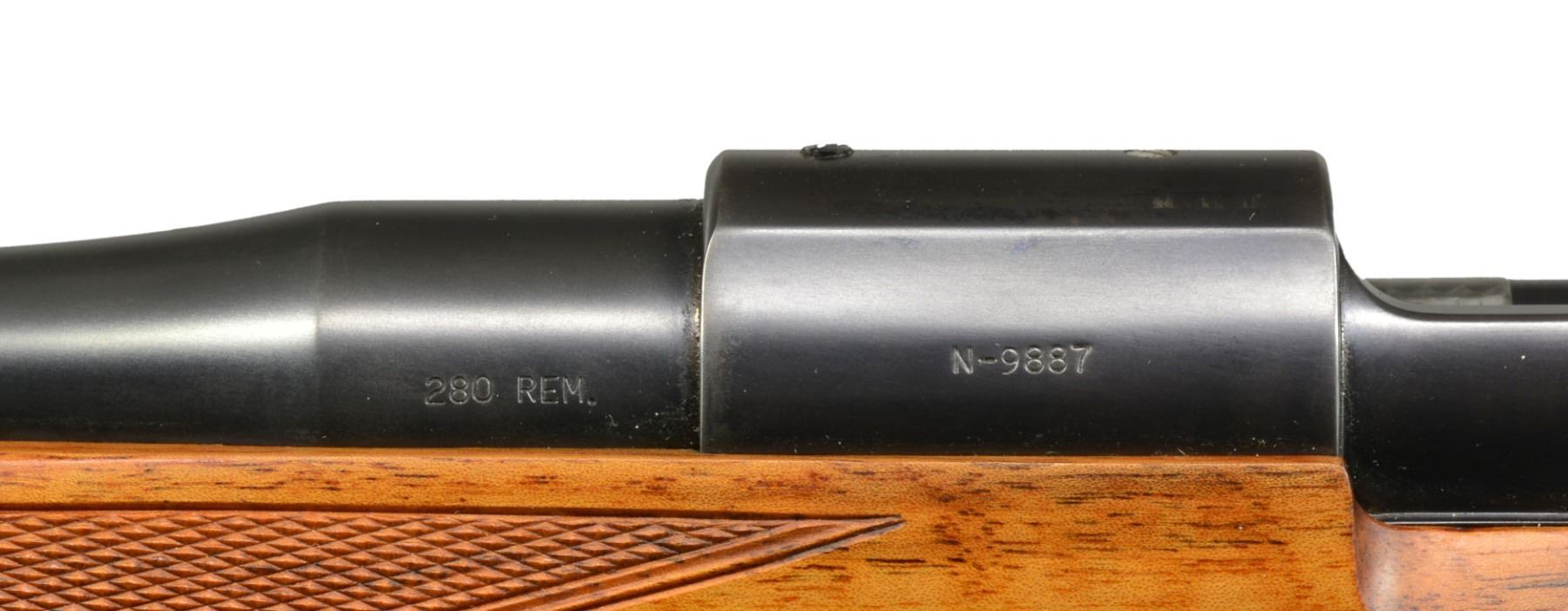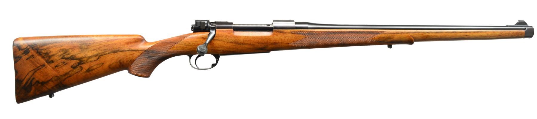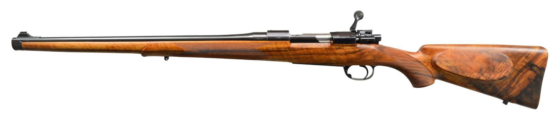 INSPIRED BY TYPE S OBERNDORF MAUSER STOCKED BY DALE GOENS AND METAL WORK BY RON LAMPERT. Cal. 280 Rem. S# N-9887. Bbl. 20" lightweight rnd., fitted w/ WILLIAMS "Shorty" ramp, engraved "Ron Lampert - Dale W. Goens" on top. Caliber is marked at left rear. 98 Large ring action has had sides of receiver ring slimmed & shaped leaving an original diameter boss at top. Side wall is slimmed & thinned to reduce weight & give a more streamlined appearance. Bridge has been lowered. Engine turned bolt is fitted w/ finely shaped Model 70 style, swept low bolt handle w/ pear shaped knob having 4 checkered panels. Bolt shroud is fitted w/ Model 70 type safety & bolt stop has custom filed & checkered thumbpiece. A commercial trigger has been installed. Custom steel bottom metal has hinged straddle floorplate retained by button in trigger guard bow in Commercial 98 fashion. Stock of superb, wonderfully dark watermarked & well figured European (most likely French) walnut shows a combination of styles; a mix of Oberndorf Type M & S. Stock extends to muzzle w/ schnabeled steel type M cap & also has intermediate type S Schnabel. It measures 13 5/8" over checkered Neidner style buttplate w/ trap. Shadow line right hand cheekpiece is very finely sculpted w/ attractive chamfer to outer edge. Cartridge ejection port chamfer at right side of action is mirrored by similar chamfer on left. Point pattern checkering w/ nicely mullered borders is at grip & forend. Rifle is also fitted w/ skeleton steel grip cap & sling eyes. Workmanship on metal & wood is of the highest order as would be expected from these two master gunsmiths of the Halcyon days of the "60's & "70's. WEIGHT: 6 lbs. 11 oz. CONDITION: extremely fine, as custom finished w/ only some high edge wear on metal surfaces & 1 or 2 minor handling marks on finely oil finished stock. Sharp shiny bore. Action very smooth. A very attractive rifle. (20-526/MGM35). CURIO. $5,000-7,000.