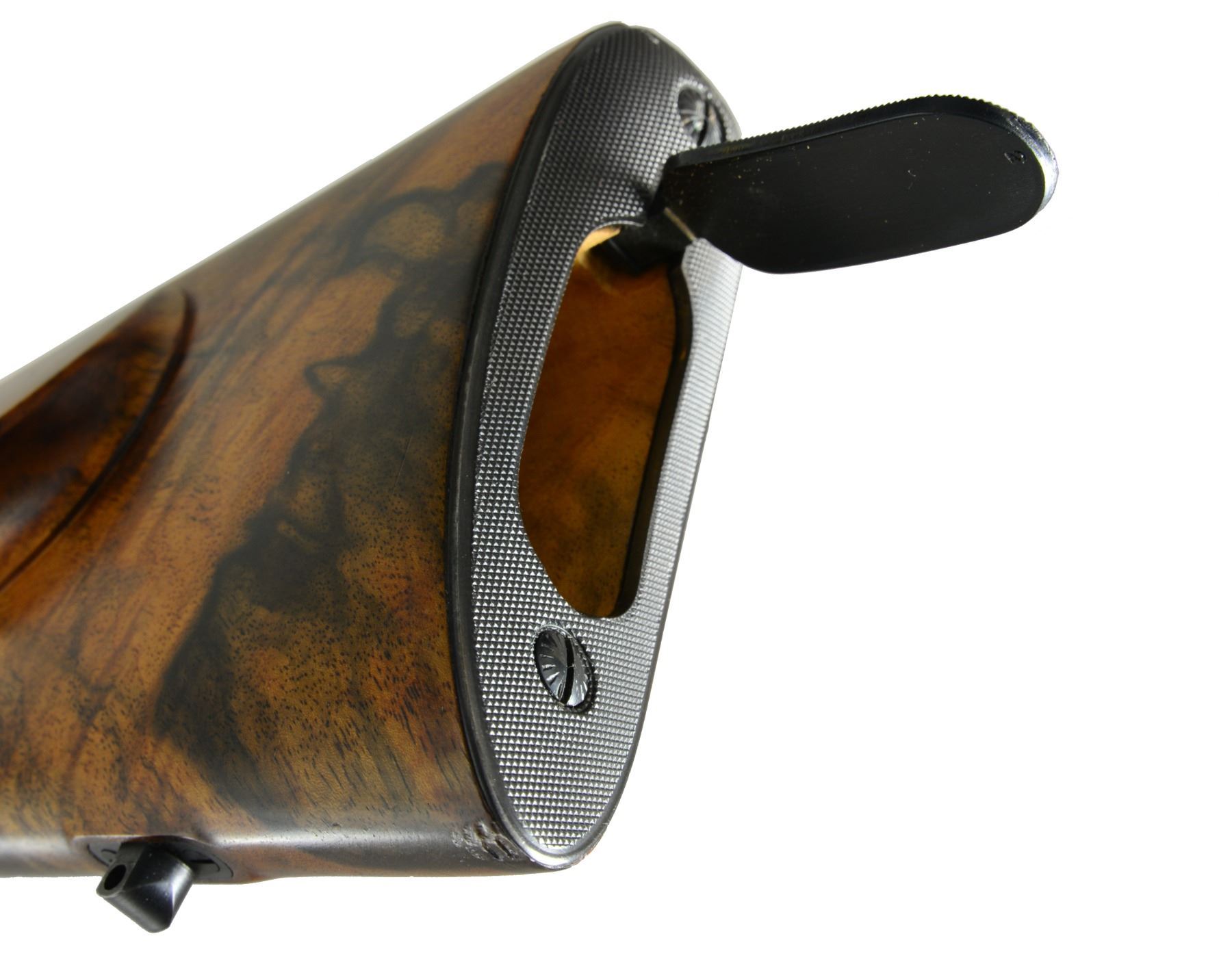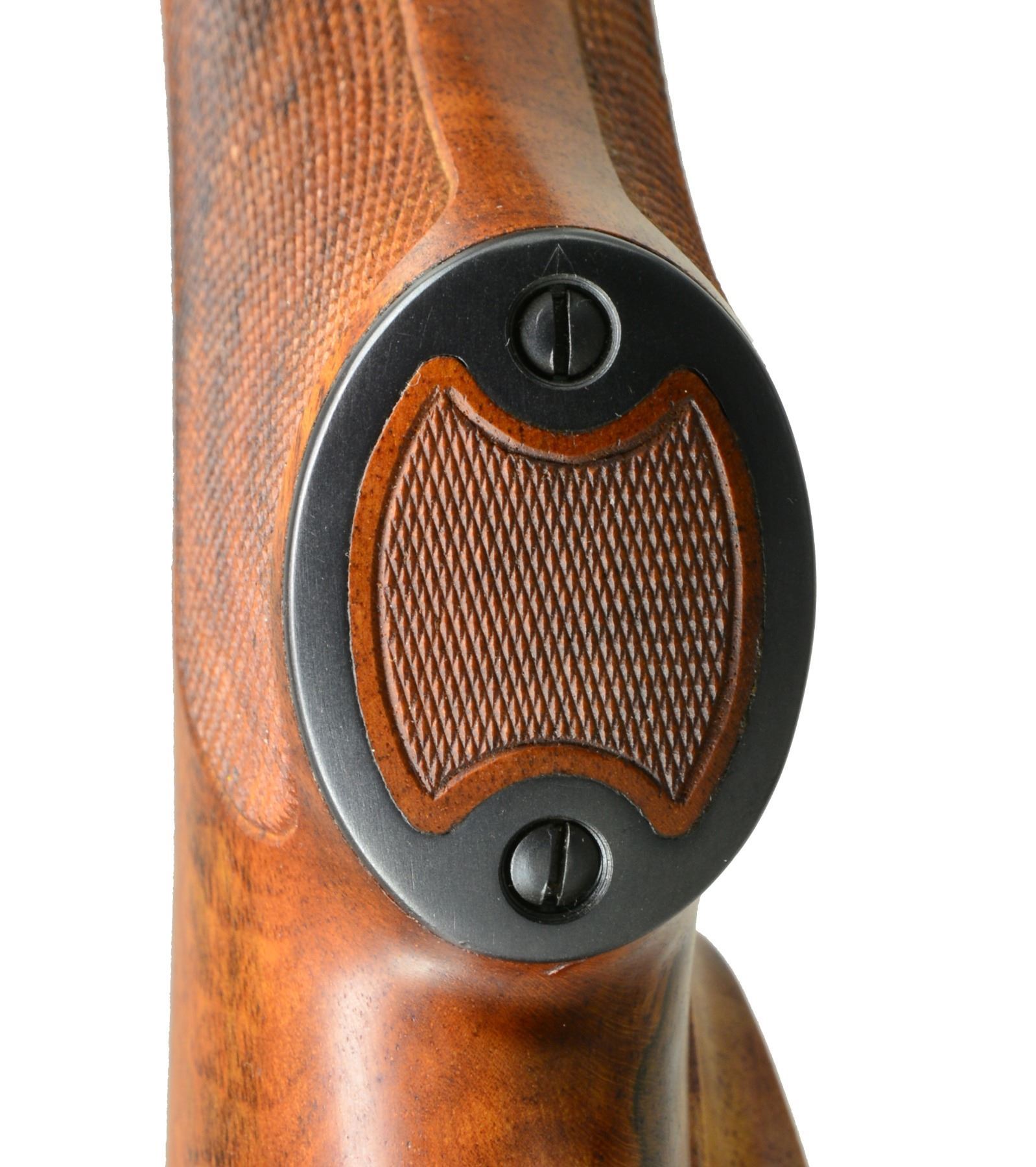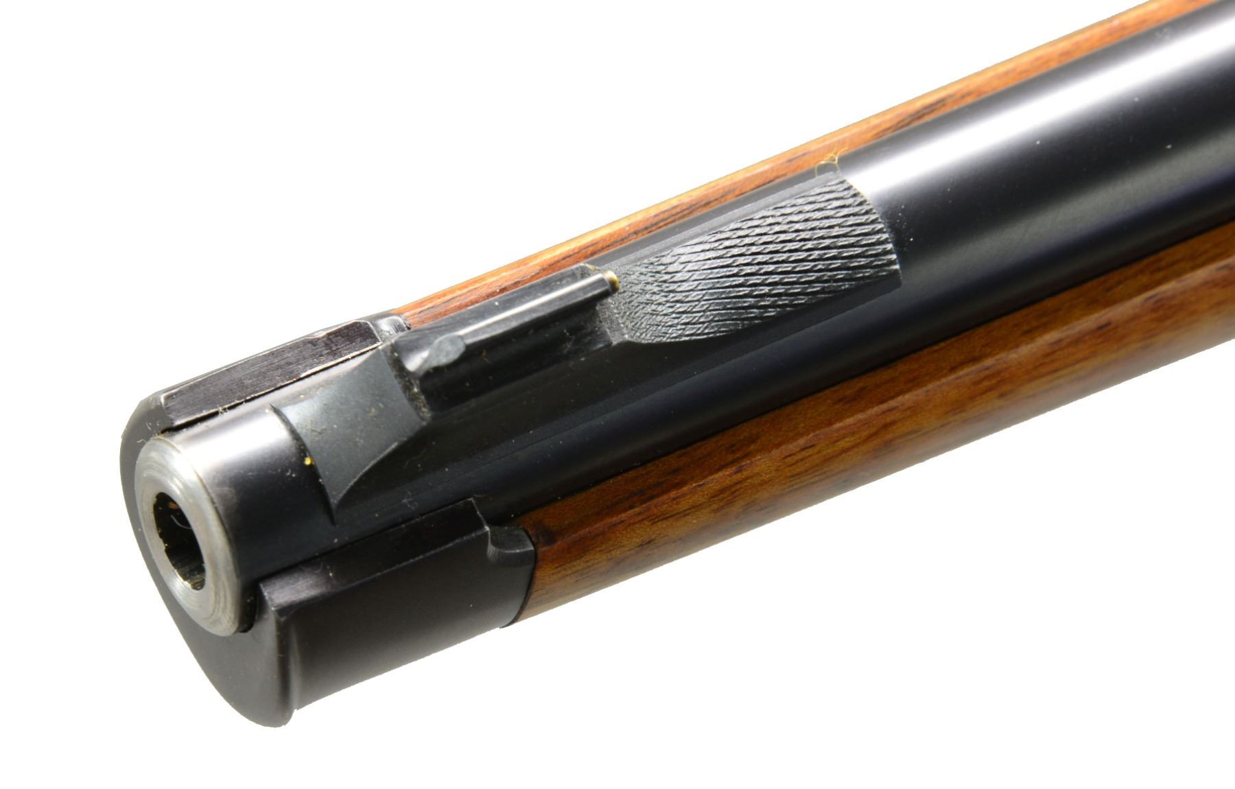 INSPIRED BY TYPE S OBERNDORF MAUSER STOCKED BY DALE GOENS AND METAL WORK BY RON LAMPERT. Cal. 280 Rem. S# N-9887. Bbl. 20" lightweight rnd., fitted w/ WILLIAMS "Shorty" ramp, engraved "Ron Lampert - Dale W. Goens" on top. Caliber is marked at left rear. 98 Large ring action has had sides of receiver ring slimmed & shaped leaving an original diameter boss at top. Side wall is slimmed & thinned to reduce weight & give a more streamlined appearance. Bridge has been lowered. Engine turned bolt is fitted w/ finely shaped Model 70 style, swept low bolt handle w/ pear shaped knob having 4 checkered panels. Bolt shroud is fitted w/ Model 70 type safety & bolt stop has custom filed & checkered thumbpiece. A commercial trigger has been installed. Custom steel bottom metal has hinged straddle floorplate retained by button in trigger guard bow in Commercial 98 fashion. Stock of superb, wonderfully dark watermarked & well figured European (most likely French) walnut shows a combination of styles; a mix of Oberndorf Type M & S. Stock extends to muzzle w/ schnabeled steel type M cap & also has intermediate type S Schnabel. It measures 13 5/8" over checkered Neidner style buttplate w/ trap. Shadow line right hand cheekpiece is very finely sculpted w/ attractive chamfer to outer edge. Cartridge ejection port chamfer at right side of action is mirrored by similar chamfer on left. Point pattern checkering w/ nicely mullered borders is at grip & forend. Rifle is also fitted w/ skeleton steel grip cap & sling eyes. Workmanship on metal & wood is of the highest order as would be expected from these two master gunsmiths of the Halcyon days of the "60's & "70's. WEIGHT: 6 lbs. 11 oz. CONDITION: extremely fine, as custom finished w/ only some high edge wear on metal surfaces & 1 or 2 minor handling marks on finely oil finished stock. Sharp shiny bore. Action very smooth. A very attractive rifle. (20-526/MGM35). CURIO. $5,000-7,000.